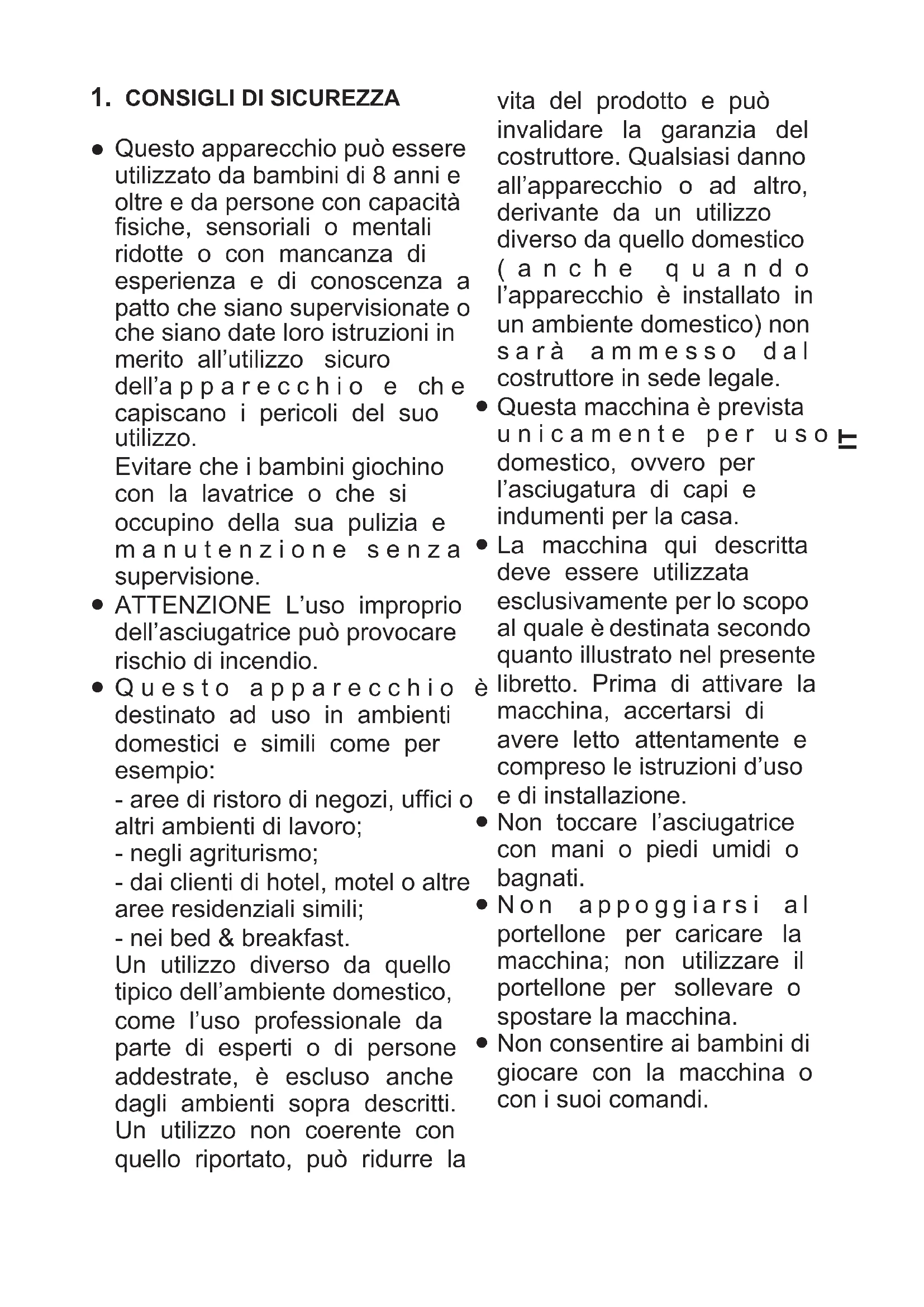 Questo apparecchio può essere utilizzato da bambini di 8 anni e oltre e da persone con capacità fisiche, sensoriali o mentali ridotte o con mancanza di esperienza e di conoscenza a patto che siano supervisionate o che siano date loro istruzioni in merito all’utilizzo sicuro dell’a p p a r e c c h i o e ch e capiscano i pericoli del suo utilizzo. Evitare che i bambini giochino con la lavatrice o che si occupino della sua pulizia e m a n u t e n z i o n e s e n z a supervisione. ATTENZIONE L’uso improprio dell’asciugatrice può provocare rischio di incendio. Q u e s t o a p p a r e c c h i o è destinato ad uso in ambienti domestici e simili come per esempio: - aree di ristoro di negozi, uffici o altri ambienti di lavoro; - negli agriturismo; - dai clienti di hotel, motel o altre aree residenziali simili; - nei bed & breakfast. Un utilizzo diverso da quello tipico dell’ambiente domestico, come l’uso professionale da parte di esperti o di persone addestrate, è escluso anche dagli ambienti sopra descritti. Un utilizzo non coerente con quello riportato, può ridurre la vita del prodotto e può invalidare la garanzia del costruttore. Qualsiasi danno all’apparecchio o ad altro, derivante da un utilizzo diverso da quello domestico ( a n c h e q u a n d o l’apparecchio è installato in un ambiente domestico) non s a r à a m m e s s o d a l costruttore in sede legale. Questa macchina è prevista u n i c a m e n t e p e r u s o domestico, ovvero per l’asciugatura di capi e destinata secondo quanto illustrato nel presente libretto. Prima di attivare la macchina, accertarsi di avere letto attentamente e compreso le istruzioni d’uso e di installazione. Non toccare l’asciugatrice con mani o piedi umidi o bagnati. N o n a p p o g g i a r s i a l portellone per caricare la macchina; non utilizzare il portellone per Non consentire ai bambini di giocare con la macchina o con i suoi comandi. indumenti per la casa. La macchina qui descritta deve essere utilizzata esclusivamente per lo scopo al quale è sollevare o spostare la macchina.