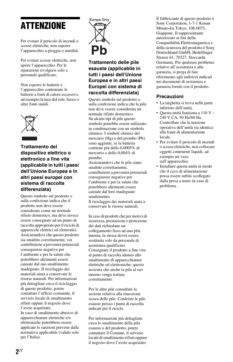 WPA-PSK (AES) 30 WPA-PSK (TKIP) 30 ATTENZIONE Per evitare il pericolo di incendi o scosse elettriche, non esporre l’apparecchio a pioggia o umidità. Per evitare scosse elettriche, non aprire l’apparecchio. Per le riparazioni rivolgersi solo a personale qualificato. Non esporre le batterie e l’apparecchio contenente le batterie a fonti di calore eccessivo, ad esempio la luce del sole, fuoco o altre fonti simili. Trattamento del dispositivo elettrico o elettronico a fine vita (applicabile in tutti i paesi dell’Unione Europea e in altri paesi europei con sistema di raccolta differenziata) Questo simbolo sul prodotto o sulla confezione indica che il prodotto non deve essere considerato come un normale rifiuto domestico, ma deve invece essere consegnato ad un punto di raccolta appropriato per il riciclo di apparecchi elettrici ed elettronici. Assicurandovi che questo prodotto sia smaltito correttamente, voi contribuirete a prevenire potenziali conseguenze negative per l’ambiente e per la salute che potrebbero altrimenti essere causate dal suo smaltimento inadeguato. Il riciclaggio dei materiali aiuta a conservare le risorse naturali. Per informazioni più dettagliate circa il riciclaggio di questo prodotto, potete contattare l’ufficio comunale, il servizio locale di smaltimento rifiuti oppure il negozio dove l’avete acquistato. In caso di smaltimento abusivo di apparecchiature elettriche e/o elettroniche potrebbero essere applicate le sanzioni previste dalla normativa applicabile (valido solo per l’Italia). 2IT Trattamento delle pile esauste (applicabile in tutti i paesi dell’Unione Europea e in altri paesi Europei con sistema di raccolta differenziata) Questo simbolo sul prodotto o sulla confezione indica che la pila non deve essere considerata un normale rifiuto domestico. Su alcuni tipi di pile questo simbolo potrebbe essere utilizzato in combinazione con un simbolo chimico. I simboli chimici del mercurio (Hg) o del piombo (Pb) sono aggiunti, se la batteria contiene più dello 0,0005% di mercurio o dello 0,004% di piombo. Assicurandovi che le pile siano smaltite correttamente, contribuirete a prevenire potenziali conseguenze negative per l’ambiente e per la salute che potrebbero altrimenti essere causate dal loro inadeguato smaltimento. Il riciclaggio dei materiali aiuta a conservare le risorse naturali. In caso di prodotti che per motivi di sicurezza, prestazione o protezione dei dati richiedano un collegamento fisso ad una pila interna, la stessa dovrà essere sostituita solo da personale di assistenza qualificato. Consegnare il prodotto a fine vita al punto di raccolta idoneo allo smaltimento di apparecchiature elettriche ed elettroniche; questo assicura che anche la pila al suo interno venga trattata correttamente. Per le altre pile consultate la sezione relativa alla rimozione sicura delle pile. Conferire le pile esauste presso i punti di raccolta indicati per il riciclo. Per informazioni più dettagliate circa lo smaltimento della pila esausta o del prodotto, potete contattare il Comune, il servizio locale di smaltimento rifiuti oppure il negozio dove l’avete acquistato. Il fabbricante di questo prodotto è Sony Corporation, 1-7-1 Konan Minato-ku Tokyo, 108-0075, Giappone. Il rappresentante autorizzato ai fini della Compatibilità Elettromagnetica e della sicurezza del prodotto è Sony Deutschland GmbH, Hedelfinger Strasse 61, 70327, Stoccarda Germania. Per qualsiasi problema relativo all’assistenza o alla garanzia, si prega di fare riferimento agli indirizzi indicati nei documenti di assistenza e garanzia forniti con il prodotto. Precauzioni