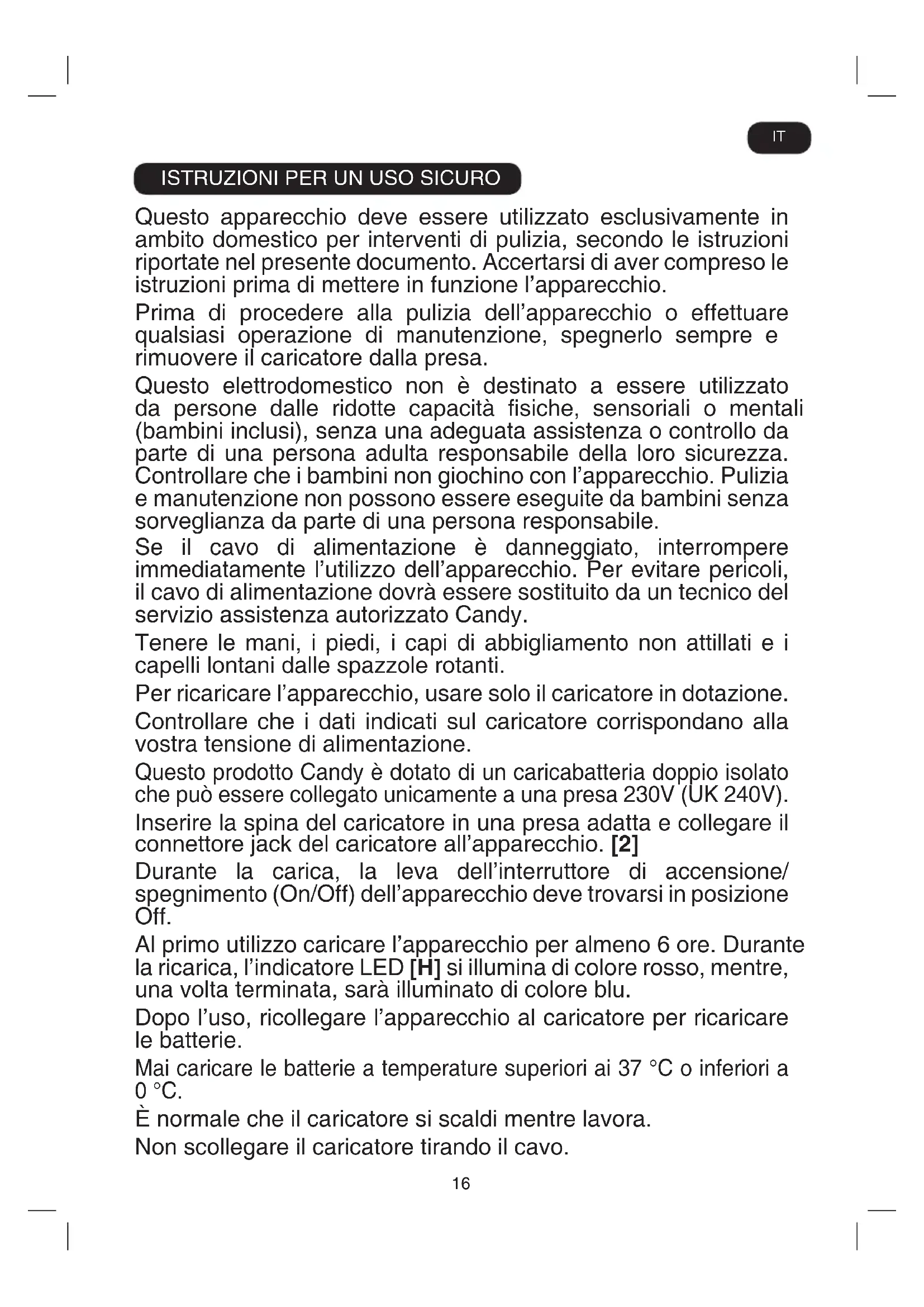 Questo apparecchio deve essere utilizzato esclusivamente in ambito domestico per interventi di pulizia, secondo le istruzioni riportate nel presente documento. Accertarsi di aver compreso le istruzioni prima di mettere in funzione l’apparecchio. Prima di procedere alla pulizia dell’apparecchio o effettuare qualsiasi operazione di manutenzione, spegnerlo sempre e rimuovere il caricatore dalla presa. Questo elettrodomestico non è destinato a essere utilizzato da persone dalle ridotte capacità siche, sensoriali o mentali (bambini inclusi), senza una adeguata assistenza o controllo da parte di una persona adulta responsabile della loro sicurezza. Controllare che i bambini non giochino con l’apparecchio. Pulizia e manutenzione non possono essere eseguite da bambini senza sorveglianza da parte di una persona responsabile. Se il cavo di alimentazione è danneggiato, interrompere immediatamente l’utilizzo dell’apparecchio. Per evitare pericoli, il cavo di alimentazione dovrà essere sostituito da un tecnico del servizio assistenza autorizzato Candy. Tenere le mani, i piedi, i capi di abbigliamento non attillati e i capelli lontani dalle spazzole rotanti. Per ricaricare l’apparecchio, usare solo il caricatore in dotazione. Controllare che i dati indicati sul caricatore corrispondano alla vostra tensione di alimentazione. Questo prodotto Candy è dotato di un caricabatteria doppio isolato che può essere collegato unicamente a una presa 230V (UK 240V). Inserire la spina del caricatore in una presa adatta e collegare il connettore jack del caricatore all’apparecchio. [2] Durante la carica, la leva dell’interruttore di accensione/ spegnimento (On/Off) dell’apparecchio deve trovarsi in posizione Off. Al primo utilizzo caricare l’apparecchio per almeno 6 ore. Durante la ricarica, l’indicatore LED [H] si illumina di colore rosso, mentre, una volta terminata, sarà illuminato di colore blu. Dopo l’uso, ricollegare l’apparecchio al caricatore per ricaricare le batterie. Mai caricare le batterie a temperature superiori ai 37 °C o inferiori a 0 °C. È normale che il caricatore si scaldi mentre lavora. Non scollegare il caricatore tirando il cavo. IT17 Scollegare il caricatore in caso di assenza prolungata (ferie, ecc.). Dopo lunghi periodi di inutilizzo ricaricare l’apparecchio perchè le batterie potrebbero essersi scaricate automaticamente. Se l’apparecchio è da smaltire, le batterie devono prima essere rimosse. Rimuovere la batteria solo quando l’apparecchio è scollegato dalla rete di alimentazione. Smaltire le batterie in sicurezza. Far funzionare l’apparecchio no al suo arresto ed assicurarsi che le batterie siano completamente scariche. Le batterie usate devono essere riposte in un centro di riciclaggio e non smaltite con i riuti domestici. Per rimuovere le batterie, si prega di contattare il Centro Servizi per Assistenza Clienti Candy o procedere in base alle seguenti istruzioni. IMPORTANTE: Scaricare sempre completamente le batterie prima della rimozione. Procedere con la pulizia no a quando le batterie sono completamente scariche. Rimuovere il connettore jack per la ricarica dall’apparecchio. Premere il pulsante di rilascio batteria che permetterà il rilascio della batteria. [14a] Estrarre lentamente la batteria dal suo alloggiamento. [14b] Nota: Se si riscontrano difcoltà a smantellare l’unità o per informazioni più dettagliate sul trattamento, recupero e riciclaggio di questo apparecchio, si prega di contattare l’ufcio comunale per il servizio smaltimento riuti. Utilizzare solo accessori o parti di consumo e di ricambio consigliati o forniti da Candy. Elettricità statica: Alcuni tappeti possono produrre un piccolo accumulo di elettricità statica. Le cariche di elettricità statica non sono pericolose per la salute. Non utilizzare l’apparecchio all’aperto, su superci bagnate o per aspirare liquidi. Non aspirare oggetti solidi o appuntiti, ammiferi, ceneri calde, mozziconi di sigaretta o similari. Non vaporizzare o aspirare liquidi inammabili, detergenti, aerosol o i loro vapori. Non calpestare il cavo di alimentazione durante l’utilizzo dell’apparecchio o scollegare la spina dalla presa tirando il cavo di alimentazione. Non continuare a utilizzare l’apparecchio o il caricatore in caso di presunto guasto. Assistenza Candy: per garantire un funzionamento sempre sicuro ed efciente dell’apparecchiatura, si consiglia di fare eseguire