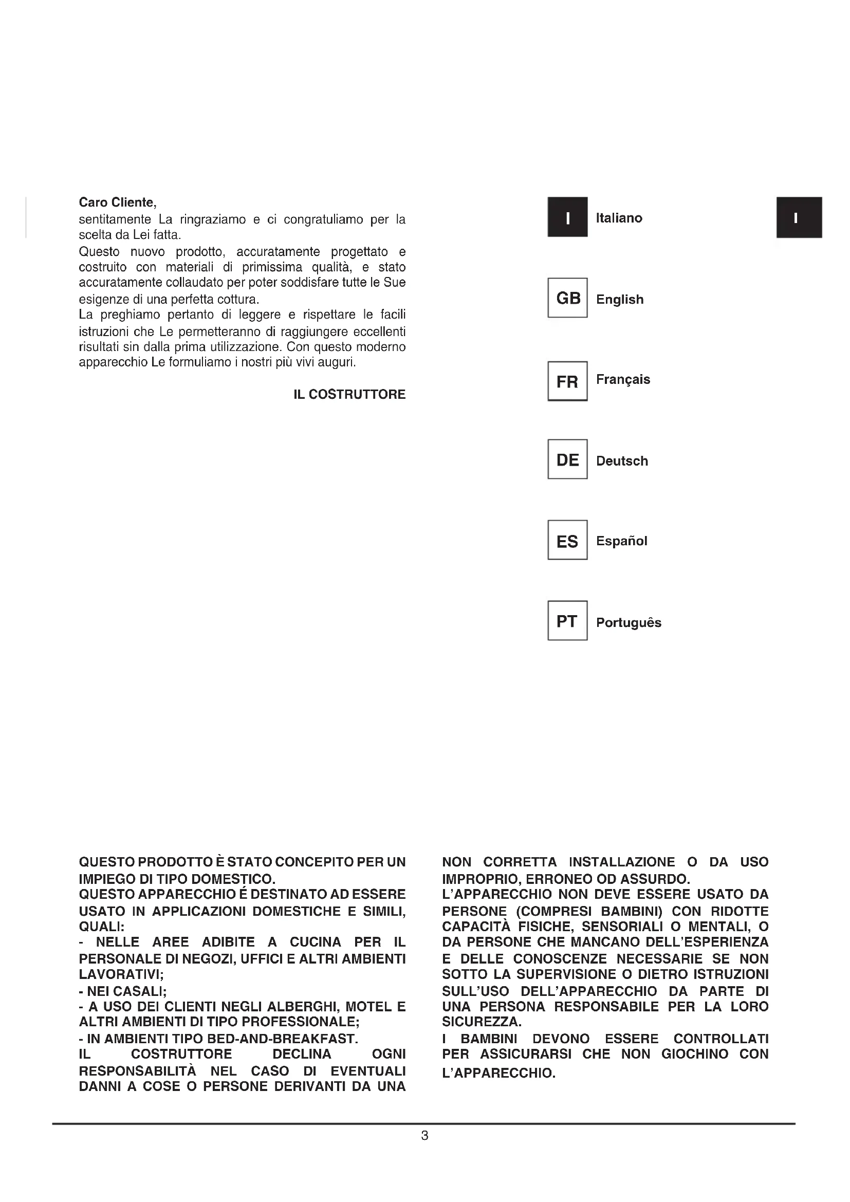 L’APPARECCHIO. Caro Cliente, sentitamente La ringraziamo e ci congratuliamo per la scelta da Lei fatta. Questo nuovo prodotto, accuratamente progettato e costruito con materiali di primissima qualità, e stato accuratamente collaudato per poter soddisfare tutte le Sue esigenze di una perfetta cottura. La preghiamo pertanto di leggere e rispettare le facili istruzioni che Le permetteranno di raggiungere eccellenti risultati sin dalla prima utilizzazione. Con questo moderno apparecchio Le formuliamo i nostri più vivi auguri. IL COSTRUTTORE Italiano