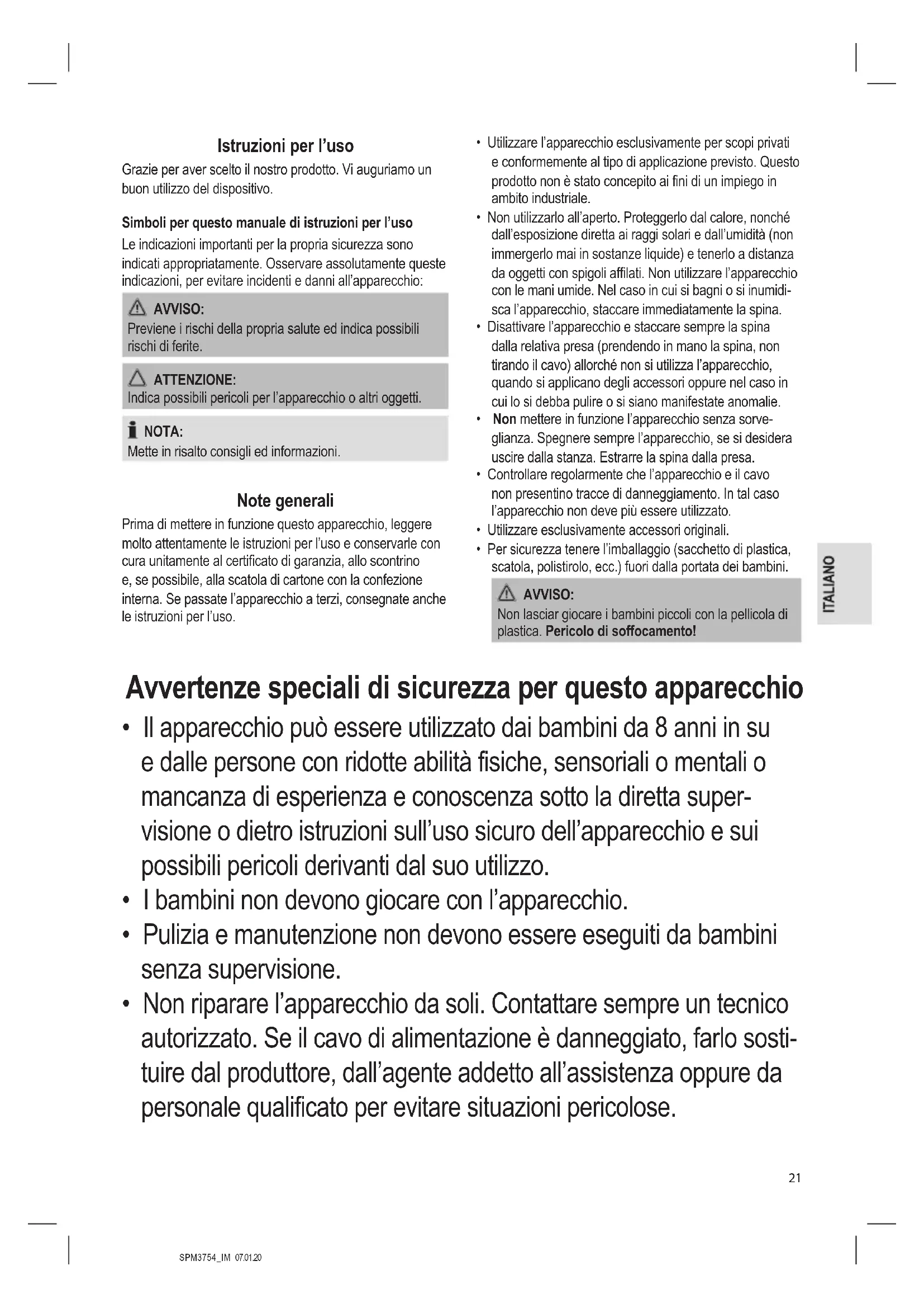 - Non riparare l’apparecchio da soli. Contattare sempre un tecnico autorizzato. Se il cavo di alimentazione è danneggiato, farlo sosti- tuire dal produttore, dall’agente addetto all’assistenza oppure da personale qualificato per evitare situazioni pericolose.SPM3754_IM 07.01.20