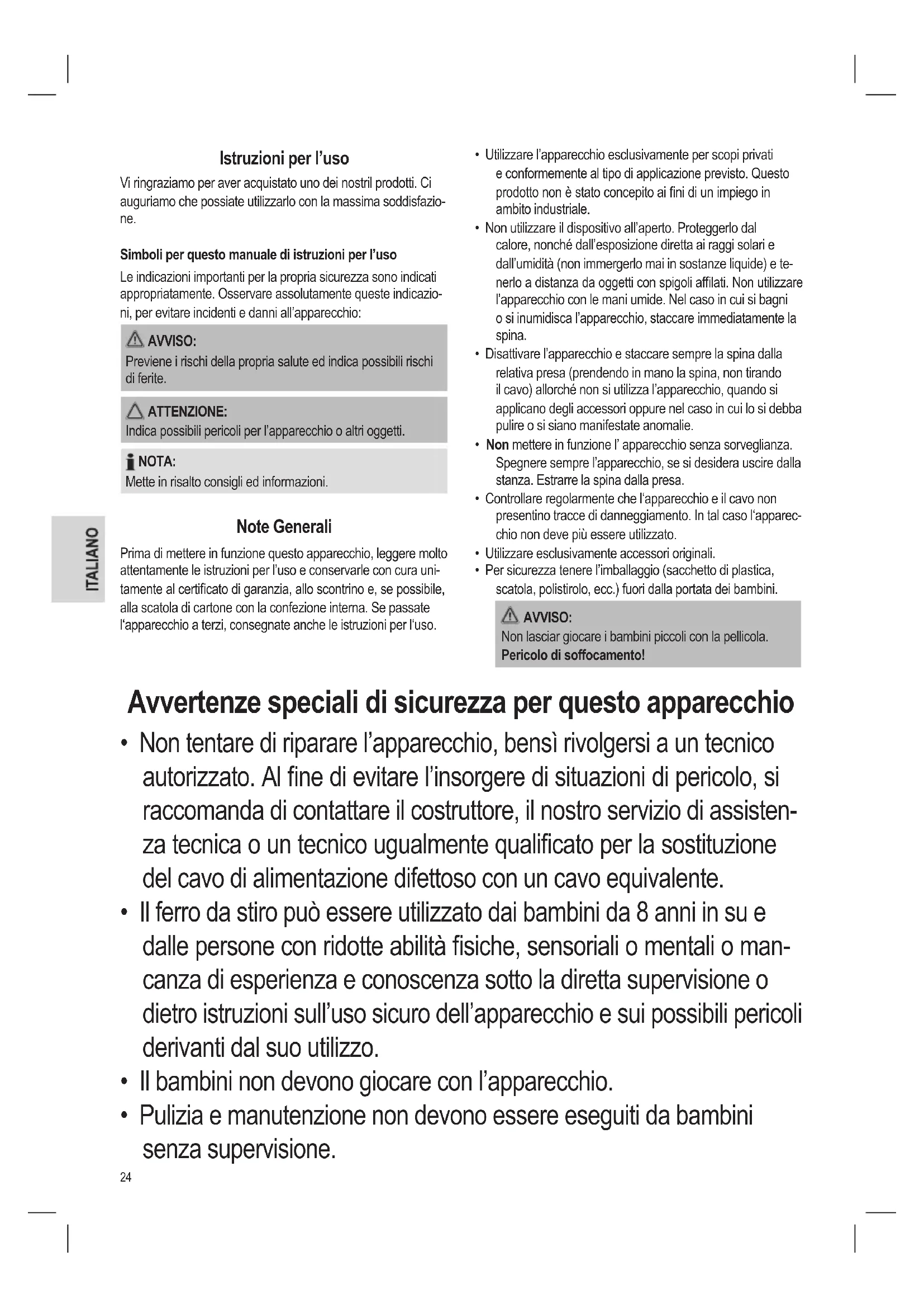 - Per sicurezza tenere l’imballaggio (sacchetto di plastica, scatola, polistirolo, ecc.) fuori dalla portata dei bambini. AVVISO: Non lasciar giocare i bambini piccoli con la pellicola. Pericolo di soffocamento! Avvertenze speciali di sicurezza per questo apparecchio