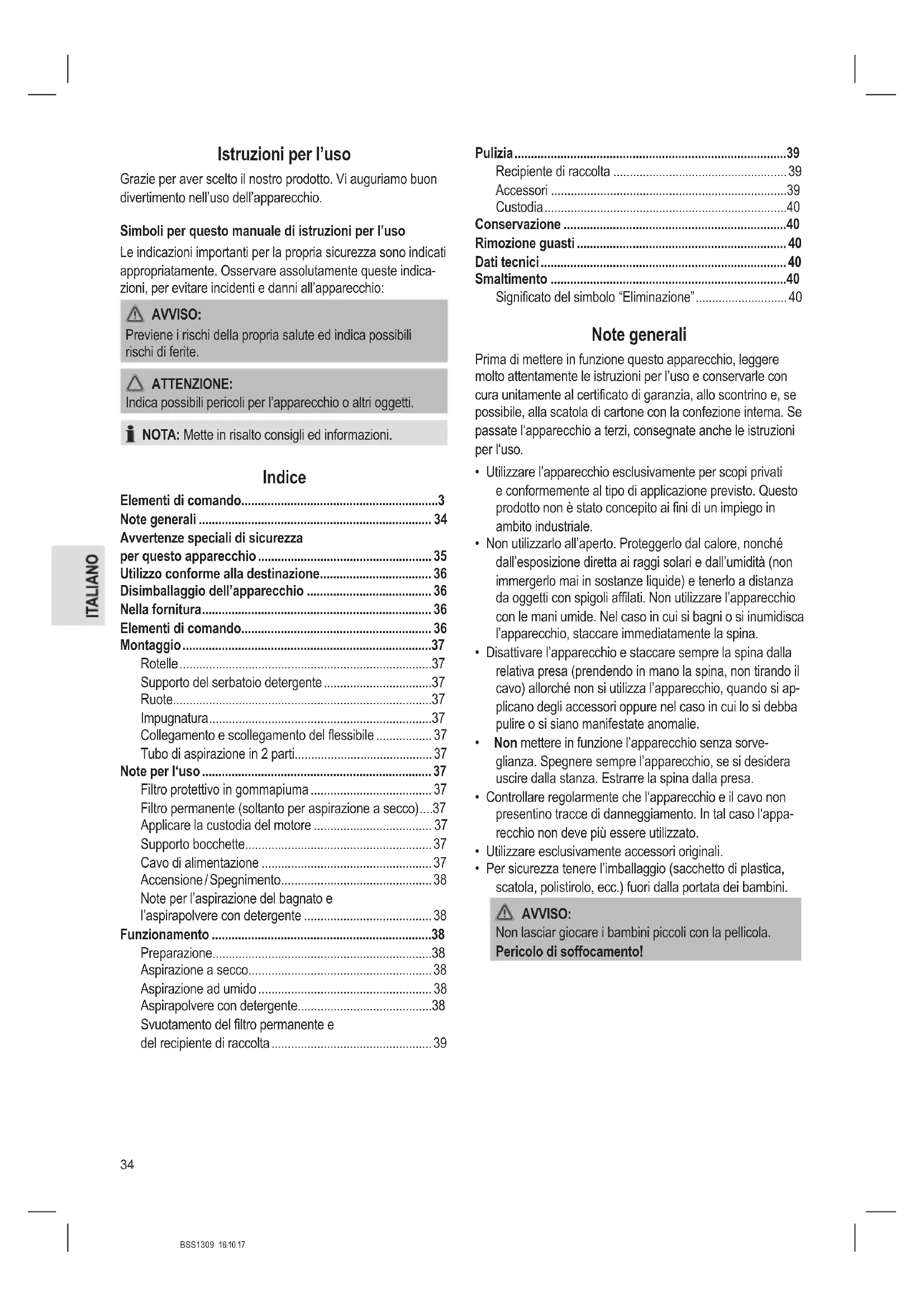 dispositivo. Restituirlo immediatamente al rivenditore. NOTA: Possono essere presenti polvere o residui di lavorazione sull’apparecchio. Pulire l’apparecchio come descritto nella sezione “Pulizia”. Nella fornitura 2 x Ruote 2 x Rotelle 2 x Piedini rotelle 1 x Impugnatura 6 x Viti Elementi di comando 1 Tubo di aspirazione in 2 pezzi 2 Raccordo serbatoio detergente 3 Cesto d’aspirazione 4 Custodia motore 5 Interruttore on / off I / O / II 6 Raccordo tubo flessibile detergente 7 Collegamento del tubo essibile 8 Tubo flessibile detergente 9 Tubo essibile di aspirazione 10 Fascia di trattenuta 11 Base della rotella con inserti porta ugelli 12 Rotella 13 Apertura di aspirazione 14 Apertura di scarico 15 Spazzola di distribuzione detergente 16 Recipiente di raccolta 17 Meccanismo di bloccaggio 18 Ruota 19 Supporto del serbatoio detergente 20 Serbatoio detergente 21 Inserti porta ugelli 22 Bocca soffiatore 23 Impugnatura 24 Dispositivo nebulizzatore 25 Filtro permanente (Aspirazione a secco) 26 Filtro protettivo in gommapiuma 27 Spazzola bagnato / asciutto 28 Spazzola per tappezzeria e rivestimenti 29 Ugello fessure NOTA: Per le parti di ricambio, consultare il proprio rivenditore.BSS1309 16.10.17