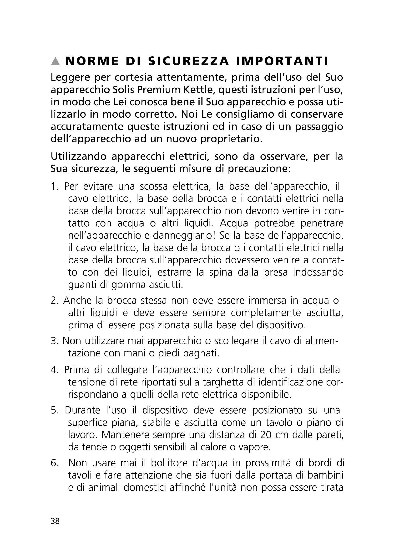 Leggere per cortesia attentamente, prima dell’uso del Suo apparecchio Solis Premium Kettle, questi istruzioni per l’uso, in modo che Lei conosca bene il Suo apparecchio e possa uti- lizzarlo in modo corretto. Noi Le consigliamo di conservare accuratamente queste istruzioni ed in caso di un passaggio dell’apparecchio ad un nuovo proprietario. Utilizzando apparecchi elettrici, sono da osservare, per la Sua sicurezza, le seguenti misure di precauzione: