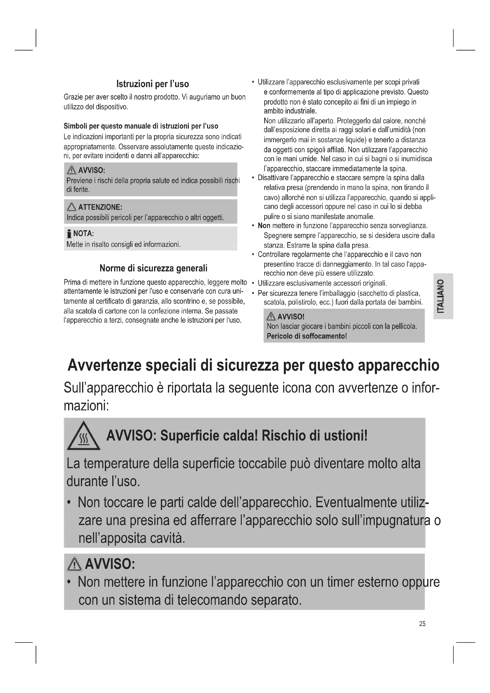 - Per sicurezza tenere l’imballaggio (sacchetto di plastica, scatola, polistirolo, ecc.) fuori dalla portata dei bambini. AVVISO! Non lasciar giocare i bambini piccoli con la pellicola. Pericolo di soffocamento! Avvertenze speciali di sicurezza per questo apparecchio Sull’apparecchio è riportata la seguente icona con avvertenze o infor- mazioni: AVVISO: Superficie calda! Rischio di ustioni! La temperature della supercie toccabile può diventare molto alta durante l’uso.