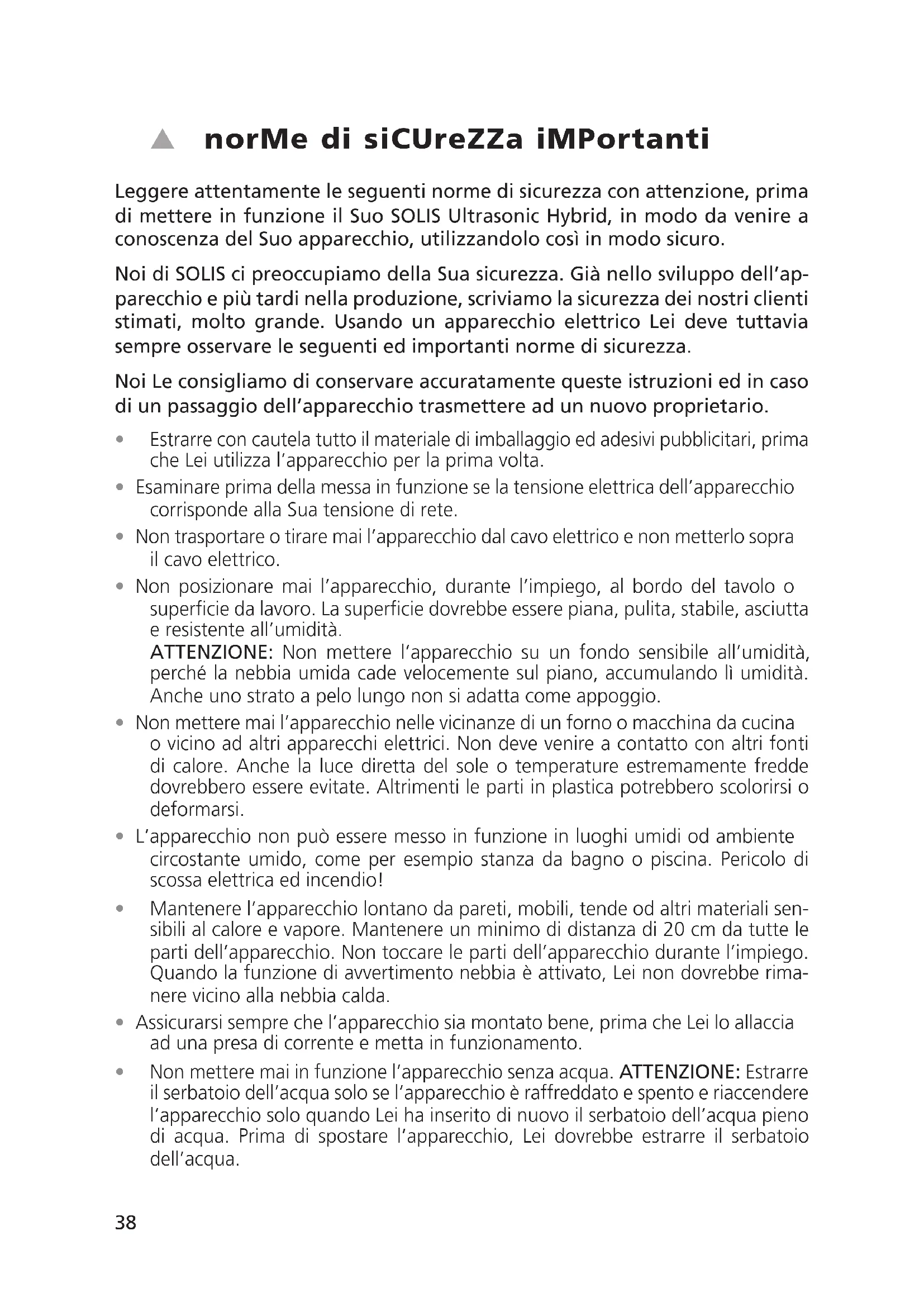Conservez l´emballage d´origine de cet article afin de pouvoir le transporter en cas de besoin. Solis of Switzerland SA Solis-Haus • CH-8152 Glattbrugg-Zurich • Suisse Téléphone +41 44 874 64 54 • Téléfax +41 44 874 64 99 info@solis.ch • www.solis.ch • www.solis.com3738 norme di sicureZZa importanti Leggere attentamente le seguenti norme di sicurezza con attenzione, prima di mettere in funzione il Suo SOLIS Ultrasonic Hybrid, in modo da venire a conoscenza del Suo apparecchio, utilizzandolo così in modo sicuro. Noi di SOLIS ci preoccupiamo della Sua sicurezza. Già nello sviluppo dell’ap- parecchio e più tardi nella produzione, scriviamo la sicurezza dei nostri clienti stimati, molto grande. Usando un apparecchio elettrico Lei deve tuttavia sempre osservare le seguenti ed importanti norme di sicurezza. Noi Le consigliamo di conservare accuratamente queste istruzioni ed in caso di un passaggio dell’apparecchio trasmettere ad un nuovo proprietario.