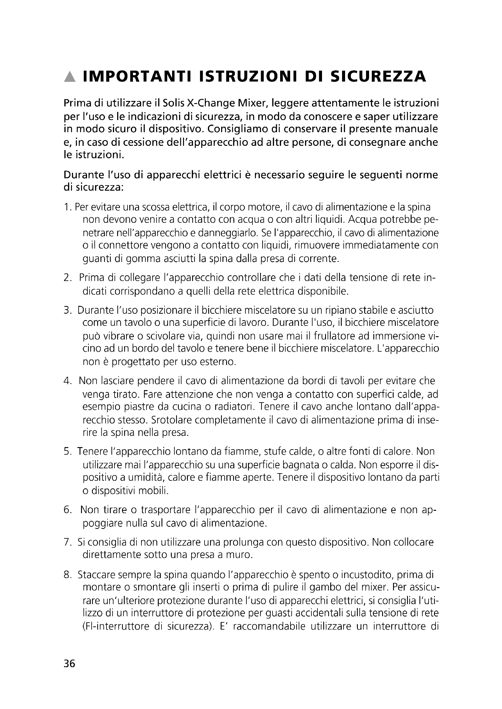 Prima di utilizzare il Solis X-Change Mixer, leggere attentamente le istruzioni per l’uso e le indicazioni di sicurezza, in modo da conoscere e saper utilizzare in modo sicuro il dispositivo. Consigliamo di conservare il presente manuale e, in caso di cessione dell’apparecchio ad altre persone, di consegnare anche le istruzioni. Durante l’uso di apparecchi elettrici è necessario seguire le seguenti norme di sicurezza: