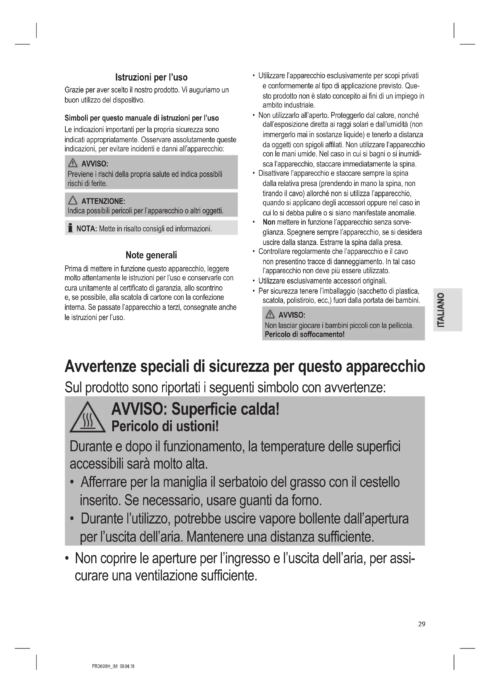 chio. Restituirlo immediatamente al rivenditore. Elementi di comando / Nella fornitura 1 Bocchette d’uscita dell’aria 2 Aperture per l’ingresso dell’aria 3 Spia indicatrice di funzionamento 4 Interruttore acceso / spento / timer 5 Controllo di temperatura 6 Cestello 7 Protezione per il pulsante di rilascio 8 Pulsante di rilascio 9 Maniglia del cestello 10 Serbatoio raccogli-grassoFR3698H_IM 09.04.18
