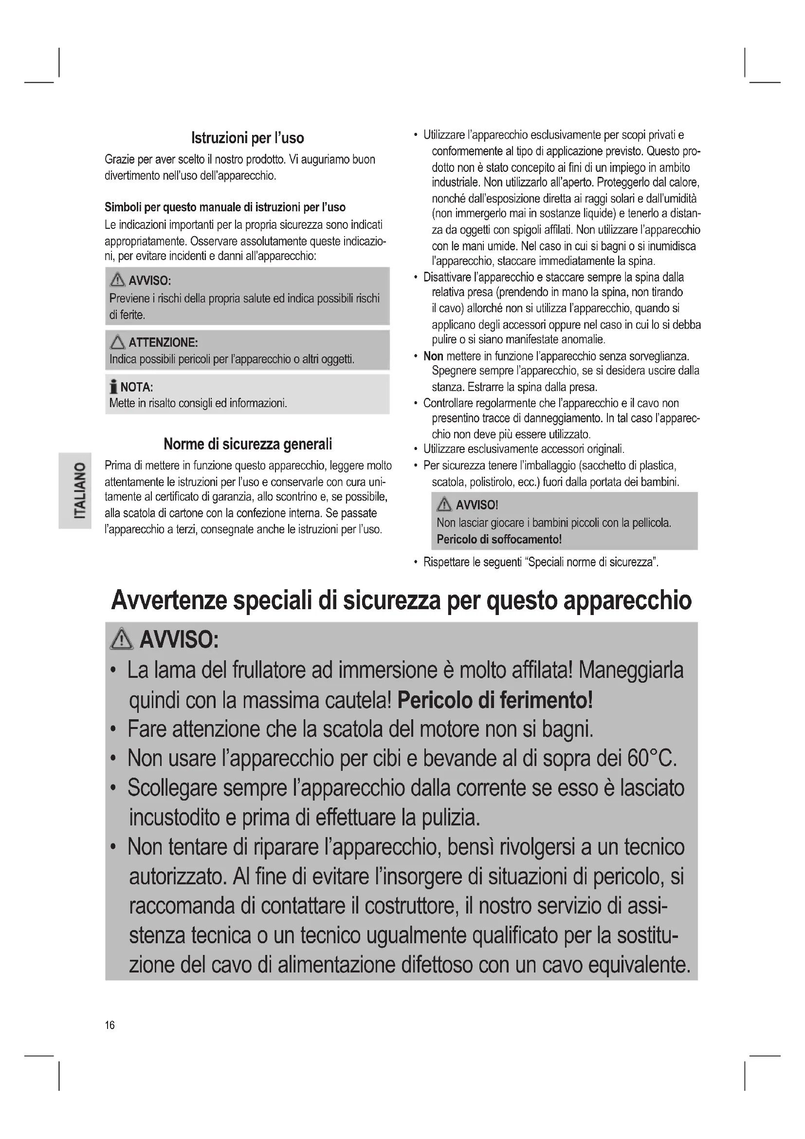 - La lama del frullatore ad immersione è molto aflata! Pericolo di ferimento! ATTENZIONE: