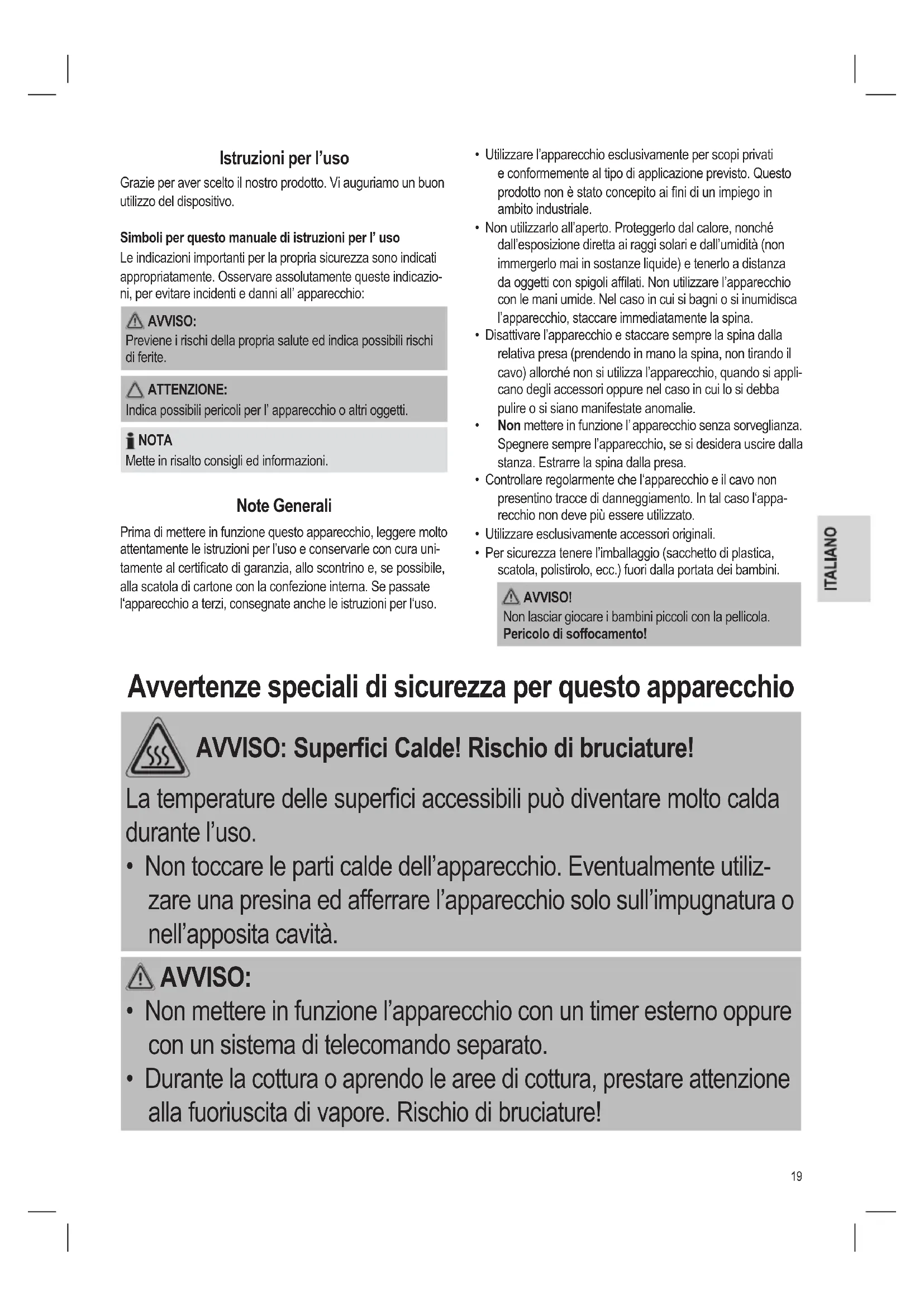 - Per sicurezza tenere l’imballaggio (sacchetto di plastica, scatola, polistirolo, ecc.) fuori dalla portata dei bambini. AVVISO! Non lasciar giocare i bambini piccoli con la pellicola. Pericolo di soffocamento! Avvertenze speciali di sicurezza per questo apparecchio AVVISO: Superfici Calde! Rischio di bruciature! La temperature delle superci accessibili può diventare molto calda durante l’uso.