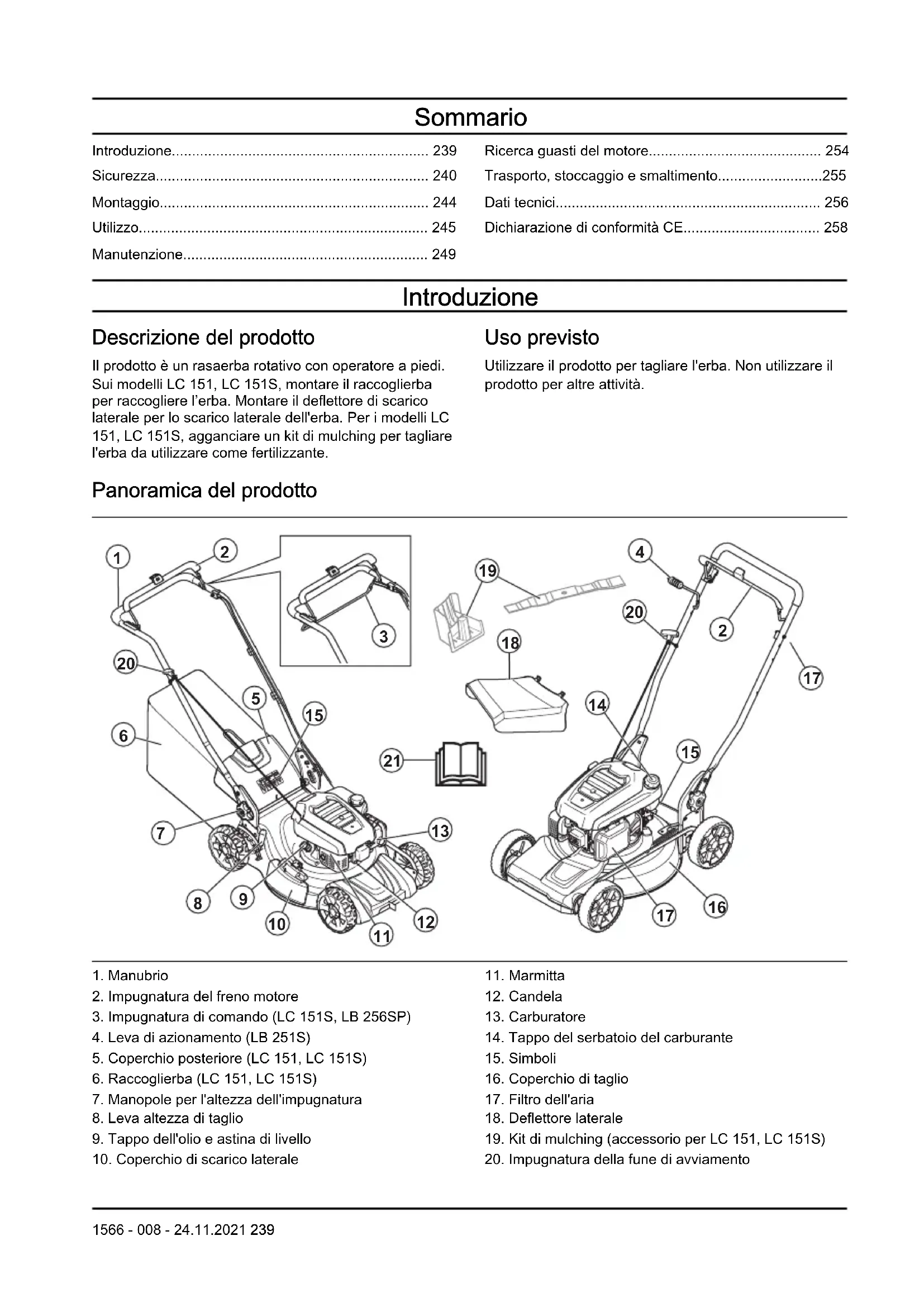 - Dichiarazione di conformità CE Introduzione Descrizione del prodotto Il prodotto è un rasaerba rotativo con operatore a piedi. Sui modelli LC 151, LC 151S, montare il raccoglierba per raccogliere l’erba. Montare il deflettore di scarico laterale per lo scarico laterale dell'erba. Per i modelli LC 151, LC 151S, agganciare un kit di mulching per tagliare l'erba da utilizzare come fertilizzante. Uso previsto Utilizzare il prodotto per tagliare l'erba. Non utilizzare il prodotto per altre attività. Panoramica del prodotto p. 258