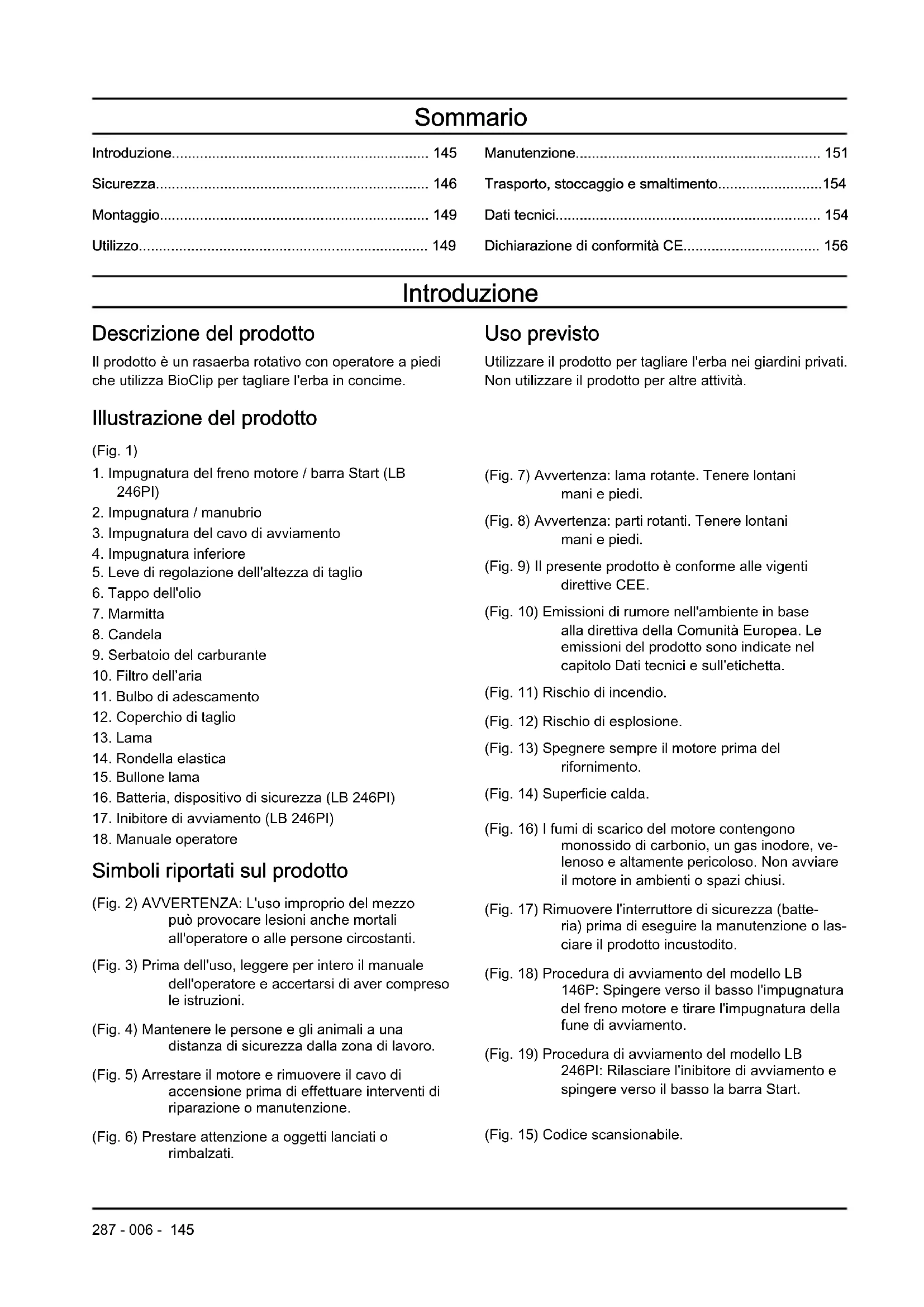 Simboli riportati sul prodotto (Fig. 2) AVVERTENZA: L'uso improprio del mezzo può provocare lesioni anche mortali all'operatore o alle persone circostanti. (Fig. 3) Prima dell'uso, leggere per intero il manuale dell'operatore e accertarsi di aver compreso le istruzioni. (Fig. 4) Mantenere le persone e gli animali a una distanza di sicurezza dalla zona di lavoro. (Fig. 5) Arrestare il motore e rimuovere il cavo di accensione prima di effettuare interventi di riparazione o manutenzione. (Fig. 6) Prestare attenzione a oggetti lanciati o rimbalzati. (Fig. 7) Avvertenza: lama rotante. Tenere lontani mani e piedi. (Fig. 8) Avvertenza: parti rotanti. Tenere lontani mani e piedi. (Fig. 9) Il presente prodotto è conforme alle vigenti direttive CEE. (Fig. 10) Emissioni di rumore nell'ambiente in base alla direttiva della Comunità Europea. Le emissioni del prodotto sono indicate nel capitolo Dati tecnici e sull'etichetta. (Fig. 11) Rischio di incendio. (Fig. 12) Rischio di esplosione. (Fig. 13) Spegnere sempre il motore prima del rifornimento. (Fig. 14) Superficie calda. (Fig. 16) I fumi di scarico del motore contengono monossido di carbonio, un gas inodore, ve- lenoso e altamente pericoloso. Non avviare il motore in ambienti o spazi chiusi. (Fig. 17) Rimuovere l'interruttore di sicurezza (batte- ria) prima di eseguire la manutenzione o las- ciare il prodotto incustodito. (Fig. 18) Procedura di avviamento del modello LB 146P: Spingere verso il basso l'impugnatura del freno motore e tirare l'impugnatura della fune di avviamento. (Fig. 19) Procedura di avviamento del modello LB 246PI: Rilasciare l'inibitore di avviamento e spingere verso il basso la barra Start. (Fig. 15) Codice scansionabile.