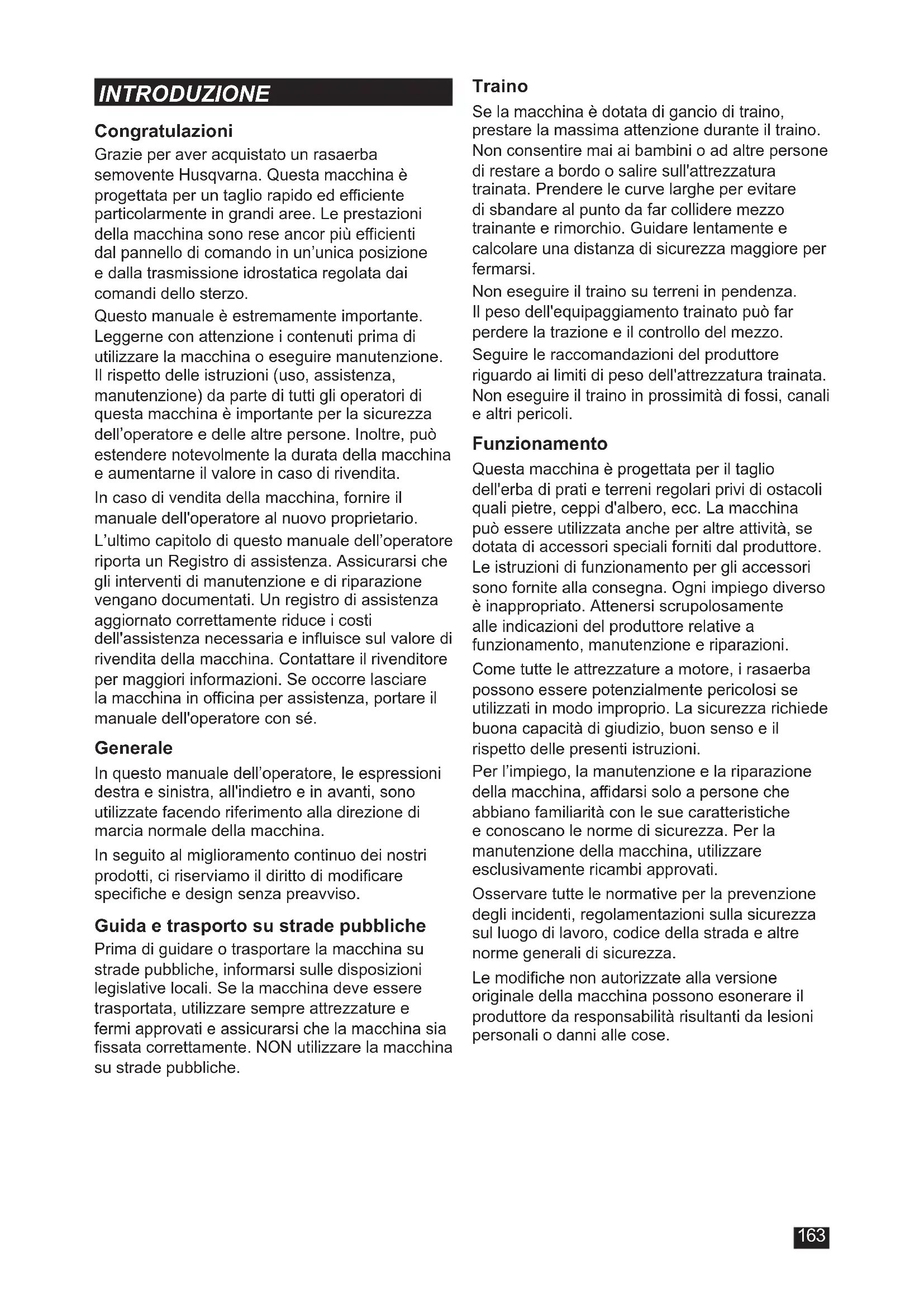 REGISTRO DI ASSISTENZA ..................... 198Congratulazioni Grazie per aver acquistato un rasaerba semovente Husqvarna. Questa macchina è progettata per un taglio rapido ed eciente particolarmente in grandi aree. Le prestazioni della macchina sono rese ancor più ecienti dal pannello di comando in un’unica posizione e dalla trasmissione idrostatica regolata dai comandi dello sterzo. Questo manuale è estremamente importante. Leggerne con attenzione i contenuti prima di utilizzare la macchina o eseguire manutenzione. Il rispetto delle istruzioni (uso, assistenza, manutenzione) da parte di tutti gli operatori di questa macchina è importante per la sicurezza dell’operatore e delle altre persone. Inoltre, può estendere notevolmente la durata della macchina e aumentarne il valore in caso di rivendita. In caso di vendita della macchina, fornire il manuale dell'operatore al nuovo proprietario. L’ultimo capitolo di questo manuale dell’operatore riporta un Registro di assistenza. Assicurarsi che gli interventi di manutenzione e di riparazione vengano documentati. Un registro di assistenza aggiornato correttamente riduce i costi dell'assistenza necessaria e inuisce sul valore di rivendita della macchina. Contattare il rivenditore per maggiori informazioni. Se occorre lasciare la macchina in ocina per assistenza, portare il manuale dell'operatore con sé. Generale In questo manuale dell’operatore, le espressioni destra e sinistra, all'indietro e in avanti, sono utilizzate facendo riferimento alla direzione di marcia normale della macchina. In seguito al miglioramento continuo dei nostri prodotti, ci riserviamo il diritto di modicare speciche e design senza preavviso. Guida e trasporto su strade pubbliche Prima di guidare o trasportare la macchina su strade pubbliche, informarsi sulle disposizioni legislative locali. Se la macchina deve essere trasportata, utilizzare sempre attrezzature e fermi approvati e assicurarsi che la macchina sia ssata correttamente. NON utilizzare la macchina su strade pubbliche. Traino Se la macchina è dotata di gancio di traino, prestare la massima attenzione durante il traino. Non consentire mai ai bambini o ad altre persone di restare a bordo o salire sull'attrezzatura trainata. Prendere le curve larghe per evitare di sbandare al punto da far collidere mezzo trainante e rimorchio. Guidare lentamente e calcolare una distanza di sicurezza maggiore per fermarsi. Non eseguire il traino su terreni in pendenza. Il peso dell'equipaggiamento trainato può far perdere la trazione e il controllo del mezzo. Seguire le raccomandazioni del produttore riguardo ai limiti di peso dell'attrezzatura trainata. Non eseguire il traino in prossimità di fossi, canali e altri pericoli. Funzionamento Questa macchina è progettata per il taglio dell'erba di prati e terreni regolari privi di ostacoli quali pietre, ceppi d'albero, ecc. La macchina può essere utilizzata anche per altre attività, se dotata di accessori speciali forniti dal produttore. Le istruzioni di funzionamento per gli accessori sono fornite alla consegna. Ogni impiego diverso è inappropriato. Attenersi scrupolosamente alle indicazioni del produttore relative a funzionamento, manutenzione e riparazioni. Come tutte le attrezzature a motore, i rasaerba possono essere potenzialmente pericolosi se utilizzati in modo improprio. La sicurezza richiede buona capacità di giudizio, buon senso e il rispetto delle presenti istruzioni. Per l’impiego, la manutenzione e la riparazione della macchina, adarsi solo a persone che abbiano familiarità con le sue caratteristiche e conoscano le norme di sicurezza. Per la manutenzione della macchina, utilizzare esclusivamente ricambi approvati. Osservare tutte le normative per la prevenzione degli incidenti, regolamentazioni sulla sicurezza sul luogo di lavoro, codice della strada e altre norme generali di sicurezza. Le modiche non autorizzate alla versione originale della macchina possono esonerare il produttore da responsabilità risultanti da lesioni personali o danni alle cose.