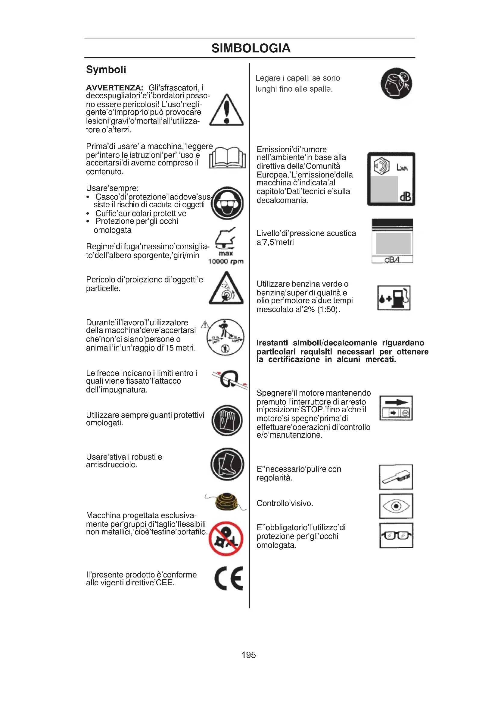 IMPORTANTE! Usati in maniera impropria o negligente lo sfrascatore, il decespuglia- tore e il bordatore possono essere attrezzi pericolosi, in grado di provocare lesioni gravi o mortali all’utilizzatore o a terzi. È importantissimo leggere attentamente e capire queste istruzioni per l’uso. Lavoran- do con la macchina usare sempre abbi- gliamento protettivo omologato. L’uso di abbigliamento protettivo non elimina i ris- chi di lesioni, ma riduce gli effetti del danno in caso di incidente. Consigliatevi con il vostro rivenditore di fiducia per la scelta dell’attrezzatura adeguata. CUFFIE PROTETTIVE Usare cuffie protettive con effetto insono- rizzante adeguato.