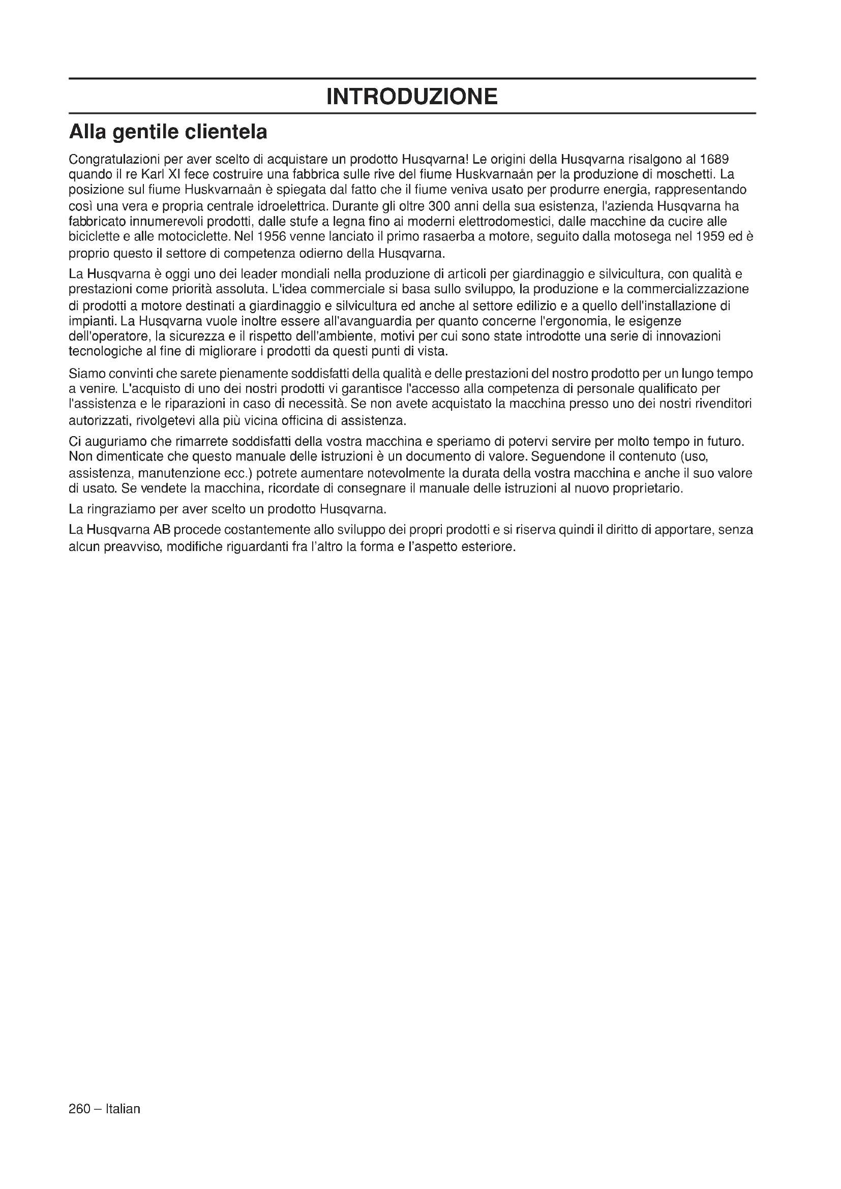 - Dichiarazione di conformità CE 60 – Italian INTRODUZIONE Alla gentile clientela Congratulazioni per aver scelto di acquistare un prodotto Husqvarna! Le origini della Husqvarna risalgono al 1689 quando il re Karl XI fece costruire una fabbrica sulle rive del fiume Huskvarnaån per la produzione di moschetti. La posizione sul fiume Huskvarnaån è spiegata dal fatto che il fiume veniva usato per produrre energia, rappresentando così una vera e propria centrale idroelettrica. Durante gli oltre 300 anni della sua esistenza, l'azienda Husqvarna ha fabbricato innumerevoli prodotti, dalle stufe a legna fino ai moderni elettrodomestici, dalle macchine da cucire alle biciclette e alle motociclette. Nel 1956 venne lanciato il primo rasaerba a motore, seguito dalla motosega nel 1959 ed è proprio questo il settore di competenza odierno della Husqvarna. La Husqvarna è oggi uno dei leader mondiali nella produzione di articoli per giardinaggio e silvicultura, con qualità e prestazioni come priorità assoluta. L'idea commerciale si basa sullo sviluppo, la produzione e la commercializzazione di prodotti a motore destinati a giardinaggio e silvicultura ed anche al settore edilizio e a quello dell'installazione di impianti. La Husqvarna vuole inoltre essere all'avanguardia per quanto concerne l'ergonomia, le esigenze dell'operatore, la sicurezza e il rispetto dell'ambiente, motivi per cui sono state introdotte una serie di innovazioni tecnologiche al fine di migliorare i prodotti da questi punti di vista. Siamo convinti che sarete pienamente soddisfatti della qualità e delle prestazioni del nostro prodotto per un lungo tempo a venire. L'acquisto di uno dei nostri prodotti vi garantisce l'accesso alla competenza di personale qualificato per l'assistenza e le riparazioni in caso di necessità. Se non avete acquistato la macchina presso uno dei nostri rivenditori autorizzati, rivolgetevi alla più vicina officina di assistenza. Ci auguriamo che rimarrete soddisfatti della vostra macchina e speriamo di potervi servire per molto tempo in futuro. Non dimenticate che questo manuale delle istruzioni è un documento di valore. Seguendone il contenuto (uso, assistenza, manutenzione ecc.) potrete aumentare notevolmente la durata della vostra macchina e anche il suo valore di usato. Se vendete la macchina, ricordate di consegnare il manuale delle istruzioni al nuovo proprietario. La ringraziamo per aver scelto un prodotto Husqvarna. La Husqvarna AB procede costantemente allo sviluppo dei propri prodotti e si riserva quindi il diritto di apportare, senza alcun preavviso, modifiche riguardanti fra l’altro la forma e l’aspetto esteriore.Italian – 261 CHE COSA C’È? Che cosa c’è nella motosega? p. 2942