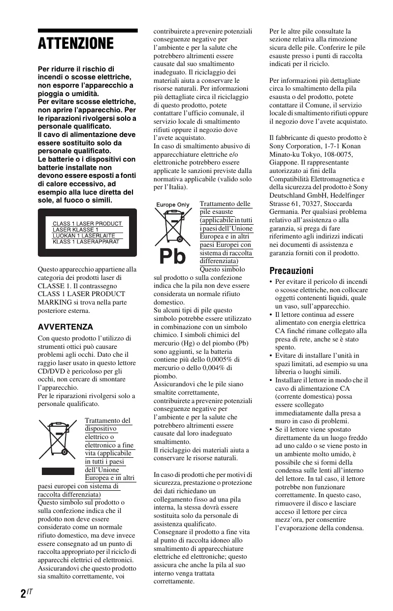 Para recibir información detallada sobre el reciclaje de este producto o de la batería, póngase en contacto con el ayuntamiento, el punto de recogida más cercano o el establecimiento donde ha adquirido el producto. El fabricante de este producto es Sony Corporation, 1-7-1 Konan Minato-ku Tokyo, 108-0075 CA pueda ser desenchufado de la toma de corriente de la pared inmediatamente en caso de problema. • Si traslada el reproductor directamente de un lugar frío a uno cálido o si lo instala en una sala muy húmeda, es posible que se condense humedad en las lentes de su interior. Si esto ocurre, es posible que el reproductor no funcione correctamente. En este caso, extraiga el disco y deje encendido el reproductor durante media hora aproximadamente hasta que se haya evaporado la humedad.