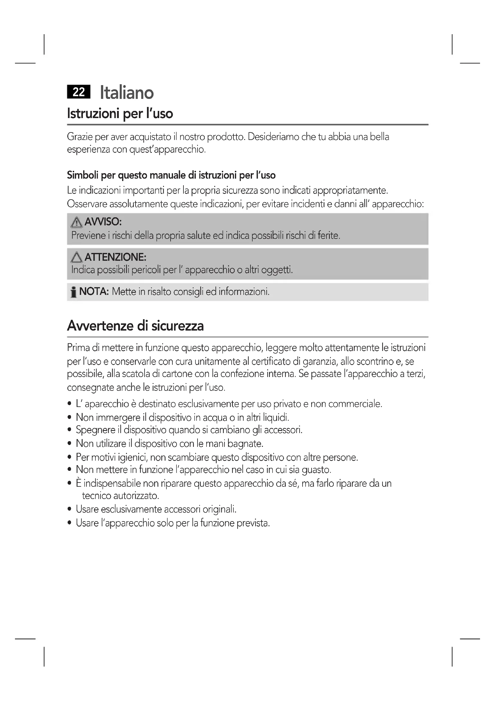 Istruzioni per l’uso Grazie per aver acquistato il nostro prodotto. Desideriamo che tu abbia una bella esperienza con quest’apparecchio. Simboli per questo manuale di istruzioni per l’uso Le indicazioni importanti per la propria sicurezza sono indicati appropriatamente. Osservare assolutamente queste indicazioni, per evitare incidenti e danni all’ apparecchio: AVVISO: Previene i rischi della propria salute ed indica possibili rischi di ferite. ATTENZIONE: Indica possibili pericoli per l’ apparecchio o altri oggetti. NOTA: Mette in risalto consigli ed informazioni. Avvertenze di sicurezza Prima di mettere in funzione questo apparecchio, leggere molto attentamente le istruzioni per l’uso e conservarle con cura unitamente al certificato di garanzia, allo scontrino e, se possibile, alla scatola di cartone con la confezione interna. Se passate l‘apparecchio a terzi, consegnate anche le istruzioni per l‘uso.