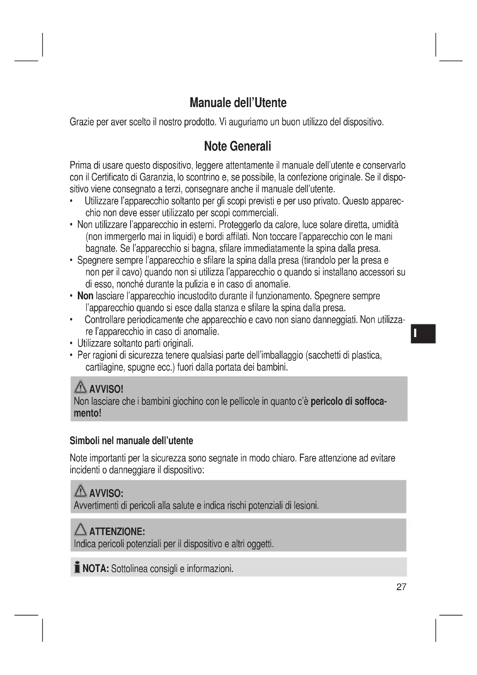 Manuale dell’Utente Grazie per aver scelto il nostro prodotto. Vi auguriamo un buon utilizzo del dispositivo. Note Generali Prima di usare questo dispositivo, leggere attentamente il manuale dell’utente e conservarlo con il Certicato di Garanzia, lo scontrino e, se possibile, la confezione originale. Se il dispo- sitivo viene consegnato a terzi, consegnare anche il manuale dell’utente.