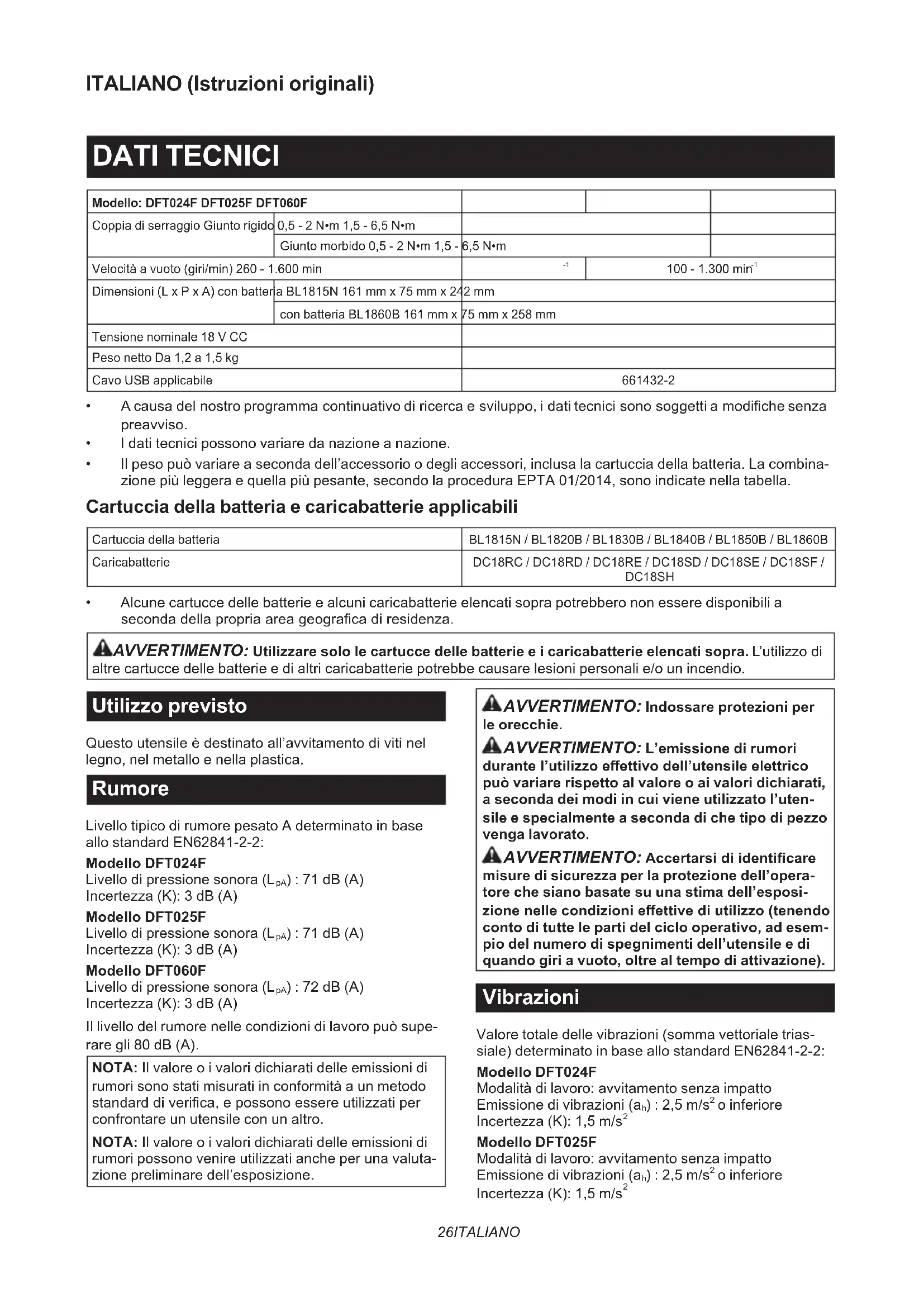 ) : 72 dB (A) Incertezza (K): 3 dB (A) Il livello del rumore nelle condizioni di lavoro può supe- rare gli 80 dB (A). NOTA: Il valore o i valori dichiarati delle emissioni di rumori sono stati misurati in conformità a un metodo standarddiverica,epossonoessereutilizzatiper confrontare un utensile con un altro. NOTA: Il valore o i valori dichiarati delle emissioni di rumori possono venire utilizzati anche per una valuta- zione preliminare dell’esposizione. AVVERTIMENTO: Indossare protezioni per le orecchie. AVVERTIMENTO: L’emissione di rumori durante l’utilizzo eettivo dell’utensile elettrico può variare rispetto al valore o ai valori dichiarati, a seconda dei modi in cui viene utilizzato l’uten- sile e specialmente a seconda di che tipo di pezzo venga lavorato. AVVERTIMENTO: Accertarsi di identicare misure di sicurezza per la protezione dell’opera- tore che siano basate su una stima dell’esposi- zione nelle condizioni eettive di utilizzo (tenendo conto di tutte le parti del ciclo operativo, ad esem- pio del numero di spegnimenti dell’utensile e di quando giri a vuoto, oltre al tempo di attivazione). Vibrazioni Valore totale delle vibrazioni (somma vettoriale trias- siale) determinato in base allo standard EN62841-2-2: Modello DFT024F Modalità di lavoro: avvitamento senza impatto Emissione di vibrazioni (a