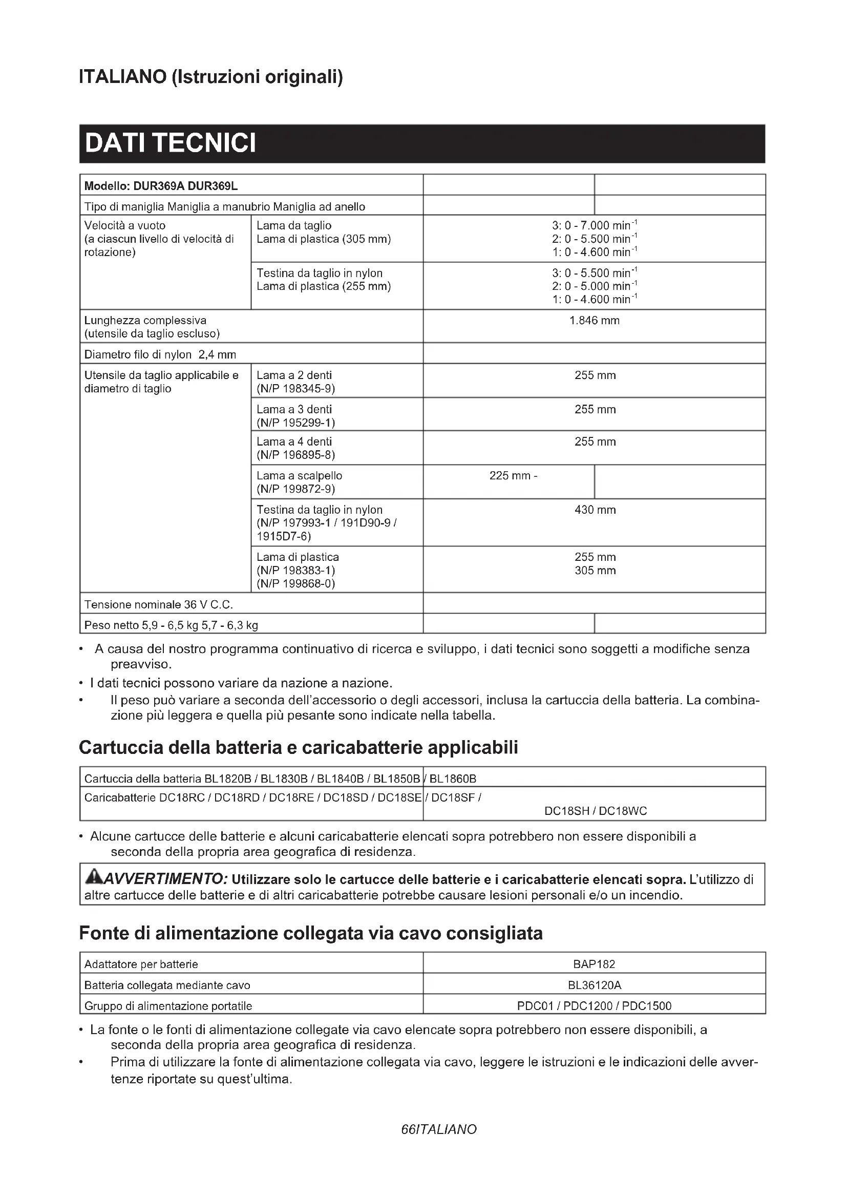 - Prima di utilizzare la fonte di alimentazione collegata via cavo, leggere le istruzioni e le indicazioni delle avver- tenze riportate su quest’ultima.67 ITALIANO Rumorosità Modello DUR369A Utensile da taglio Livello di pressione sonora (L
