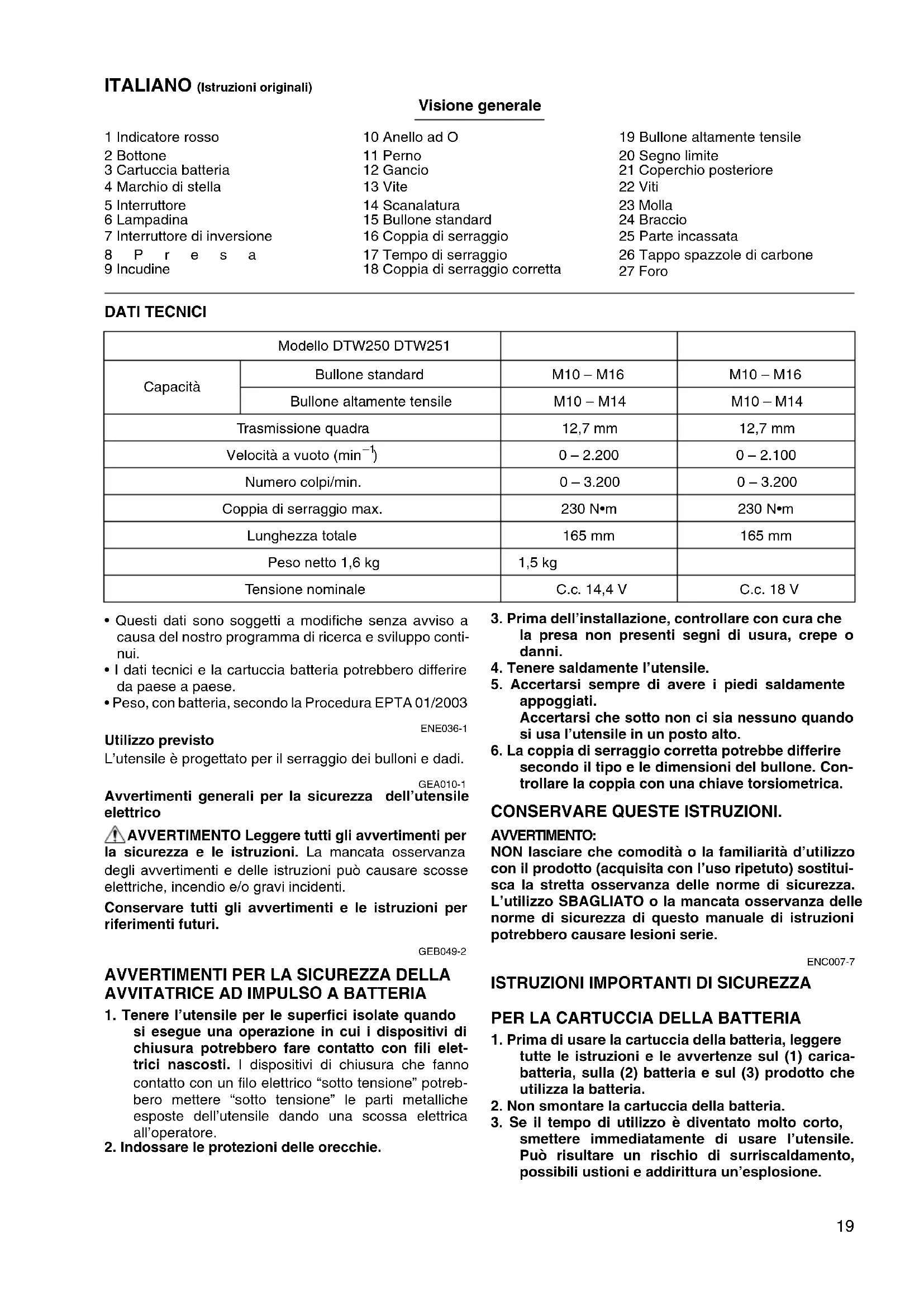 - Peso, con batteria, secondo la Procedura EPTA 01/2003 ENE036-1 Utilizzo previsto L’utensile è progettato per il serraggio dei bulloni e dadi. GEA010-1 Avvertimenti generali per la sicurezza dell’utensile elettrico AVVERTIMENTO Leggere tutti gli avvertimenti per la sicurezza e le istruzioni. La mancata osservanza degli avvertimenti e delle istruzioni può causare scosse elettriche, incendio e/o gravi incidenti. Conservare tutti gli avvertimenti e le istruzioni per riferimenti futuri. GEB049-2