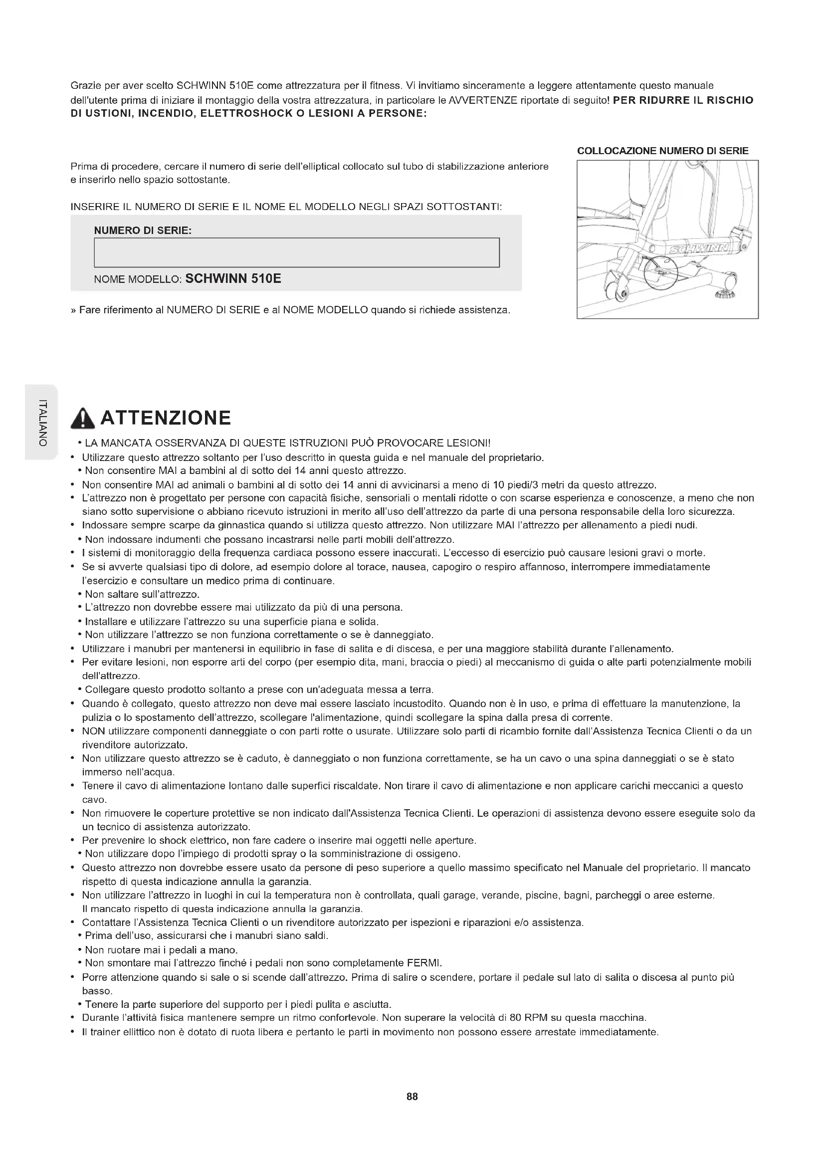- Il trainer ellittico non è dotato di ruota libera e pertanto le parti in movimento non possono essere arrestate immediatamente. Grazie per aver scelto SCHWINN 510E come attrezzatura per il fitness. Vi invitiamo sinceramente a leggere attentamente questo manuale dell'utente prima di iniziare il montaggio della vostra attrezzatura, in particolare le AVVERTENZE riportate di seguito! PER RIDURRE IL RISCHIO DI USTIONI, INCENDIO, ELETTROSHOCK O LESIONI A PERSONE: Prima di procedere, cercare il numero di serie dell’elliptical collocato sul tubo di stabilizzazione anteriore e inserirlo nello spazio sottostante. INSERIRE IL NUMERO DI SERIE E IL NOME EL MODELLO NEGLI SPAZI SOTTOSTANTI: