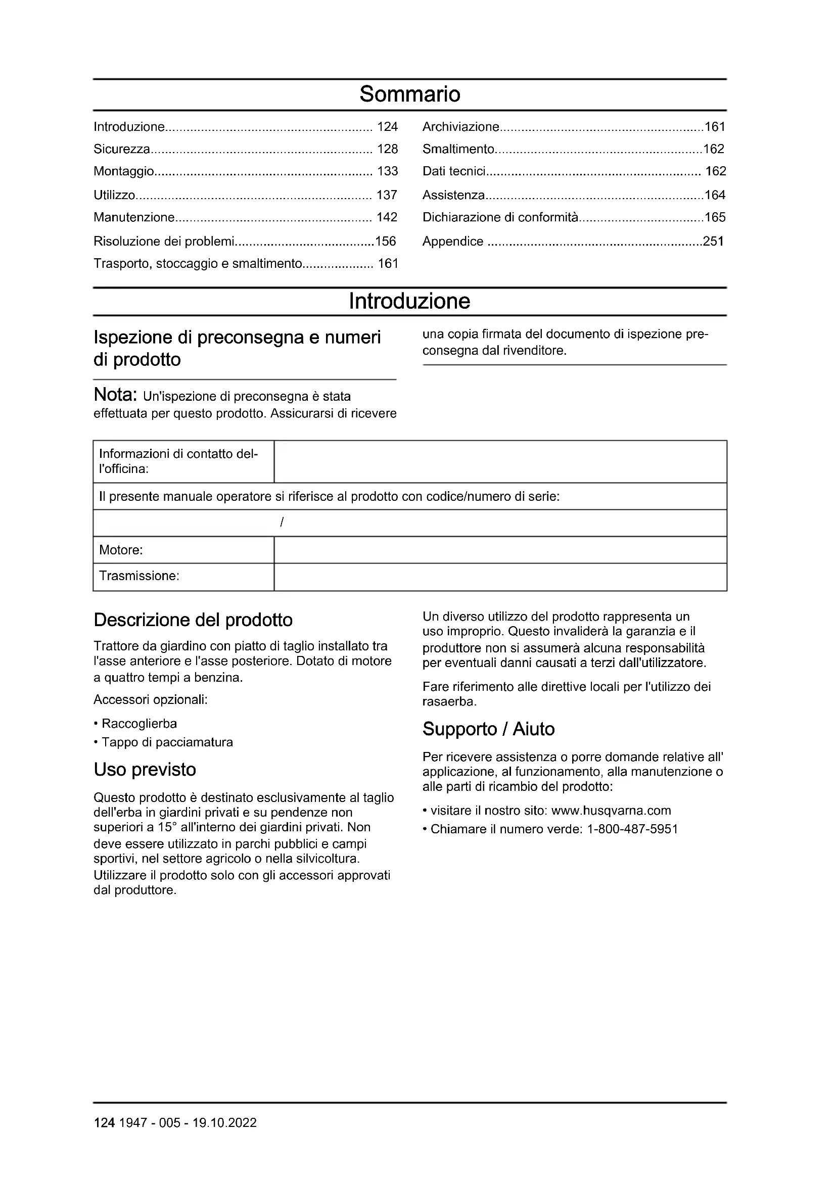 0,37 Assistenza Assistenza Eseguire un controllo annuale presso un centro di assistenza autorizzato per assicurarsi che il prodotto funzioni in modo sicuro e al meglio durante l'alta stagione. Il momento migliore per eseguire la manutenzione o la revisione del prodotto è la bassa stagione. Quando si ordinano i ricambi, fornire le informazioni sull'anno di acquisto, il modello, il tipo e il numero di serie. Utilizzare sempre ricambi originali.