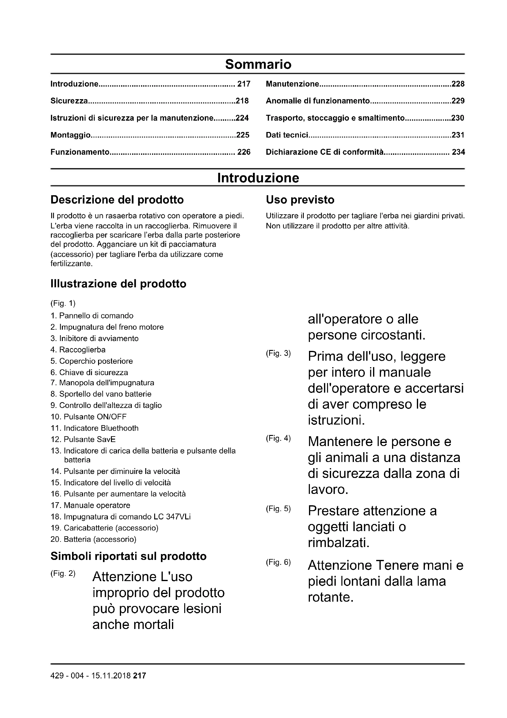- Dichiarazione CE di conformità Introduzione Descrizione del prodotto Il prodotto è un rasaerba rotativo con operatore a piedi. L'erba viene raccolta in un raccoglierba. Rimuovere il raccoglierba per scaricare l’erba dalla parte posteriore del prodotto. Agganciare un kit di pacciamatura (accessorio) per tagliare l'erba da utilizzare come fertilizzante. Uso previsto Utilizzare il prodotto per tagliare l'erba nei giardini privati. Non utilizzare il prodotto per altre attività. Illustrazione del prodotto (Fig. 1) p. 234