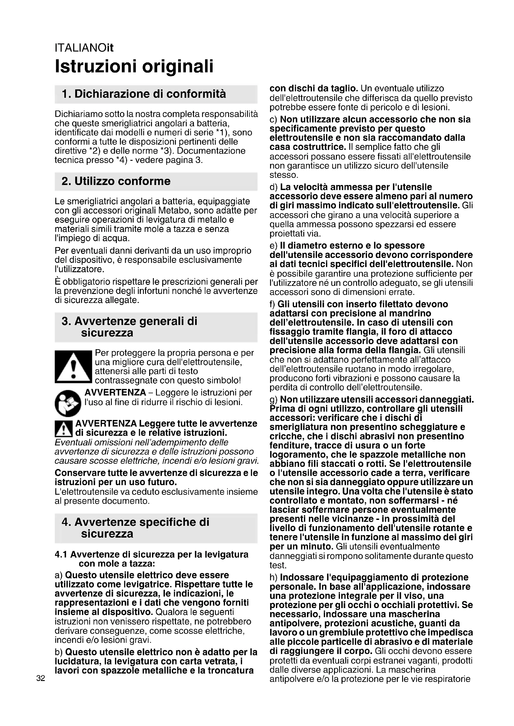 Istruzioni originali Dichiariamo sotto la nostra completa responsabilità che queste smerigliatrici angolari a batteria, identificate dai modelli e numeri di serie *1), sono conformi a tutte le disposizioni pertinenti delle direttive *2) e delle norme *3). Documentazione tecnica presso *4) - vedere pagina 3. Le smerigliatrici angolari a batteria, equipaggiate con gli accessori originali Metabo, sono adatte per eseguire operazioni di levigatura di metallo e materiali simili tramite mole a tazza e senza l'impiego di acqua. Per eventuali danni derivanti da un uso improprio del dispositivo, è responsabile esclusivamente l'utilizzatore. È obbligatorio rispettare le prescrizioni generali per la prevenzione degli infortuni nonché le avvertenze di sicurezza allegate. Per proteggere la propria persona e per una migliore cura dell'elettroutensile, attenersi alle parti di testo contrassegnate con questo simbolo! AVVERTENZA – Leggere le istruzioni per l'uso al fine di ridurre il rischio di lesioni. AVVERTENZA Leggere tutte le avvertenze di sicurezza e le relative istruzioni. Eventuali omissioni nell’adempimento delle avvertenze di sicurezza e delle istruzioni possono causare scosse elettriche, incendi e/o lesioni gravi. Conservare tutte le avvertenze di sicurezza e le istruzioni per un uso futuro. L'elettroutensile va ceduto esclusivamente insieme al presente documento.