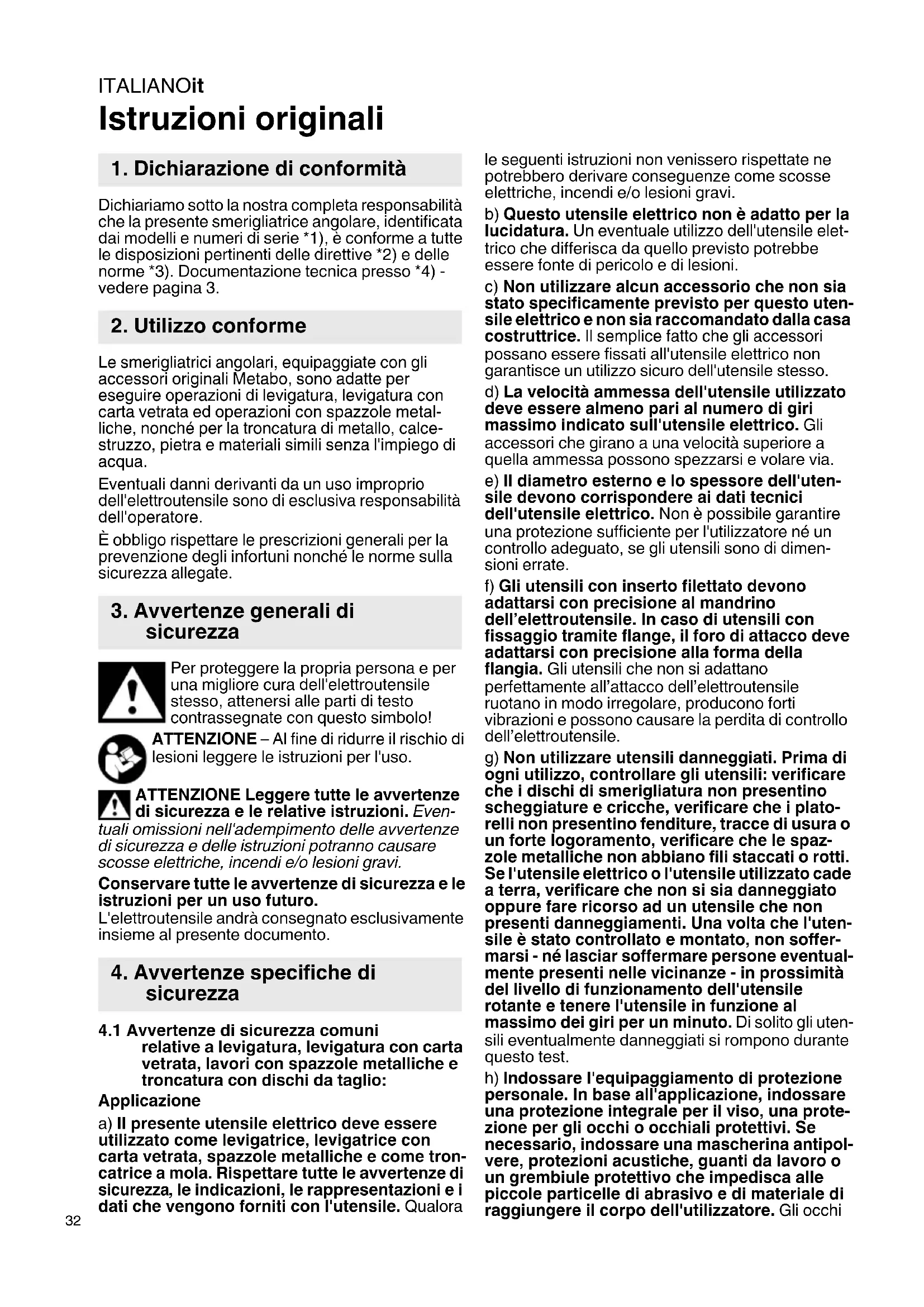 Istruzioni originali Dichiariamo sotto la nostra completa responsabilità che la presente smerigliatrice angolare, identificata dai modelli e numeri di serie *1), è conforme a tutte le disposizioni pertinenti delle direttive *2) e delle norme *3). Documentazione tecnica presso *4) - vedere pagina 3. Le smerigliatrici angolari, equipaggiate con gli accessori originali Metabo, sono adatte per eseguire operazioni di levigatura, levigatura con carta vetrata ed operazioni con spazzole metal- liche, nonché per la troncatura di metallo, calce- struzzo, pietra e materiali simili senza l'impiego di acqua. Eventuali danni derivanti da un uso improprio dell'elettroutensile sono di esclusiva responsabilità dell'operatore. È obbligo rispettare le prescrizioni generali per la prevenzione degli infortuni nonché le norme sulla sicurezza allegate. Per proteggere la propria persona e per una migliore cura dell'elettroutensile stesso, attenersi alle parti di testo contrassegnate con questo simbolo! ATTENZIONE – Al fine di ridurre il rischio di lesioni leggere le istruzioni per l'uso. ATTENZIONE Leggere tutte le avvertenze di sicurezza e le relative istruzioni. Even- tuali omissioni nell'adempimento delle avvertenze di sicurezza e delle istruzioni potranno causare scosse elettriche, incendi e/o lesioni gravi. Conservare tutte le avvertenze di sicurezza e le istruzioni per un uso futuro. L'elettroutensile andrà consegnato esclusivamente insieme al presente documento.