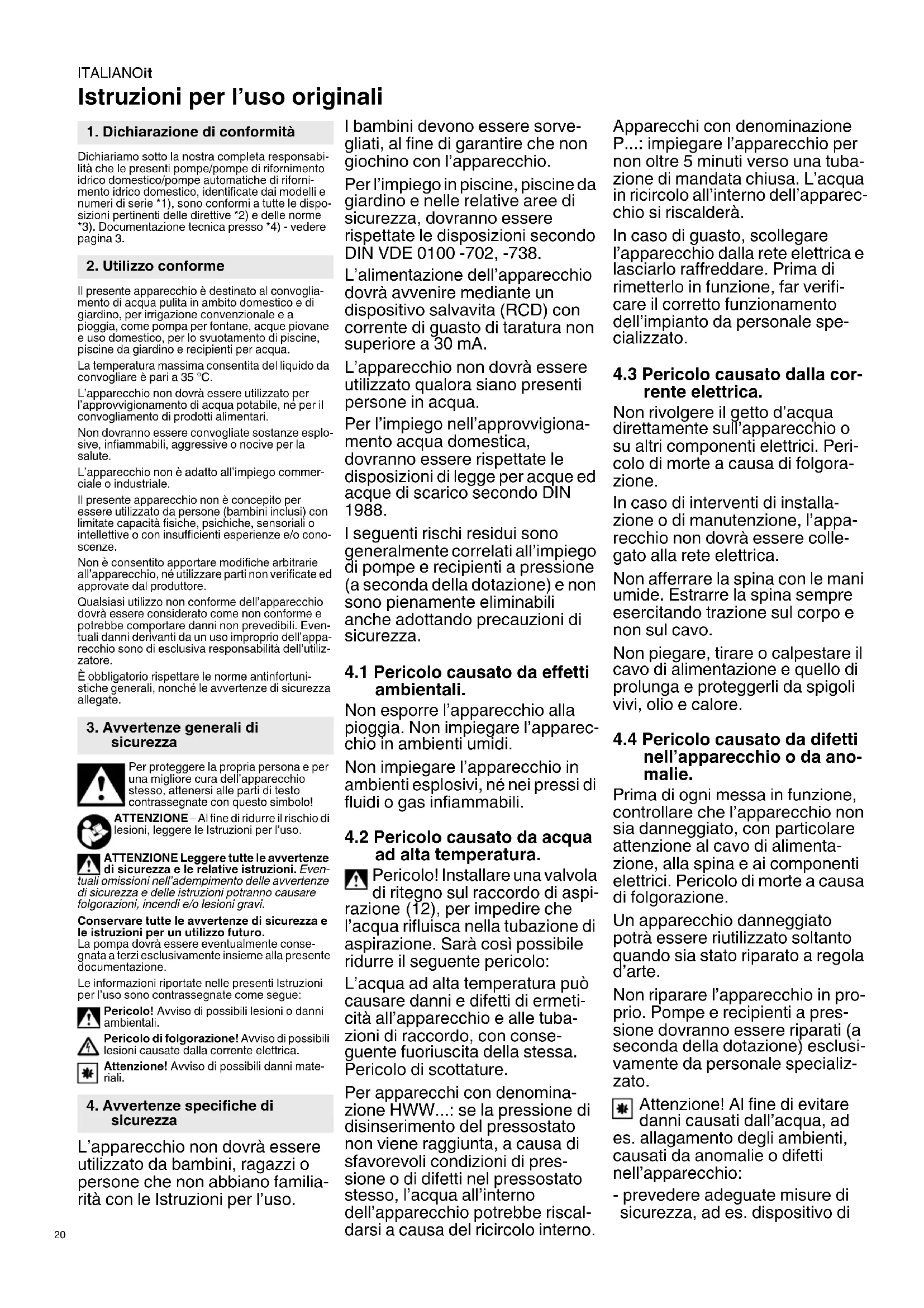Istruzioni per l’uso originali Dichiariamo sotto la nostra completa responsabi- lità che le presenti pompe/pompe di rifornimento idrico domestico/pompe automatiche di riforni- mento idrico domestico, identificate dai modelli e numeri di serie *1), sono conformi a tutte le dispo- sizioni pertinenti delle direttive *2) e delle norme *3). Documentazione tecnica presso *4) - vedere pagina 3. Il presente apparecchio è destinato al convoglia- mento di acqua pulita in ambito domestico e di giardino, per irrigazione convenzionale e a pioggia, come pompa per fontane, acque piovane e uso domestico, per lo svuotamento di piscine, piscine da giardino e recipienti per acqua. La temperatura massima consentita del liquido da convogliare è pari a 35 °C. L’apparecchio non dovrà essere utilizzato per l’approvvigionamento di acqua potabile, né per il convogliamento di prodotti alimentari. Non dovranno essere convogliate sostanze esplo- sive, infiammabili, aggressive o nocive per la salute. L’apparecchio non è adatto all’impiego commer- ciale o industriale. Il presente apparecchio non è concepito per essere utilizzato da persone (bambini inclusi) con limitate capacità fisiche, psichiche, sensoriali o intellettive o con insufficienti esperienze e/o cono- scenze. Non è consentito apportare modifiche arbitrarie all’apparecchio, né utilizzare parti non verificate ed approvate dal produttore. Qualsiasi utilizzo non conforme dell’apparecchio dovrà essere considerato come non conforme e potrebbe comportare danni non prevedibili. Even- tuali danni derivanti da un uso improprio dell’appa- recchio sono di esclusiva responsabilità dell’utiliz- zatore. È obbligatorio rispettare le norme antinfortuni- stiche generali, nonché le avvertenze di sicurezza allegate. Per proteggere la propria persona e per una migliore cura dell’apparecchio stesso, attenersi alle parti di testo contrassegnate con questo simbolo! ATTENZIONE – Al fine di ridurre il rischio di lesioni, leggere le Istruzioni per l’uso. ATTENZIONE Leggere tutte le avvertenze di sicurezza e le relative istruzioni. Even- tuali omissioni nell’adempimento delle avvertenze di sicurezza e delle istruzioni potranno causare folgorazioni, incendi e/o lesioni gravi. Conservare tutte le avvertenze di sicurezza e le istruzioni per un utilizzo futuro. La pompa dovrà essere eventualmente conse- gnata a terzi esclusivamente insieme alla presente documentazione. Le informazioni riportate nelle presenti Istruzioni per l’uso sono contrassegnate come segue: Pericolo! Avviso di possibili lesioni o danni ambientali. Pericolo di folgorazione! Avviso di possibili lesioni causate dalla corrente elettrica. Attenzione! Avviso di possibili danni mate- riali. L’apparecchio non dovrà essere utilizzato da bambini, ragazzi o persone che non abbiano familia- rità con le Istruzioni per l’uso. I bambini devono essere sorve- gliati, al fine di garantire che non giochino con l’apparecchio. Per l’impiego in piscine, piscine da giardino e nelle relative aree di sicurezza, dovranno essere rispettate le disposizioni secondo DIN VDE 0100 -702, -738. L’alimentazione dell’apparecchio dovrà avvenire mediante un dispositivo salvavita (RCD) con corrente di guasto di taratura non superiore a 30 mA. L’apparecchio non dovrà essere utilizzato qualora siano presenti persone in acqua. Per l’impiego nell’approvvigiona- mento acqua domestica, dovranno essere rispettate le disposizioni di legge per acque ed acque di scarico secondo DIN