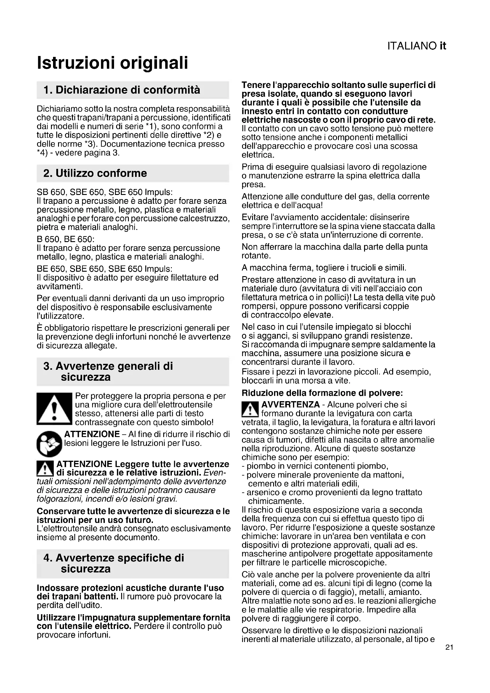 Istruzioni originali Dichiariamo sotto la nostra completa responsabilità che questi trapani/trapani a percussione, identificati dai modelli e numeri di serie *1), sono conformi a tutte le disposizioni pertinenti delle direttive *2) e delle norme *3). Documentazione tecnica presso *4) - vedere pagina 3. SB 650, SBE 650, SBE 650 Impuls: Il trapano a percussione è adatto per forare senza percussione metallo, legno, plastica e materiali analoghi e per forare con percussione calcestruzzo, pietra e materiali analoghi. B 650, BE 650: Il trapano è adatto per forare senza percussione metallo, legno, plastica e materiali analoghi. BE 650, SBE 650, SBE 650 Impuls: Il dispositivo è adatto per eseguire filettature ed avvitamenti. Per eventuali danni derivanti da un uso improprio del dispositivo è responsabile esclusivamente l'utilizzatore. È obbligatorio rispettare le prescrizioni generali per la prevenzione degli infortuni nonché le avvertenze di sicurezza allegate. Per proteggere la propria persona e per una migliore cura dell'elettroutensile stesso, attenersi alle parti di testo contrassegnate con questo simbolo! ATTENZIONE – Al fine di ridurre il rischio di lesioni leggere le Istruzioni per l'uso. ATTENZIONE Leggere tutte le avvertenze di sicurezza e le relative istruzioni. Even- tuali omissioni nell'adempimento delle avvertenze di sicurezza e delle istruzioni potranno causare folgorazioni, incendi e/o lesioni gravi. Conservare tutte le avvertenze di sicurezza e le istruzioni per un uso futuro. L'elettroutensile andrà consegnato esclusivamente insieme al presente documento. Indossare protezioni acustiche durante l'uso dei trapani battenti. Il rumore può provocare la perdita dell'udito. Utilizzare l'impugnatura supplementare fornita con l'utensile elettrico. Perdere il controllo può provocare infortuni. Tenere l'apparecchio soltanto sulle superfici di presa isolate, quando si eseguono lavori durante i quali è possibile che l'utensile da innesto entri in contatto con condutture elettriche nascoste o con il proprio cavo di rete. Il contatto con un cavo sotto tensione può mettere sotto tensione anche i componenti metallici dell'apparecchio e provocare così una scossa elettrica. Prima di eseguire qualsiasi lavoro di regolazione o manutenzione estrarre la spina elettrica dalla presa. Attenzione alle condutture del gas, della corrente elettrica e dell'acqua! Evitare l'avviamento accidentale: disinserire sempre l'interruttore se la spina viene staccata dalla presa, o se c'è stata un'interruzione di corrente. Non afferrare la macchina dalla parte della punta rotante. A macchina ferma, togliere i trucioli e simili. Prestare attenzione in caso di avvitatura in un materiale duro (avvitatura di viti nell'acciaio con filettatura metrica o in pollici)! La testa della vite può rompersi, oppure possono verificarsi coppie di contraccolpo elevate. Nel caso in cui l'utensile impiegato si blocchi o si agganci, si sviluppano grandi resistenze. Si raccomanda di impugnare sempre saldamente la macchina, assumere una posizione sicura e concentrarsi durante il lavoro. Fissare i pezzi in lavorazione piccoli. Ad esempio, bloccarli in una morsa a vite. Riduzione della formazione di polvere: AVVERTENZA - Alcune polveri che si formano durante la levigatura con carta vetrata, il taglio, la levigatura, la foratura e altri lavori contengono sostanze chimiche note per essere causa di tumori, difetti alla nascita o altre anomalie nella riproduzione. Alcune di queste sostanze chimiche sono per esempio: - piombo in vernici contenenti piombo, - polvere minerale proveniente da mattoni, cemento e altri materiali edili, - arsenico e cromo provenienti da legno trattato chimicamente. Il rischio di questa esposizione varia a seconda della frequenza con cui si effettua questo tipo di lavoro. Per ridurre l'esposizione a queste sostanze chimiche: lavorare in un'area ben ventilata e con dispositivi di protezione approvati, quali ad es. mascherine antipolvere progettate appositamente per filtrare le particelle microscopiche. Ciò vale anche per la polvere proveniente da altri materiali, come ad es. alcuni tipi di legno (come la polvere di quercia o di faggio), metalli, amianto. Altre malattie note sono ad es. le reazioni allergiche e le malattie alle vie respiratorie. Impedire alla polvere di raggiungere il corpo. Osservare le direttive e le disposizioni nazionali inerenti al materiale utilizzato, al personale, al tipo e