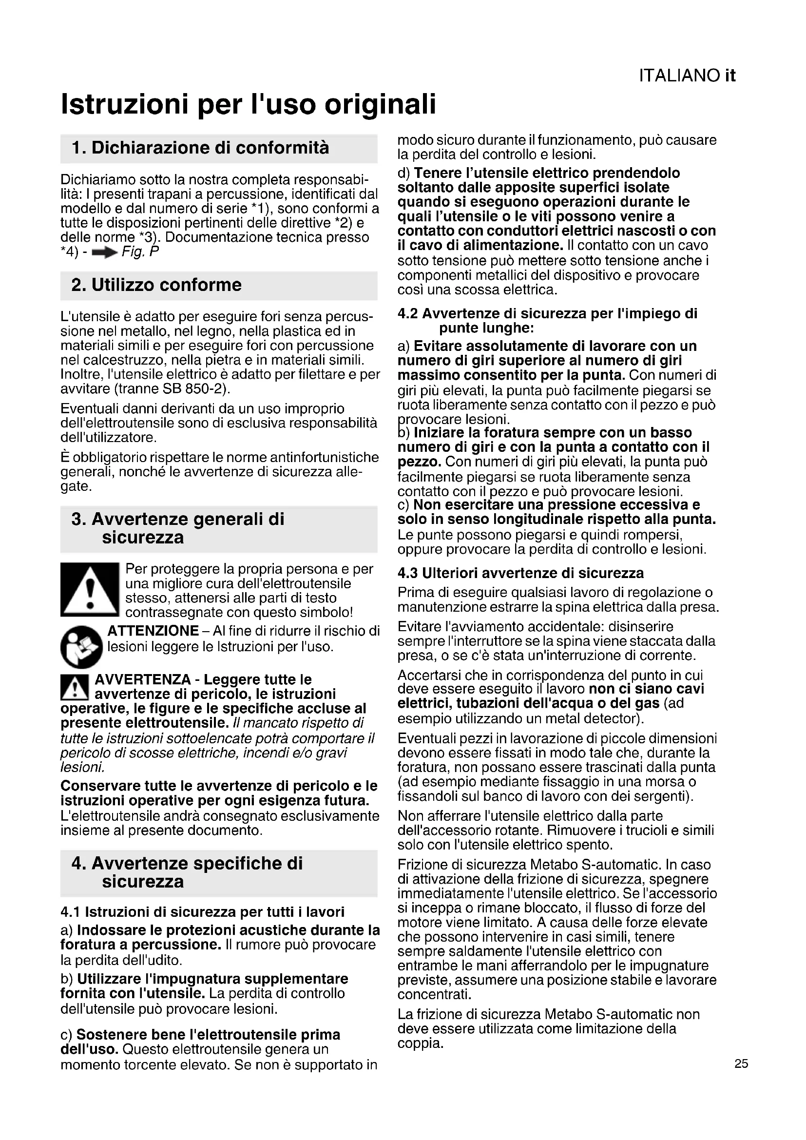 ig. P L'utensile è adatto per eseguire fori senza percus- sione nel metallo, nel legno, nella plastica ed in materiali simili e per eseguire fori con percussione nel calcestruzzo, nella pietra e in materiali simili. Inoltre, l'utensile elettrico è adatto per filettare e per avvitare (tranne SB 850-2). Eventuali danni derivanti da un uso improprio dell'elettroutensile sono di esclusiva responsabilità dell'utilizzatore. È obbligatorio rispettare le norme antinfortunistiche generali, nonché le avvertenze di sicurezza alle- gate. Per proteggere la propria persona e per una migliore cura dell'elettroutensile stesso, attenersi alle parti di testo contrassegnate con questo simbolo! ATTENZIONE – Al fine di ridurre il rischio di lesioni leggere le Istruzioni per l'uso. AVVERTENZA - Leggere tutte le avvertenze di pericolo, le istruzioni operative, le figure e le specifiche accluse al presente elettroutensile. Il mancato rispetto di tutte le istruzioni sottoelencate potrà comportare il pericolo di scosse elettriche, incendi e/o gravi lesioni. Conservare tutte le avvertenze di pericolo e le istruzioni operative per ogni esigenza futura. L'elettroutensile andrà consegnato esclusivamente insieme al presente documento.