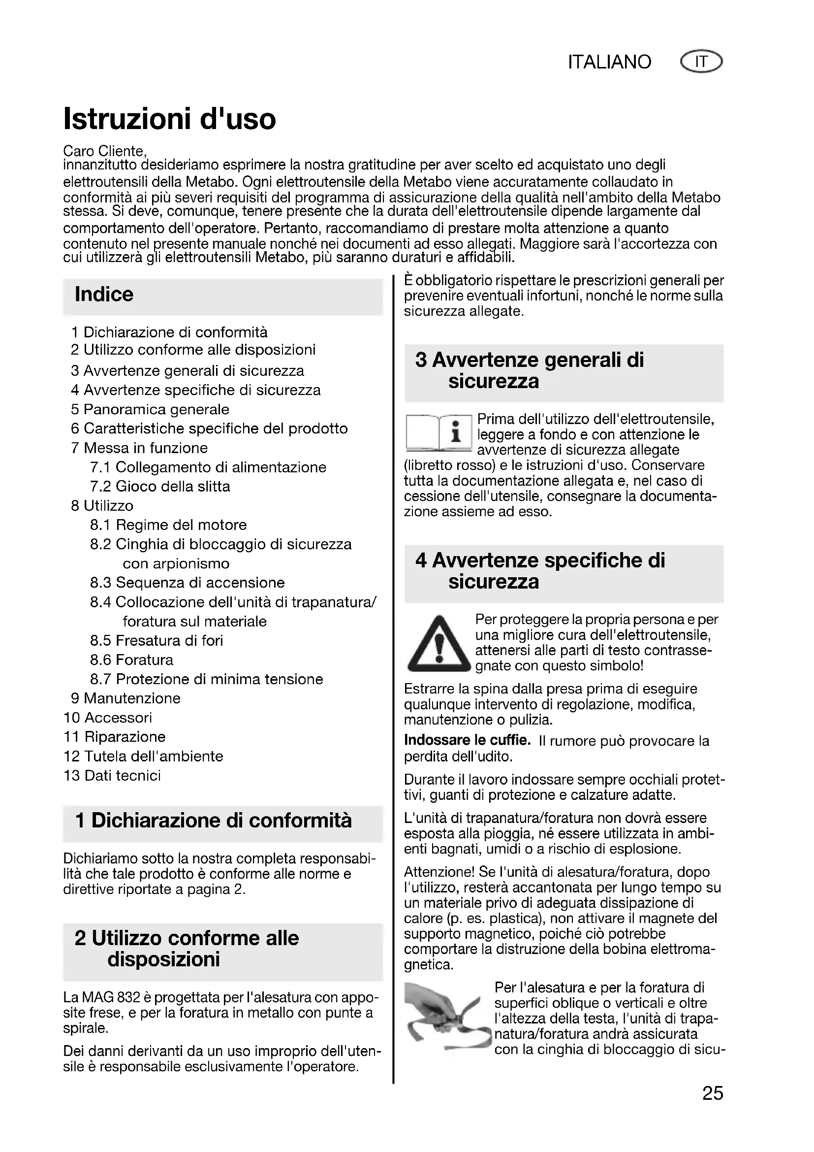 9 Manutenzione 10 Accessori 11 Riparazione 12 Tutela dell'ambiente 13 Dati tecnici Dichiariamo sotto la nostra completa responsabi- lità che tale prodotto è conforme alle norme e direttive riportate a pagina 2. La MAG 832 è progettata per l'alesatura con appo- site frese, e per la foratura in metallo con punte a spirale. Dei danni derivanti da un uso improprio dell'uten- sile è responsabile esclusivamente l'operatore. È obbligatorio rispettare le prescrizioni generali per prevenire eventuali infortuni, nonché le norme sulla sicurezza allegate. Prima dell'utilizzo dell'elettroutensile, leggere a fondo e con attenzione le avvertenze di sicurezza allegate (libretto rosso) e le istruzioni d'uso. Conservare tutta la documentazione allegata e, nel caso di cessione dell'utensile, consegnare la documenta- zione assieme ad esso. Per proteggere la propria persona e per una migliore cura dell'elettroutensile, attenersi alle parti di testo contrasse- gnate con questo simbolo! Estrarre la spina dalla presa prima di eseguire qualunque intervento di regolazione, modifica, manutenzione o pulizia. Indossare le cuffie. Il rumore può provocare la perdita dell'udito. Durante il lavoro indossare sempre occhiali protet- tivi, guanti di protezione e calzature adatte. L'unità di trapanatura/foratura non dovrà essere esposta alla pioggia, né essere utilizzata in ambi- enti bagnati, umidi o a rischio di esplosione. Attenzione! Se l'unità di alesatura/foratura, dopo l'utilizzo, resterà accantonata per lungo tempo su un materiale privo di adeguata dissipazione di calore (p. es. plastica), non attivare il magnete del supporto magnetico, poiché ciò potrebbe comportare la distruzione della bobina elettroma- gnetica. Per l'alesatura e per la foratura di superfici oblique o verticali e oltre l'altezza della testa, l'unità di trapa- natura/foratura andrà assicurata con la cinghia di bloccaggio di sicu- Istruzioni d'uso Caro Cliente, innanzitutto desideriamo esprimere la nostra gratitudine per aver scelto ed acquistato uno degli elettroutensili della Metabo. Ogni elettroutensile della Metabo viene accuratamente collaudato in conformità ai più severi requisiti del programma di assicurazione della qualità nell'ambito della Metabo stessa. Si deve, comunque, tenere presente che la durata dell'elettroutensile dipende largamente dal comportamento dell'operatore. Pertanto, raccomandiamo di prestare molta attenzione a quanto contenuto nel presente manuale nonché nei documenti ad esso allegati. Maggiore sarà l'accortezza con cui utilizzerà gli elettroutensili Metabo, più saranno duraturi e affidabili. Indice 1 Dichiarazione di conformità 2 Utilizzo conforme alle disposizioni 3 Avvertenze generali di sicurezza 4 Avvertenze specifiche di sicurezza 170 22 3900 - MAG.book Seite 25 Donnerstag, 27. Oktober 2005 11:39 1126 ITALIANO
