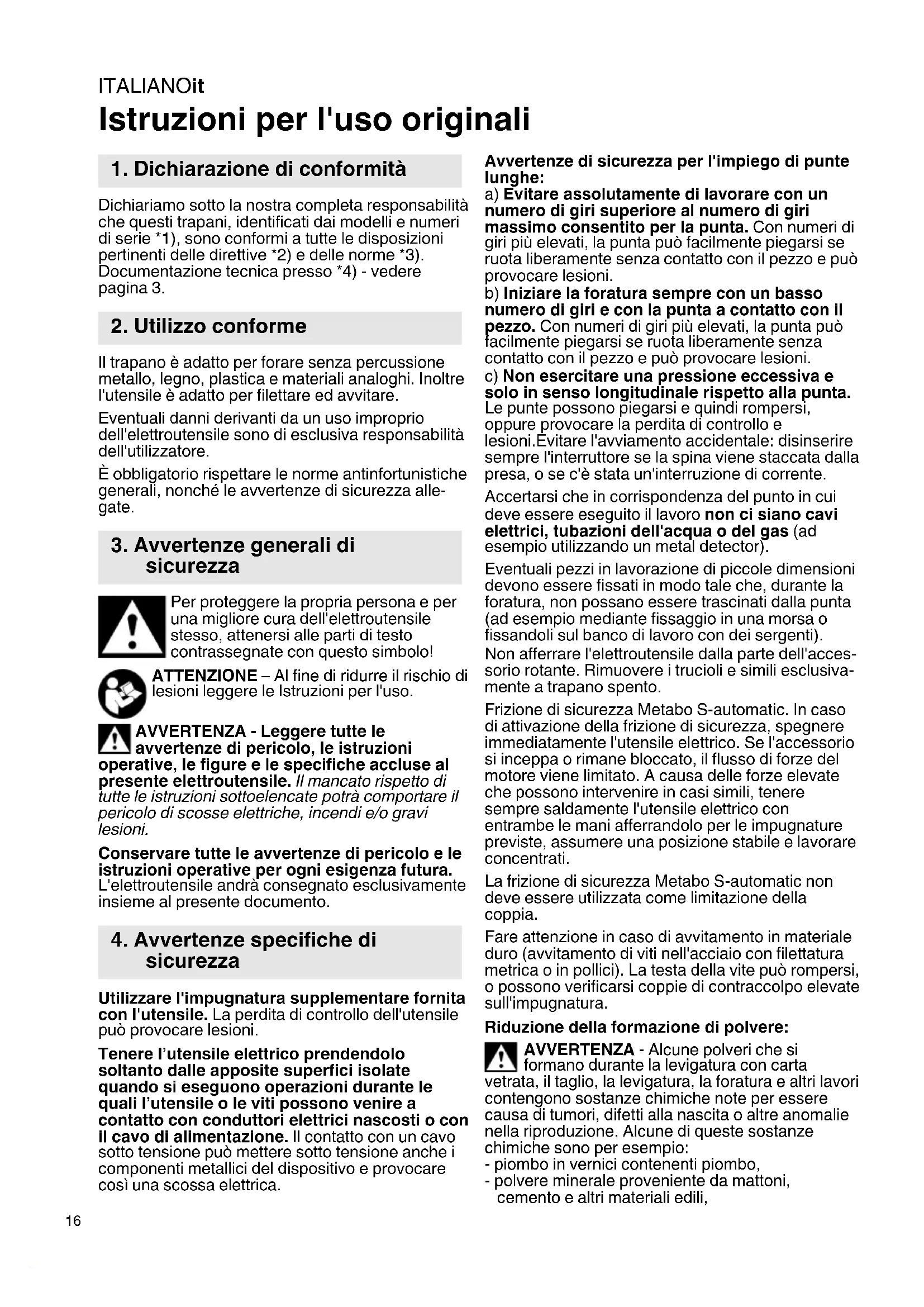 Istruzioni per l'uso originali Dichiariamo sotto la nostra completa responsabilità che questi trapani, identificati dai modelli e numeri di serie *1), sono conformi a tutte le disposizioni pertinenti delle direttive *2) e delle norme *3). Documentazione tecnica presso *4) - vedere pagina 3. Il trapano è adatto per forare senza percussione metallo, legno, plastica e materiali analoghi. Inoltre l'utensile è adatto per filettare ed avvitare. Eventuali danni derivanti da un uso improprio dell'elettroutensile sono di esclusiva responsabilità dell'utilizzatore. È obbligatorio rispettare le norme antinfortunistiche generali, nonché le avvertenze di sicurezza alle- gate. Per proteggere la propria persona e per una migliore cura dell'elettroutensile stesso, attenersi alle parti di testo contrassegnate con questo simbolo! ATTENZIONE – Al fine di ridurre il rischio di lesioni leggere le Istruzioni per l'uso. AVVERTENZA - Leggere tutte le avvertenze di pericolo, le istruzioni operative, le figure e le specifiche accluse al presente elettroutensile. Il mancato rispetto di tutte le istruzioni sottoelencate potrà comportare il pericolo di scosse elettriche, incendi e/o gravi lesioni. Conservare tutte le avvertenze di pericolo e le istruzioni operative per ogni esigenza futura. L'elettroutensile andrà consegnato esclusivamente insieme al presente documento. Utilizzare l'impugnatura supplementare fornita con l'utensile. La perdita di controllo dell'utensile può provocare lesioni. Tenere l’utensile elettrico prendendolo soltanto dalle apposite superfici isolate quando si eseguono operazioni durante le quali l’utensile o le viti possono venire a contatto con conduttori elettrici nascosti o con il cavo di alimentazione. Il contatto con un cavo sotto tensione può mettere sotto tensione anche i componenti metallici del dispositivo e provocare così una scossa elettrica. Avvertenze di sicurezza per l'impiego di punte lunghe: a) Evitare assolutamente di lavorare con un numero di giri superiore al numero di giri massimo consentito per la punta. Con numeri di giri più elevati, la punta può facilmente piegarsi se ruota liberamente senza contatto con il pezzo e può provocare lesioni. b) Iniziare la foratura sempre con un basso numero di giri e con la punta a contatto con il pezzo. Con numeri di giri più elevati, la punta può facilmente piegarsi se ruota liberamente senza contatto con il pezzo e può provocare lesioni. c) Non esercitare una pressione eccessiva e solo in senso longitudinale rispetto alla punta. Le punte possono piegarsi e quindi rompersi, oppure provocare la perdita di controllo e lesioni.Evitare l'avviamento accidentale: disinserire sempre l'interruttore se la spina viene staccata dalla presa, o se c'è stata un'interruzione di corrente. Accertarsi che in corrispondenza del punto in cui deve essere eseguito il lavoro non ci siano cavi elettrici, tubazioni dell'acqua o del gas (ad esempio utilizzando un metal detector). Eventuali pezzi in lavorazione di piccole dimensioni devono essere fissati in modo tale che, durante la foratura, non possano essere trascinati dalla punta (ad esempio mediante fissaggio in una morsa o fissandoli sul banco di lavoro con dei sergenti). Non afferrare l'elettroutensile dalla parte dell'acces- sorio rotante. Rimuovere i trucioli e simili esclusiva- mente a trapano spento. Frizione di sicurezza Metabo S-automatic. In caso di attivazione della frizione di sicurezza, spegnere immediatamente l'utensile elettrico. Se l'accessorio si inceppa o rimane bloccato, il flusso di forze del motore viene limitato. A causa delle forze elevate che possono intervenire in casi simili, tenere sempre saldamente l'utensile elettrico con entrambe le mani afferrandolo per le impugnature previste, assumere una posizione stabile e lavorare concentrati. La frizione di sicurezza Metabo S-automatic non deve essere utilizzata come limitazione della coppia. Fare attenzione in caso di avvitamento in materiale duro (avvitamento di viti nell'acciaio con filettatura metrica o in pollici). La testa della vite può rompersi, o possono verificarsi coppie di contraccolpo elevate sull'impugnatura. Riduzione della formazione di polvere: AVVERTENZA - Alcune polveri che si formano durante la levigatura con carta vetrata, il taglio, la levigatura, la foratura e altri lavori contengono sostanze chimiche note per essere causa di tumori, difetti alla nascita o altre anomalie nella riproduzione. Alcune di queste sostanze chimiche sono per esempio: - piombo in vernici contenenti piombo, - polvere minerale proveniente da mattoni, cemento e altri materiali edili,