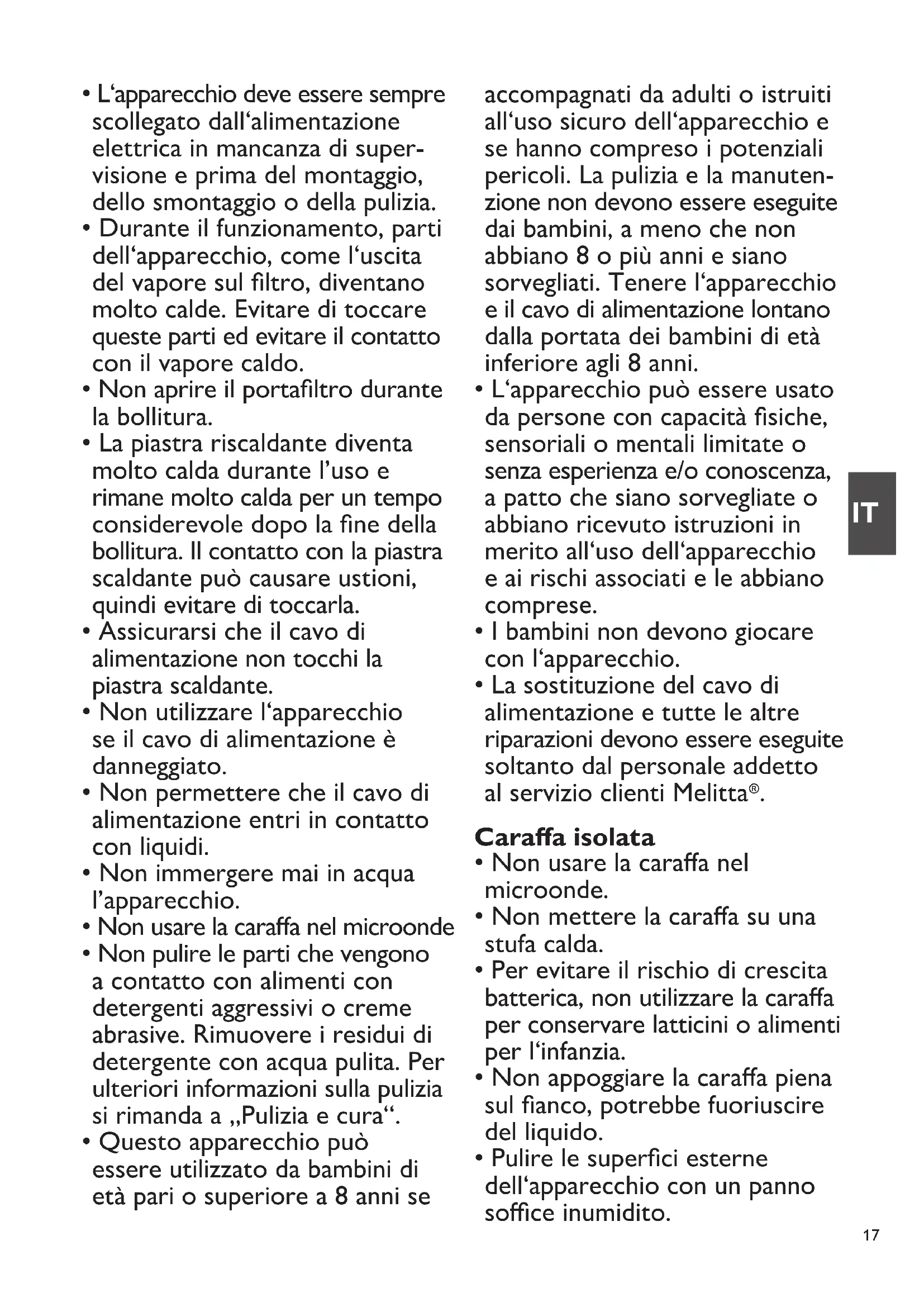 - Lasostituzionedelcavodi alimentazione e tutte le altre riparazioni devono essere eseguite soltanto dal personale addetto al servizio clienti Melitta