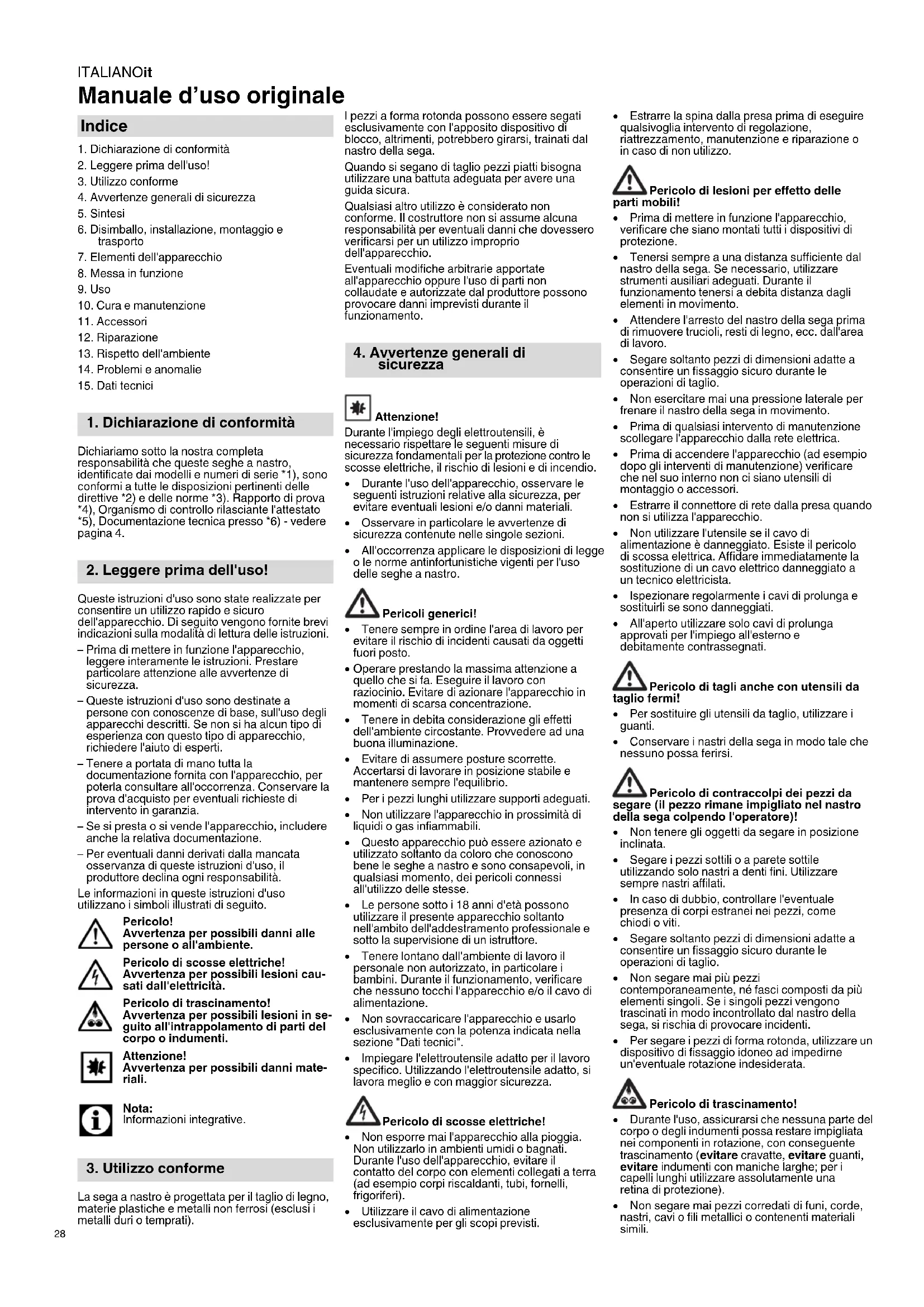 Dichiariamo sotto la nostra completa responsabilità che queste seghe a nastro, identificate dai modelli e numeri di serie *1), sono conformi a tutte le disposizioni pertinenti delle direttive *2) e delle norme *3). Rapporto di prova *4), Organismo di controllo rilasciante l'attestato *5), Documentazione tecnica presso *6) - vedere pagina 4. Queste istruzioni d'uso sono state realizzate per consentire un utilizzo rapido e sicuro dell'apparecchio. Di seguito vengono fornite brevi indicazioni sulla modalità di lettura delle istruzioni. – Prima di mettere in funzione l'apparecchio, leggere interamente le istruzioni. Prestare particolare attenzione alle avvertenze di sicurezza. – Queste istruzioni d'uso sono destinate a persone con conoscenze di base, sull'uso degli apparecchi descritti. Se non si ha alcun tipo di esperienza con questo tipo di apparecchio, richiedere l'aiuto di esperti. – Tenere a portata di mano tutta la documentazione fornita con l'apparecchio, per poterla consultare all'occorrenza. Conservare la prova d'acquisto per eventuali richieste di intervento in garanzia. – Se si presta o si vende l'apparecchio, includere anche la relativa documentazione. – Per eventuali danni derivati dalla mancata osservanza di queste istruzioni d'uso, il produttore declina ogni responsabilità. Le informazioni in queste istruzioni d'uso utilizzano i simboli illustrati di seguito. Pericolo! Avvertenza per possibili danni alle persone o all'ambiente. Pericolo di scosse elettriche! Avvertenza per possibili lesioni cau- sati dall'elettricità. Pericolo di trascinamento! Avvertenza per possibili lesioni in se- guito all'intrappolamento di parti del corpo o indumenti. Attenzione! Avvertenza per possibili danni mate- riali. Nota: Informazioni integrative. La sega a nastro è progettata per il taglio di legno, materie plastiche e metalli non ferrosi (esclusi i metalli duri o temprati). I pezzi a forma rotonda possono essere segati esclusivamente con l'apposito dispositivo di blocco, altrimenti, potrebbero girarsi, trainati dal nastro della sega. Quando si segano di taglio pezzi piatti bisogna utilizzare una battuta adeguata per avere una guida sicura. Qualsiasi altro utilizzo è considerato non conforme. Il costruttore non si assume alcuna responsabilità per eventuali danni che dovessero verificarsi per un utilizzo improprio dell'apparecchio. Eventuali modifiche arbitrarie apportate all'apparecchio oppure l'uso di parti non collaudate e autorizzate dal produttore possono provocare danni imprevisti durante il funzionamento. Attenzione! Durante l'impiego degli elettroutensili, è necessario rispettare le seguenti misure di sicurezza fondamentali per la protezione contro le scosse elettriche, il rischio di lesioni e di incendio. Durante l'uso dell'apparecchio, osservare le seguenti istruzioni relative alla sicurezza, per evitare eventuali lesioni e/o danni materiali. Osservare in particolare le avvertenze di sicurezza contenute nelle singole sezioni. All'occorrenza applicare le disposizioni di legge o le norme antinfortunistiche vigenti per l'uso delle seghe a nastro. Pericoli generici! Tenere sempre in ordine l'area di lavoro per evitare il rischio di incidenti causati da oggetti fuori posto.