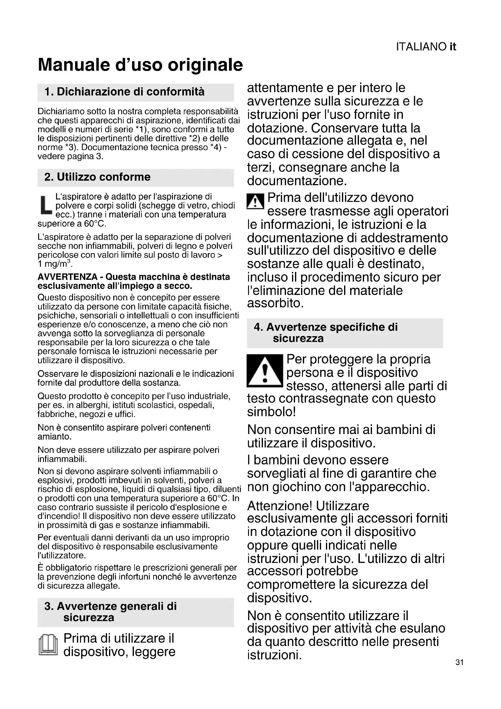 Manuale d’uso originale Dichiariamo sotto la nostra completa responsabilità che questi apparecchi di aspirazione, identificati dai modelli e numeri di serie *1), sono conformi a tutte le disposizioni pertinenti delle direttive *2) e delle norme *3). Documentazione tecnica presso *4) - vedere pagina 3. L'aspiratore è adatto per l'aspirazione di polvere e corpi solidi (schegge di vetro, chiodi ecc.) tranne i materiali con una temperatura superiore a 60°C. L'aspiratore è adatto per la separazione di polveri secche non infiammabili, polveri di legno e polveri pericolose con valori limite sul posto di lavoro > 1 mg/m³. AVVERTENZA - Questa macchina è destinata esclusivamente all'impiego a secco. Questo dispositivo non è concepito per essere utilizzato da persone con limitate capacità fisiche, psichiche, sensoriali o intellettuali o con insufficienti esperienze e/o conoscenze, a meno che ciò non avvenga sotto la sorveglianza di personale responsabile per la loro sicurezza o che tale personale fornisca le istruzioni necessarie per utilizzare il dispositivo. Osservare le disposizioni nazionali e le indicazioni fornite dal produttore della sostanza. Questo prodotto è concepito per l’uso industriale, per es. in alberghi, istituti scolastici, ospedali, fabbriche, negozi e uffici. Non è consentito aspirare polveri contenenti amianto. Non deve essere utilizzato per aspirare polveri infiammabili. Non si devono aspirare solventi infiammabili o esplosivi, prodotti imbevuti in solventi, polveri a rischio di esplosione, liquidi di qualsiasi tipo, diluenti o prodotti con una temperatura superiore a 60°C. In caso contrario sussiste il pericolo d'esplosione e d'incendio! Il dispositivo non deve essere utilizzato in prossimità di gas e sostanze infiammabili. Per eventuali danni derivanti da un uso improprio del dispositivo è responsabile esclusivamente l'utilizzatore. È obbligatorio rispettare le prescrizioni generali per la prevenzione degli infortuni nonché le avvertenze di sicurezza allegate. Prima di utilizzare il dispositivo, leggere attentamente e per intero le avvertenze sulla sicurezza e le istruzioni per l'uso fornite in dotazione. Conservare tutta la documentazione allegata e, nel caso di cessione del dispositivo a terzi, consegnare anche la documentazione. Prima dell'utilizzo devono essere trasmesse agli operatori le informazioni, le istruzioni e la documentazione di addestramento sull'utilizzo del dispositivo e delle sostanze alle quali è destinato, incluso il procedimento sicuro per l'eliminazione del materiale assorbito. Per proteggere la propria persona e il dispositivo stesso, attenersi alle parti di testo contrassegnate con questo simbolo! Non consentire mai ai bambini di utilizzare il dispositivo. I bambini devono essere sorvegliati al fine di garantire che non giochino con l'apparecchio. Attenzione! Utilizzare esclusivamente gli accessori forniti in dotazione con il dispositivo oppure quelli indicati nelle istruzioni per l'uso. L'utilizzo di altri accessori potrebbe compromettere la sicurezza del dispositivo. Non è consentito utilizzare il dispositivo per attività che esulano da quanto descritto nelle presenti istruzioni.