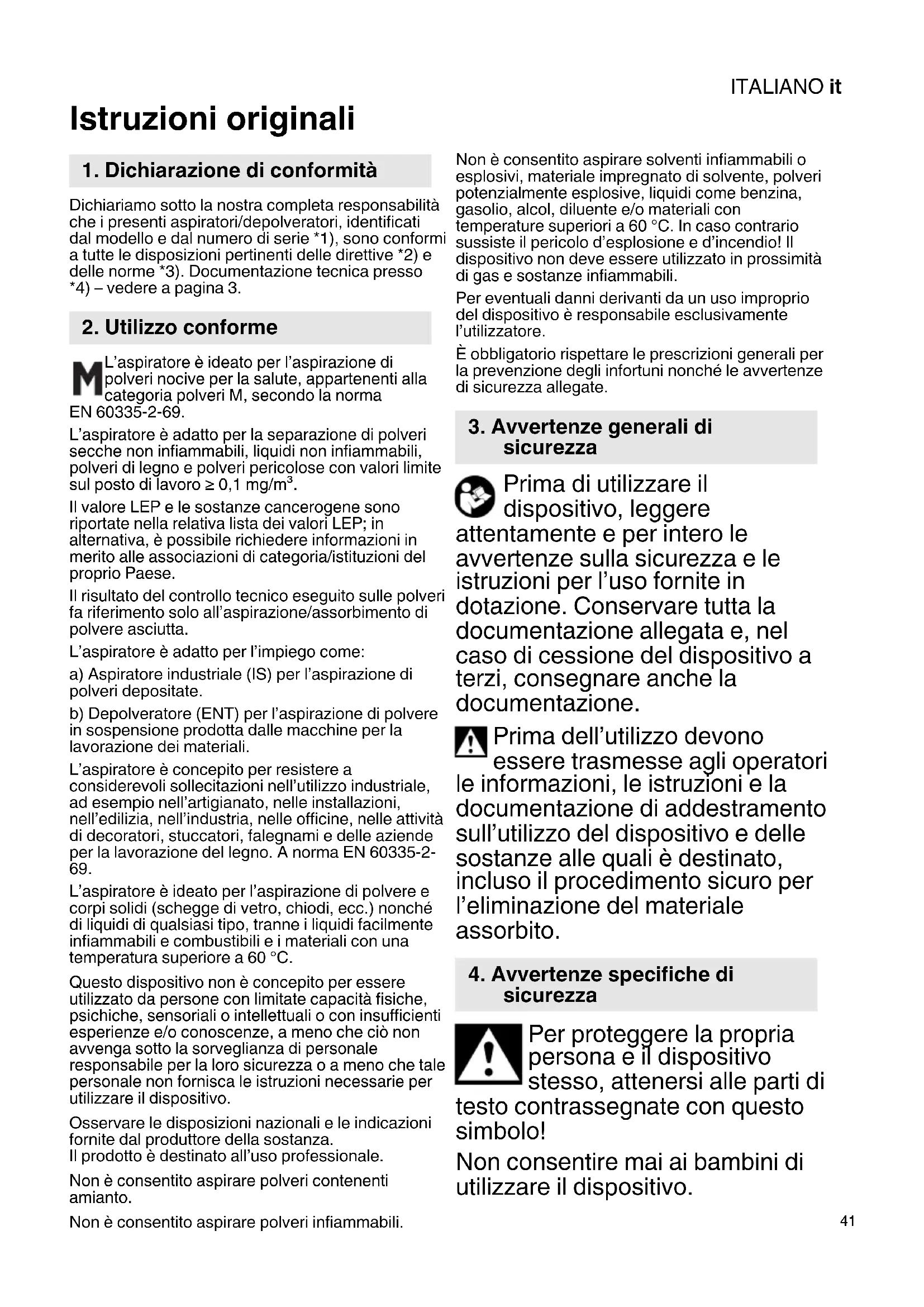 Istruzioni originali Dichiariamo sotto la nostra completa responsabilità che i presenti aspiratori/depolveratori, identificati dal modello e dal numero di serie *1), sono conformi a tutte le disposizioni pertinenti delle direttive *2) e delle norme *3). Documentazione tecnica presso *4) – vedere a pagina 3. L’aspiratore è ideato per l’aspirazione di polveri nocive per la salute, appartenenti alla categoria polveri M, secondo la norma EN 60335-2-69. L’aspiratore è adatto per la separazione di polveri secche non infiammabili, liquidi non infiammabili, polveri di legno e polveri pericolose con valori limite sul posto di lavoro ≥ 0,1 mg/m³. Il valore LEP e le sostanze cancerogene sono riportate nella relativa lista dei valori LEP; in alternativa, è possibile richiedere informazioni in merito alle associazioni di categoria/istituzioni del proprio Paese. Il risultato del controllo tecnico eseguito sulle polveri fa riferimento solo all’aspirazione/assorbimento di polvere asciutta. L’aspiratore è adatto per l’impiego come: a) Aspiratore industriale (IS) per l’aspirazione di polveri depositate. b) Depolveratore (ENT) per l’aspirazione di polvere in sospensione prodotta dalle macchine per la lavorazione dei materiali. L’aspiratore è concepito per resistere a considerevoli sollecitazioni nell’utilizzo industriale, ad esempio nell’artigianato, nelle installazioni, nell’edilizia, nell’industria, nelle officine, nelle attività di decoratori, stuccatori, falegnami e delle aziende per la lavorazione del legno. A norma EN 60335-2-