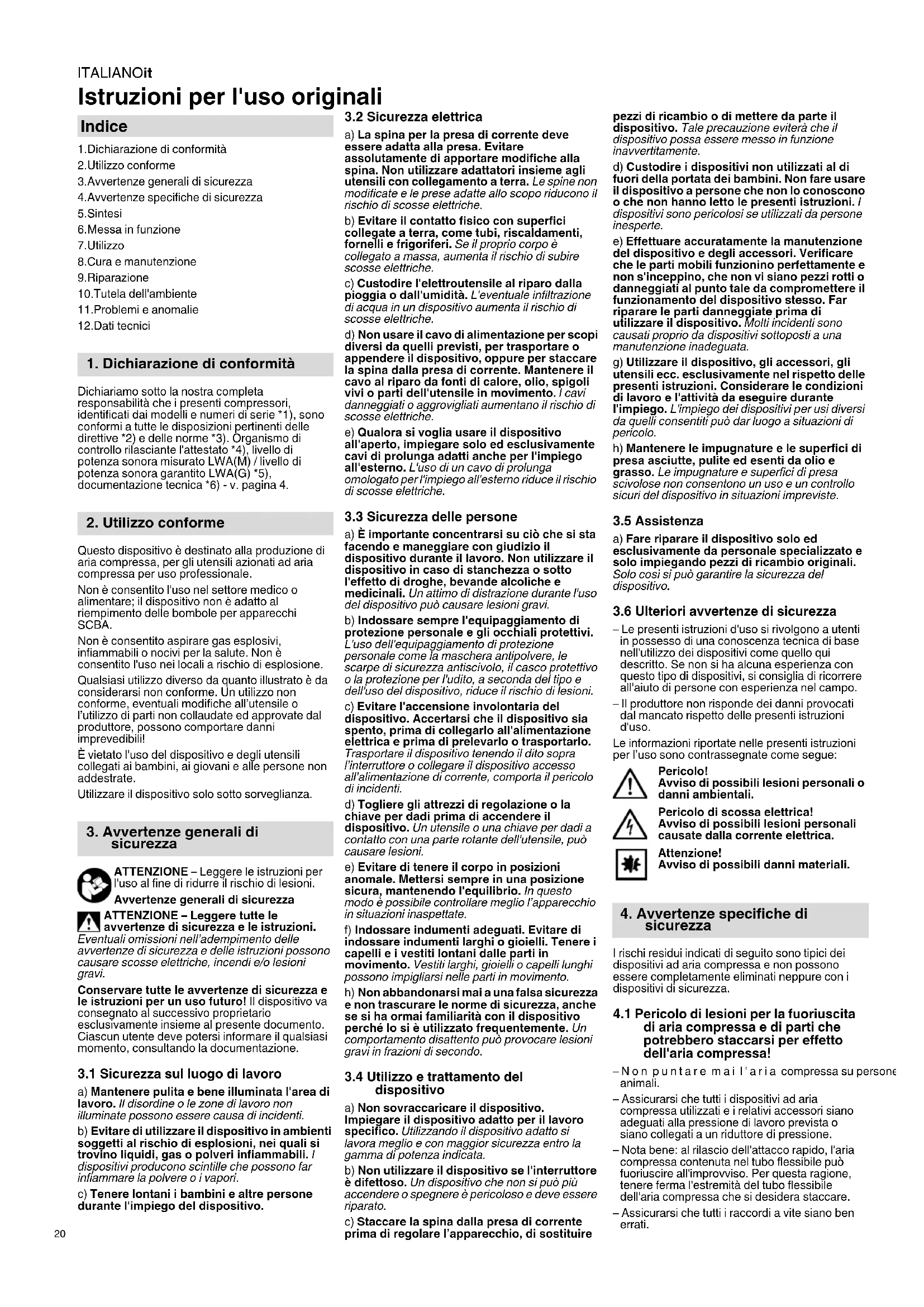 Istruzioni per l'uso originali 1.Dichiarazione di conformità 2.Utilizzo conforme 3.Avvertenze generali di sicurezza 4.Avvertenze specifiche di sicurezza 5.Sintesi 6.Messa in funzione 7.Utilizzo 8.Cura e manutenzione 9.Riparazione 10.Tutela dell'ambiente 11.Problemi e anomalie 12.Dati tecnici Dichiariamo sotto la nostra completa responsabilità che i presenti compressori, identificati dai modelli e numeri di serie *1), sono conformi a tutte le disposizioni pertinenti delle direttive *2) e delle norme *3). Organismo di controllo rilasciante l'attestato *4), livello di potenza sonora misurato LWA(M) / livello di potenza sonora garantito LWA(G) *5), documentazione tecnica *6) - v. pagina 4. Questo dispositivo è destinato alla produzione di aria compressa, per gli utensili azionati ad aria compressa per uso professionale. Non è consentito l'uso nel settore medico o alimentare; il dispositivo non è adatto al riempimento delle bombole per apparecchi SCBA. Non è consentito aspirare gas esplosivi, infiammabili o nocivi per la salute. Non è consentito l'uso nei locali a rischio di esplosione. Qualsiasi utilizzo diverso da quanto illustrato è da considerarsi non conforme. Un utilizzo non conforme, eventuali modifiche all’utensile o l’utilizzo di parti non collaudate ed approvate dal produttore, possono comportare danni imprevedibili! È vietato l'uso del dispositivo e degli utensili collegati ai bambini, ai giovani e alle persone non addestrate. Utilizzare il dispositivo solo sotto sorveglianza. ATTENZIONE – Leggere le istruzioni per l'uso al fine di ridurre il rischio di lesioni. Avvertenze generali di sicurezza ATTENZIONE – Leggere tutte le avvertenze di sicurezza e le istruzioni. Eventuali omissioni nell’adempimento delle avvertenze di sicurezza e delle istruzioni possono causare scosse elettriche, incendi e/o lesioni gravi. Conservare tutte le avvertenze di sicurezza e le istruzioni per un uso futuro! Il dispositivo va consegnato al successivo proprietario esclusivamente insieme al presente documento. Ciascun utente deve potersi informare il qualsiasi momento, consultando la documentazione.