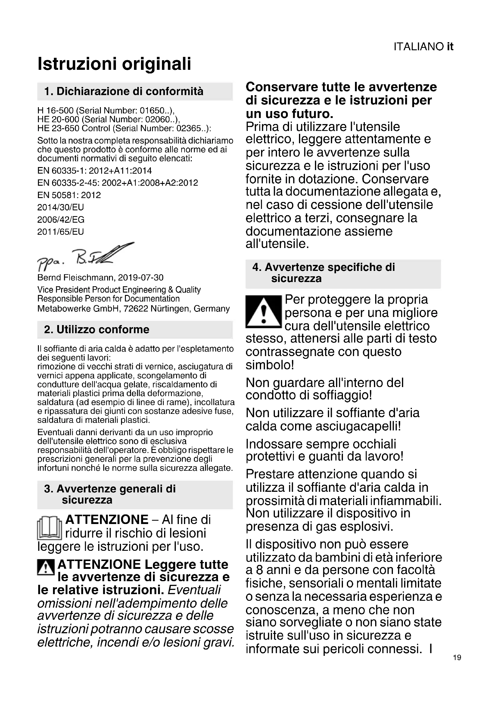 Istruzioni originali H 16-500 (Serial Number: 01650..), HE 20-600 (Serial Number: 02060..), HE 23-650 Control (Serial Number: 02365..): Sotto la nostra completa responsabilità dichiariamo che questo prodotto è conforme alle norme ed ai documenti normativi di seguito elencati: EN 60335-1: 2012+A11:2014 EN 60335-2-45: 2002+A1:2008+A2:2012 EN 50581: 2012 2014/30/EU 2006/42/EG 2011/65/EU Bernd Fleischmann, 2019-07-30 Vice President Product Engineering & Quality Responsible Person for Documentation Metabowerke GmbH, 72622 Nürtingen, Germany Il soffiante di aria calda è adatto per l'espletamento dei seguenti lavori: rimozione di vecchi strati di vernice, asciugatura di vernici appena applicate, scongelamento di condutture dell'acqua gelate, riscaldamento di materiali plastici prima della deformazione, saldatura (ad esempio di linee di rame), incollatura e ripassatura dei giunti con sostanze adesive fuse, saldatura di materiali plastici. Eventuali danni derivanti da un uso improprio dell'utensile elettrico sono di esclusiva responsabilità dell'operatore. È obbligo rispettare le prescrizioni generali per la prevenzione degli infortuni nonché le norme sulla sicurezza allegate. ATTENZIONE – Al fine di ridurre il rischio di lesioni leggere le istruzioni per l'uso. ATTENZIONE Leggere tutte le avvertenze di sicurezza e le relative istruzioni. Eventuali omissioni nell'adempimento delle avvertenze di sicurezza e delle istruzioni potranno causare scosse elettriche, incendi e/o lesioni gravi. Conservare tutte le avvertenze di sicurezza e le istruzioni per un uso futuro. Prima di utilizzare l'utensile elettrico, leggere attentamente e per intero le avvertenze sulla sicurezza e le istruzioni per l'uso fornite in dotazione. Conservare tutta la documentazione allegata e, nel caso di cessione dell'utensile elettrico a terzi, consegnare la documentazione assieme all'utensile. Per proteggere la propria persona e per una migliore cura dell'utensile elettrico stesso, attenersi alle parti di testo contrassegnate con questo simbolo! Non guardare all'interno del condotto di soffiaggio! Non utilizzare il soffiante d'aria calda come asciugacapelli! Indossare sempre occhiali protettivi e guanti da lavoro! Prestare attenzione quando si utilizza il soffiante d'aria calda in prossimità di materiali infiammabili. Non utilizzare il dispositivo in presenza di gas esplosivi. Il dispositivo non può essere utilizzato da bambini di età inferiore a 8 anni e da persone con facoltà fisiche, sensoriali o mentali limitate o senza la necessaria esperienza e conoscenza, a meno che non siano sorvegliate o non siano state istruite sull'uso in sicurezza e informate sui pericoli connessi. I