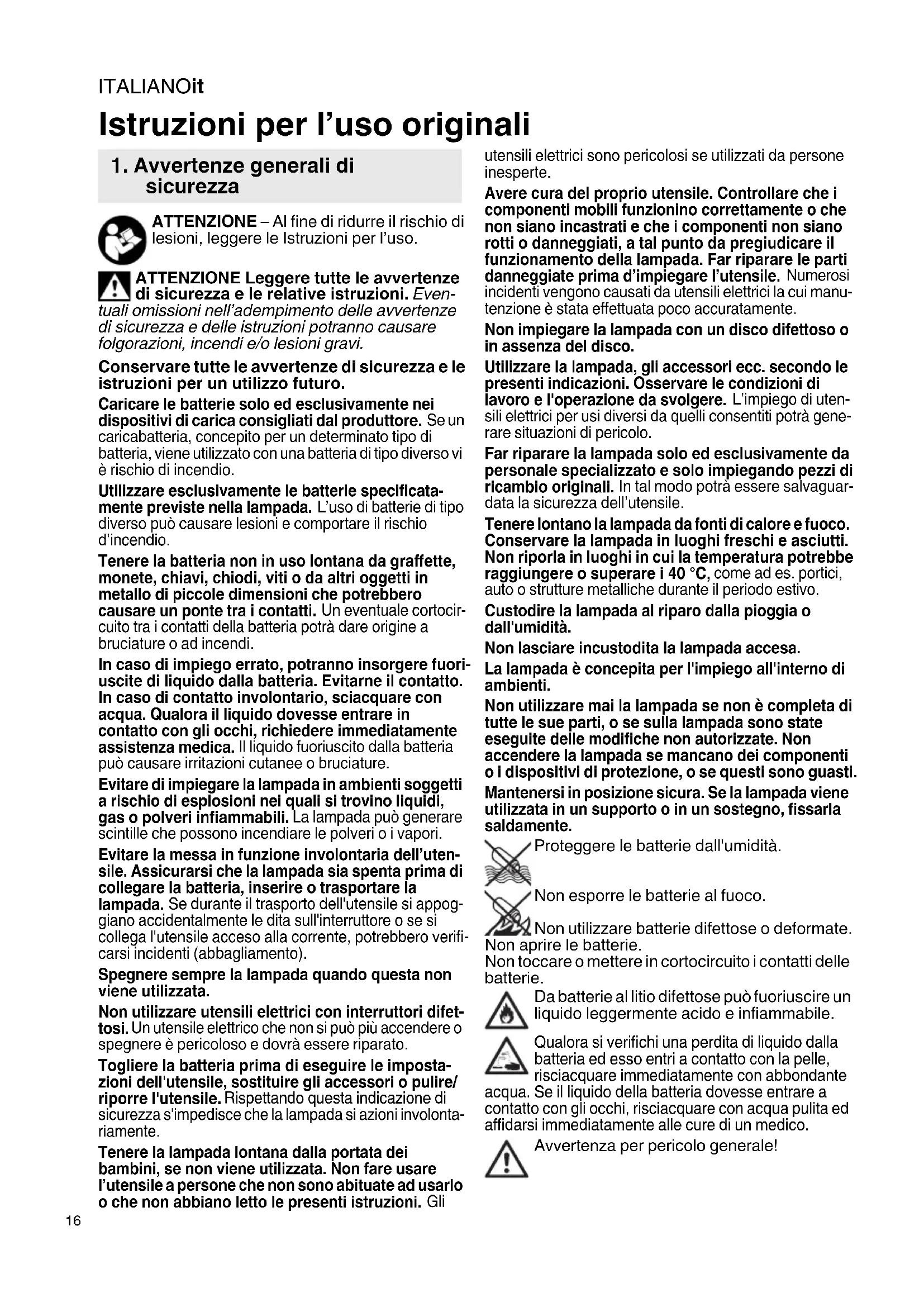 ATTENZIONE – Al fine di ridurre il rischio di lesioni, leggere le Istruzioni per l’uso. ATTENZIONE Leggere tutte le avvertenze di sicurezza e le relative istruzioni. Even- tuali omissioni nell’adempimento delle avvertenze di sicurezza e delle istruzioni potranno causare folgorazioni, incendi e/o lesioni gravi. Conservare tutte le avvertenze di sicurezza e le istruzioni per un utilizzo futuro. Caricare le batterie solo ed esclusivamente nei dispositivi di carica consigliati dal produttore. Se un caricabatteria, concepito per un determinato tipo di batteria, viene utilizzato con una batteria di tipo diverso vi è rischio di incendio. Utilizzare esclusivamente le batterie specificata- mente previste nella lampada. L’uso di batterie di tipo diverso può causare lesioni e comportare il rischio d’incendio. Tenere la batteria non in uso lontana da graffette, monete, chiavi, chiodi, viti o da altri oggetti in metallo di piccole dimensioni che potrebbero causare un ponte tra i contatti. Un eventuale cortocir- cuito tra i contatti della batteria potrà dare origine a bruciature o ad incendi. In caso di impiego errato, potranno insorgere fuori- uscite di liquido dalla batteria. Evitarne il contatto. In caso di contatto involontario, sciacquare con acqua. Qualora il liquido dovesse entrare in contatto con gli occhi, richiedere immediatamente assistenza medica. Il liquido fuoriuscito dalla batteria può causare irritazioni cutanee o bruciature. Evitare di impiegare la lampada in ambienti soggetti a rischio di esplosioni nei quali si trovino liquidi, gas o polveri infiammabili. La lampada può generare scintille che possono incendiare le polveri o i vapori. Evitare la messa in funzione involontaria dell’uten- sile. Assicurarsi che la lampada sia spenta prima di collegare la batteria, inserire o trasportare la lampada. Se durante il trasporto dell'utensile si appog- giano accidentalmente le dita sull'interruttore o se si collega l'utensile acceso alla corrente, potrebbero verifi- carsi incidenti (abbagliamento). Spegnere sempre la lampada quando questa non viene utilizzata. Non utilizzare utensili elettrici con interruttori difet- tosi. Un utensile elettrico che non si può più accendere o spegnere è pericoloso e dovrà essere riparato. Togliere la batteria prima di eseguire le imposta- zioni dell'utensile, sostituire gli accessori o pulire/ riporre l'utensile. Rispettando questa indicazione di sicurezza s'impedisce che la lampada si azioni involonta- riamente. Tenere la lampada lontana dalla portata dei bambini, se non viene utilizzata. Non fare usare l’utensile a persone che non sono abituate ad usarlo o che non abbiano letto le presenti istruzioni. Gli utensili elettrici sono pericolosi se utilizzati da persone inesperte. Avere cura del proprio utensile. Controllare che i componenti mobili funzionino correttamente o che non siano incastrati e che i componenti non siano rotti o danneggiati, a tal punto da pregiudicare il funzionamento della lampada. Far riparare le parti danneggiate prima d’impiegare l’utensile. Numerosi incidenti vengono causati da utensili elettrici la cui manu- tenzione è stata effettuata poco accuratamente. Non impiegare la lampada con un disco difettoso o in assenza del disco. Utilizzare la lampada, gli accessori ecc. secondo le presenti indicazioni. Osservare le condizioni di lavoro e l'operazione da svolgere. L’impiego di uten- sili elettrici per usi diversi da quelli consentiti potrà gene- rare situazioni di pericolo. Far riparare la lampada solo ed esclusivamente da personale specializzato e solo impiegando pezzi di ricambio originali. In tal modo potrà essere salvaguar- data la sicurezza dell’utensile. Tenere lontano la lampada da fonti di calore e fuoco. Conservare la lampada in luoghi freschi e asciutti. Non riporla in luoghi in cui la temperatura potrebbe raggiungere o superare i 40 °C, come ad es. portici, auto o strutture metalliche durante il periodo estivo. Custodire la lampada al riparo dalla pioggia o dall'umidità. Non lasciare incustodita la lampada accesa. La lampada è concepita per l'impiego all'interno di ambienti. Non utilizzare mai la lampada se non è completa di tutte le sue parti, o se sulla lampada sono state eseguite delle modifiche non autorizzate. Non accendere la lampada se mancano dei componenti o i dispositivi di protezione, o se questi sono guasti. Mantenersi in posizione sicura. Se la lampada viene utilizzata in un supporto o in un sostegno, fissarla saldamente. Proteggere le batterie dall'umidità. Non esporre le batterie al fuoco. Non utilizzare batterie difettose o deformate. Non aprire le batterie. Non toccare o mettere in cortocircuito i contatti delle batterie. Da batterie al litio difettose può fuoriuscire un liquido leggermente acido e infiammabile. Qualora si verifichi una perdita di liquido dalla batteria ed esso entri a contatto con la pelle, risciacquare immediatamente con abbondante acqua. Se il liquido della batteria dovesse entrare a contatto con gli occhi, risciacquare con acqua pulita ed affidarsi immediatamente alle cure di un medico. Avvertenza per pericolo generale! Istruzioni per l’uso originali