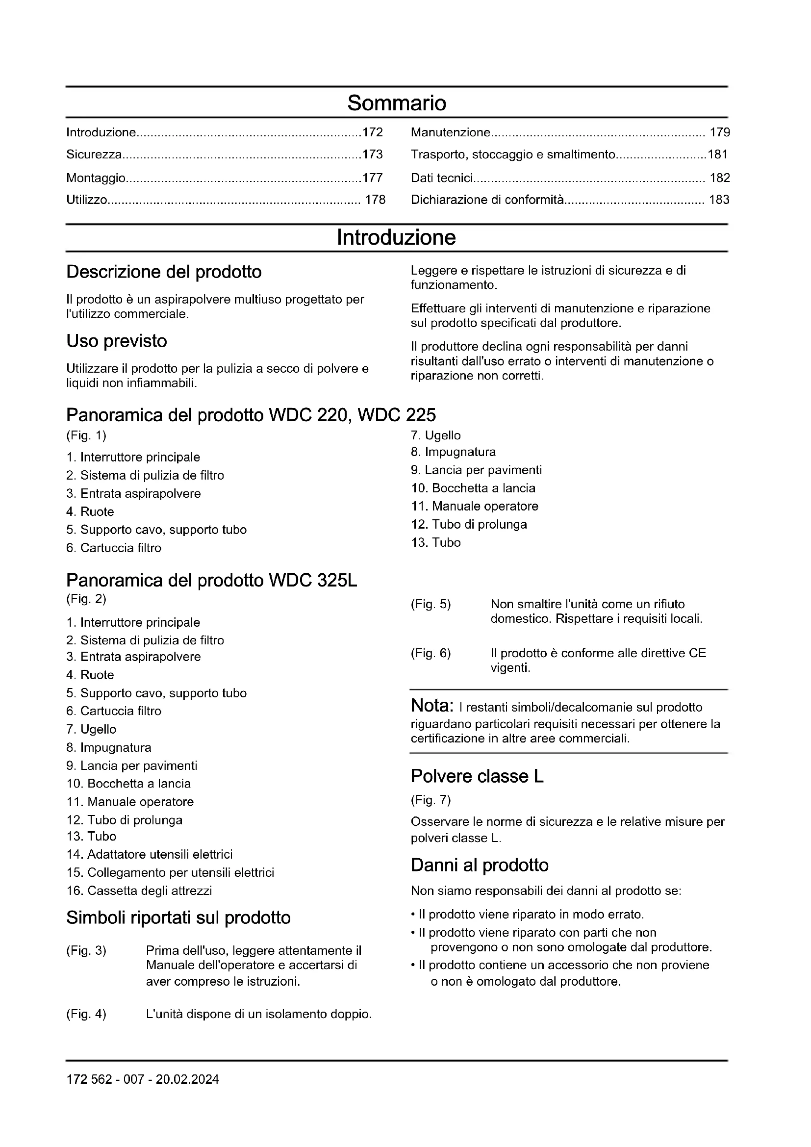 - Dichiarazione di conformità Introduzione Descrizione del prodotto Il prodotto è un aspirapolvere multiuso progettato per l'utilizzo commerciale. Uso previsto Utilizzare il prodotto per la pulizia a secco di polvere e liquidi non infiammabili. Leggere e rispettare le istruzioni di sicurezza e di funzionamento. Effettuare gli interventi di manutenzione e riparazione sul prodotto specificati dal produttore. Il produttore declina ogni responsabilità per danni risultanti dall'uso errato o interventi di manutenzione o riparazione non corretti. Panoramica del prodotto WDC 220, WDC 225 (Fig. 1) p. 183