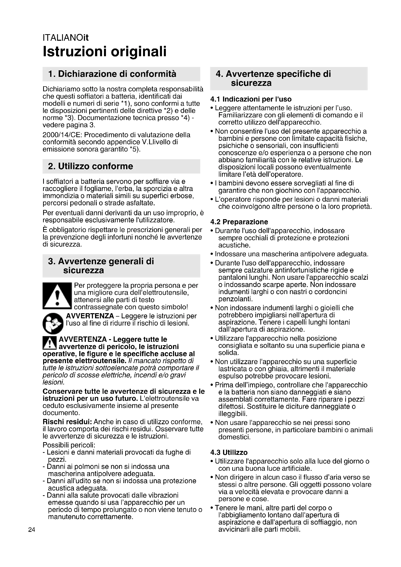 Istruzioni originali Dichiariamo sotto la nostra completa responsabilità che questi soffiatori a batteria, identificati dai modelli e numeri di serie *1), sono conformi a tutte le disposizioni pertinenti delle direttive *2) e delle norme *3). Documentazione tecnica presso *4) - vedere pagina 3. 2000/14/CE: Procedimento di valutazione della conformità secondo appendice V.Llivello di emissione sonora garantito *5). I soffiatori a batteria servono per soffiare via e raccogliere il fogliame, l'erba, la sporcizia e altra immondizia o materiali simili su superfici erbose, percorsi pedonali o strade asfaltate. Per eventuali danni derivanti da un uso improprio, è responsabile esclusivamente l'utilizzatore. È obbligatorio rispettare le prescrizioni generali per la prevenzione degli infortuni nonché le avvertenze di sicurezza. Per proteggere la propria persona e per una migliore cura dell'elettroutensile, attenersi alle parti di testo contrassegnate con questo simbolo! AVVERTENZA – Leggere le istruzioni per l'uso al fine di ridurre il rischio di lesioni. AVVERTENZA - Leggere tutte le avvertenze di pericolo, le istruzioni operative, le figure e le specifiche accluse al presente elettroutensile. Il mancato rispetto di tutte le istruzioni sottoelencate potrà comportare il pericolo di scosse elettriche, incendi e/o gravi lesioni. Conservare tutte le avvertenze di sicurezza e le istruzioni per un uso futuro. L'elettroutensile va ceduto esclusivamente insieme al presente documento. Rischi residui: Anche in caso di utilizzo conforme, il lavoro comporta dei rischi residui. Osservare tutte le avvertenze di sicurezza e le istruzioni. Possibili pericoli: - Lesioni e danni materiali provocati da fughe di pezzi. - Danni ai polmoni se non si indossa una mascherina antipolvere adeguata. - Danni all'udito se non si indossa una protezione acustica adeguata. - Danni alla salute provocati dalle vibrazioni emesse quando si usa l’apparecchio per un periodo di tempo prolungato o non viene tenuto o manutenuto correttamente.