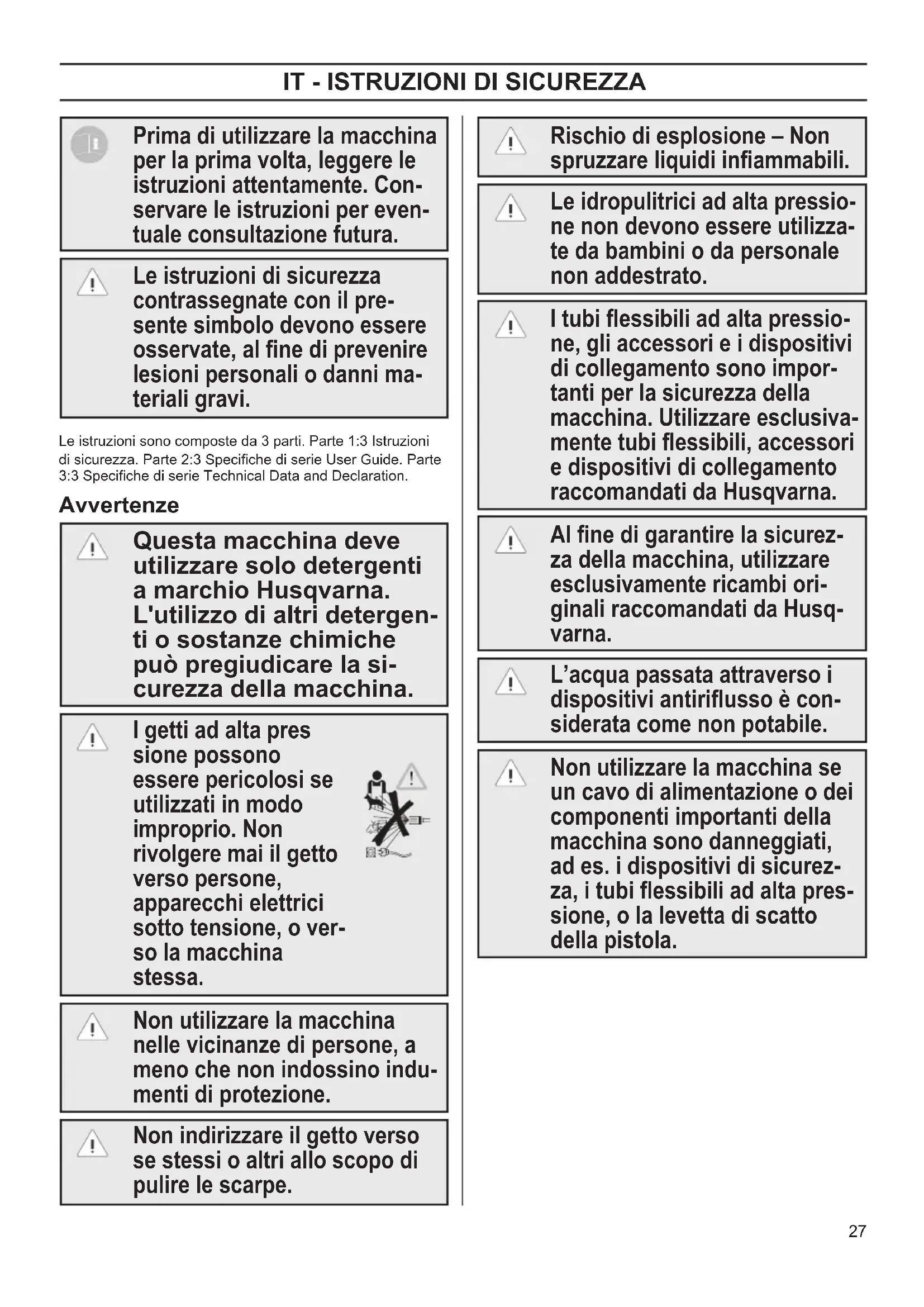 Prima di utilizzare la macchina per la prima volta, leggere le istruzioni attentamente. Con- servare le istruzioni per even- tuale consultazione futura. Le istruzioni di sicurezza contrassegnate con il pre- sente simbolo devono essere osservate, al ne di prevenire lesioni personali o danni ma- teriali gravi. Le istruzioni sono composte da 3 parti. Parte 1:3 Istruzioni di sicurezza. Parte 2:3 Speciche di serie User Guide. Parte 3:3 Speciche di serie Technical Data and Declaration. Avvertenze Questa macchina deve utilizzare solo detergenti a marchio Husqvarna. L'utilizzo di altri detergen- ti o sostanze chimiche può pregiudicare la si- curezza della macchina. I getti ad alta pres sione possono essere pericolosi se utilizzati in modo improprio. Non rivolgere mai il getto verso persone, apparecchi elettrici sotto tensione, o ver- so la macchina stessa. Non utilizzare la macchina nelle vicinanze di persone, a meno che non indossino indu- menti di protezione. Non indirizzare il getto verso se stessi o altri allo scopo di pulire le scarpe. Rischio di esplosione – Non spruzzare liquidi inammabili. Le idropulitrici ad alta pressio- ne non devono essere utilizza- te da bambini o da personale non addestrato. I tubi essibili ad alta pressio- ne, gli accessori e i dispositivi di collegamento sono impor- tanti per la sicurezza della macchina. Utilizzare esclusiva- mente tubi essibili, accessori e dispositivi di collegamento raccomandati da Husqvarna. Al ne di garantire la sicurez- za della macchina, utilizzare esclusivamente ricambi ori- ginali raccomandati da Husq- varna. L’acqua passata attraverso i dispositivi antiriusso è con- siderata come non potabile. Non utilizzare la macchina se un cavo di alimentazione o dei componenti importanti della macchina sono danneggiati, ad es. i dispositivi di sicurez- za, i tubi essibili ad alta pres- sione, o la levetta di scatto della pistola. OM 1-3 Safety FINAL rev 1 draft.indd 27 2017-06-14 13:59:3628