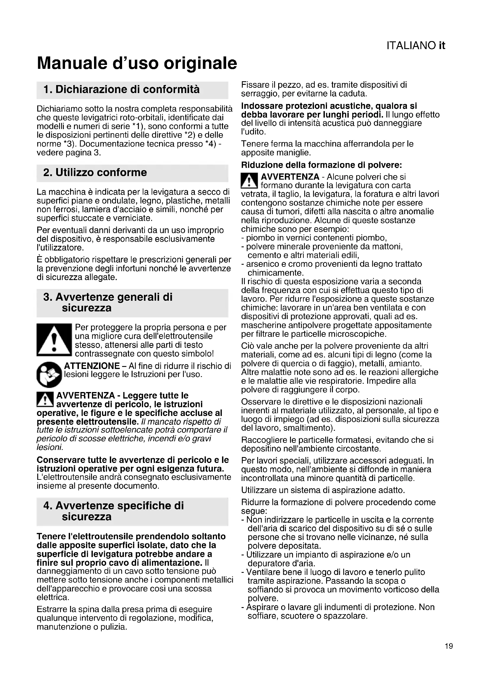 Manuale d’uso originale Dichiariamo sotto la nostra completa responsabilità che queste levigatrici roto-orbitali, identificate dai modelli e numeri di serie *1), sono conformi a tutte le disposizioni pertinenti delle direttive *2) e delle norme *3). Documentazione tecnica presso *4) - vedere pagina 3. La macchina è indicata per la levigatura a secco di superfici piane e ondulate, legno, plastiche, metalli non ferrosi, lamiera d'acciaio e simili, nonché per superfici stuccate e verniciate. Per eventuali danni derivanti da un uso improprio del dispositivo, è responsabile esclusivamente l'utilizzatore. È obbligatorio rispettare le prescrizioni generali per la prevenzione degli infortuni nonché le avvertenze di sicurezza allegate. Per proteggere la propria persona e per una migliore cura dell'elettroutensile stesso, attenersi alle parti di testo contrassegnate con questo simbolo! ATTENZIONE – Al fine di ridurre il rischio di lesioni leggere le Istruzioni per l'uso. AVVERTENZA - Leggere tutte le avvertenze di pericolo, le istruzioni operative, le figure e le specifiche accluse al presente elettroutensile. Il mancato rispetto di tutte le istruzioni sottoelencate potrà comportare il pericolo di scosse elettriche, incendi e/o gravi lesioni. Conservare tutte le avvertenze di pericolo e le istruzioni operative per ogni esigenza futura. L'elettroutensile andrà consegnato esclusivamente insieme al presente documento. Tenere l'elettroutensile prendendolo soltanto dalle apposite superfici isolate, dato che la superficie di levigatura potrebbe andare a finire sul proprio cavo di alimentazione. Il danneggiamento di un cavo sotto tensione può mettere sotto tensione anche i componenti metallici dell'apparecchio e provocare così una scossa elettrica. Estrarre la spina dalla presa prima di eseguire qualunque intervento di regolazione, modifica, manutenzione o pulizia. Fissare il pezzo, ad es. tramite dispositivi di serraggio, per evitarne la caduta. Indossare protezioni acustiche, qualora si debba lavorare per lunghi periodi. Il lungo effetto del livello di intensità acustica può danneggiare l'udito. Tenere ferma la macchina afferrandola per le apposite maniglie. Riduzione della formazione di polvere: AVVERTENZA - Alcune polveri che si formano durante la levigatura con carta vetrata, il taglio, la levigatura, la foratura e altri lavori contengono sostanze chimiche note per essere causa di tumori, difetti alla nascita o altre anomalie nella riproduzione. Alcune di queste sostanze chimiche sono per esempio: - piombo in vernici contenenti piombo, - polvere minerale proveniente da mattoni, cemento e altri materiali edili, - arsenico e cromo provenienti da legno trattato chimicamente. Il rischio di questa esposizione varia a seconda della frequenza con cui si effettua questo tipo di lavoro. Per ridurre l'esposizione a queste sostanze chimiche: lavorare in un'area ben ventilata e con dispositivi di protezione approvati, quali ad es. mascherine antipolvere progettate appositamente per filtrare le particelle microscopiche. Ciò vale anche per la polvere proveniente da altri materiali, come ad es. alcuni tipi di legno (come la polvere di quercia o di faggio), metalli, amianto. Altre malattie note sono ad es. le reazioni allergiche e le malattie alle vie respiratorie. Impedire alla polvere di raggiungere il corpo. Osservare le direttive e le disposizioni nazionali inerenti al materiale utilizzato, al personale, al tipo e luogo di impiego (ad es. disposizioni sulla sicurezza del lavoro, smaltimento). Raccogliere le particelle formatesi, evitando che si depositino nell'ambiente circostante. Per lavori speciali, utilizzare accessori adeguati. In questo modo, nell'ambiente si diffonde in maniera incontrollata una minore quantità di particelle. Utilizzare un sistema di aspirazione adatto. Ridurre la formazione di polvere procedendo come segue: - Non indirizzare le particelle in uscita e la corrente dell'aria di scarico del dispositivo su di sé o sulle persone che si trovano nelle vicinanze, né sulla polvere depositata. - Utilizzare un impianto di aspirazione e/o un depuratore d'aria. - Ventilare bene il luogo di lavoro e tenerlo pulito tramite aspirazione. Passando la scopa o soffiando si provoca un movimento vorticoso della polvere. - Aspirare o lavare gli indumenti di protezione. Non soffiare, scuotere o spazzolare.