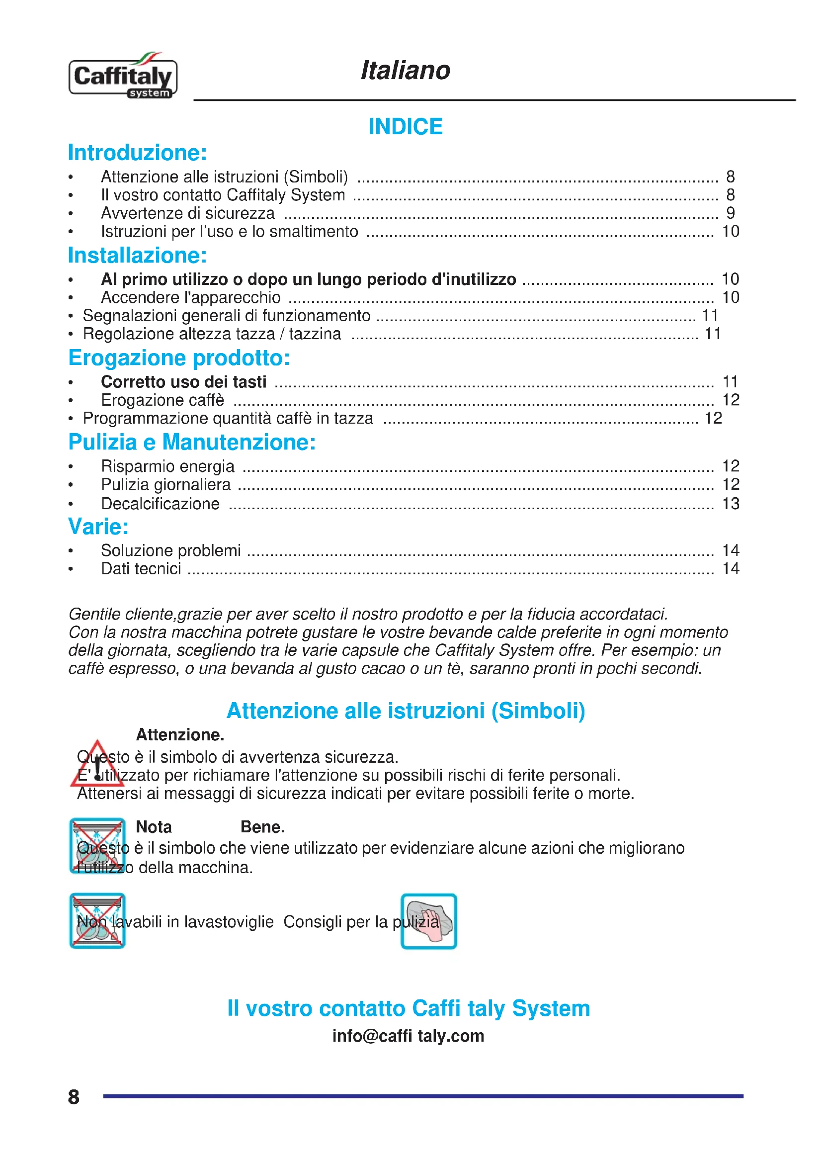 - Dati tecnici ................................................................................................................... 14 Gentile cliente,grazie per aver scelto il nostro prodotto e per la fi ducia accordataci. Con la nostra macchina potrete gustare le vostre bevande calde preferite in ogni momento della giornata, scegliendo tra le varie capsule che Caffi taly System offre. Per esempio: un caffè espresso, o una bevanda al gusto cacao o un tè, saranno pronti in pochi secondi. Attenzione alle istruzioni (Simboli) Attenzione. Questo è il simbolo di avvertenza sicurezza. E' utilizzato per richiamare l'attenzione su possibili rischi di ferite personali. Attenersi ai messaggi di sicurezza indicati per evitare possibili ferite o morte. Nota Bene. Questo è il simbolo che viene utilizzato per evidenziare alcune azioni che migliorano l'utilizzo della macchina. Non lavabili in lavastoviglie Consigli per la pulizia Il vostro contatto Caffi taly System info@caffi taly.com Italiano9 Italiano Avvertenze di sicurezza Leggere con ATTENZIONE le seguenti istruzioni! Eviterete cosi' i rischi di infortuni e danni all'apparecchio.