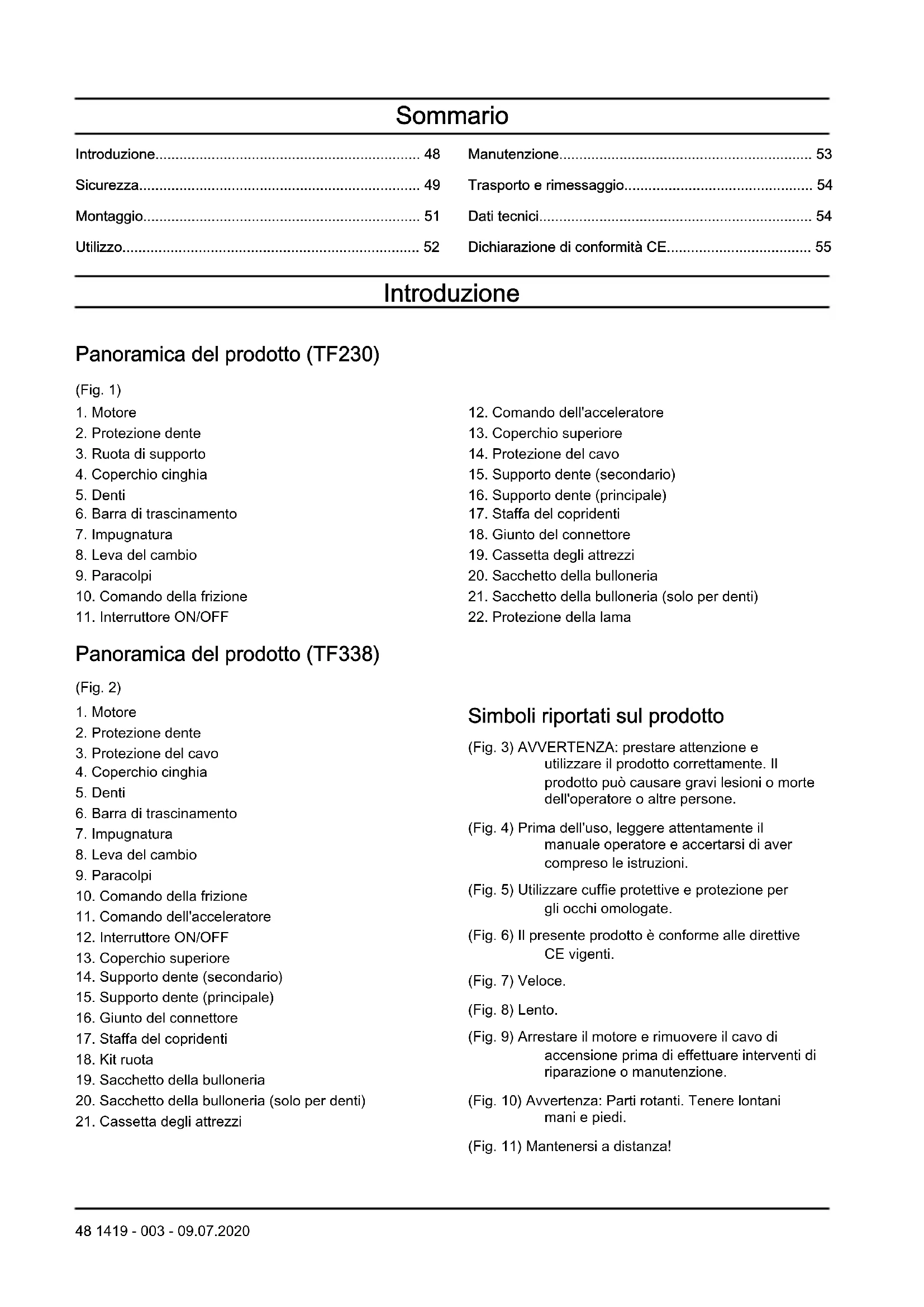 54 1419 - 003 - 09.07.2020TF230 TF338 Potenza massima KW/hp @ rpm 3,45/4,7 @ 3100 3,6/4,9 @ 3100 Ingranaggi R, N, 2, 1 R, N, 2, 1 Capacità dell'olio del cambio, litri 0,95 1,1 Peso lordo, kg 86,5 106 Peso netto, kg 66,5 93 Dimensioni contenitore, mm 845x480x780 860x490x860 Livello acustico, garantito L