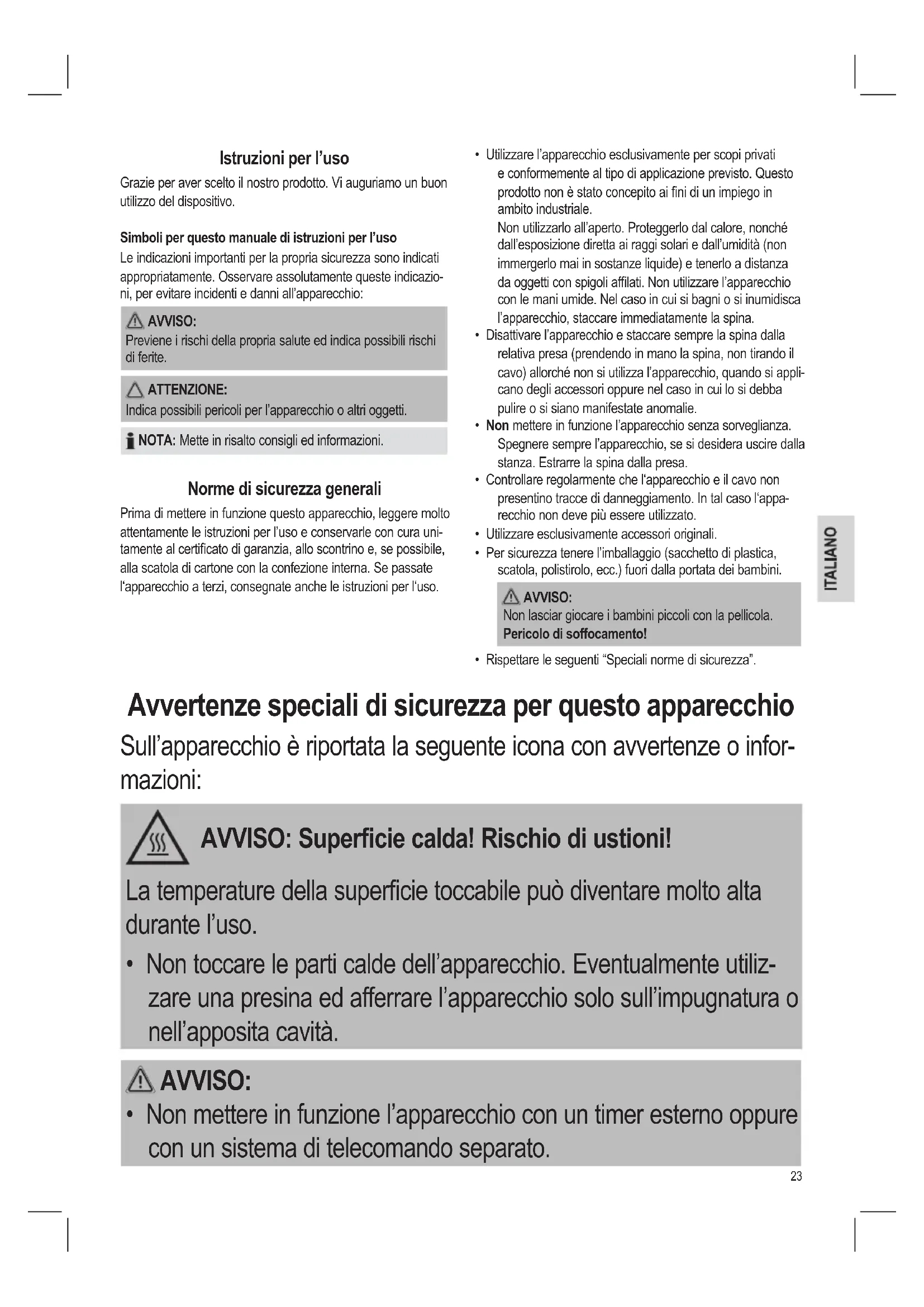 - Non mettere in funzione l’apparecchio con un timer esterno oppure con un sistema di telecomando separato.24 AVVISO:
