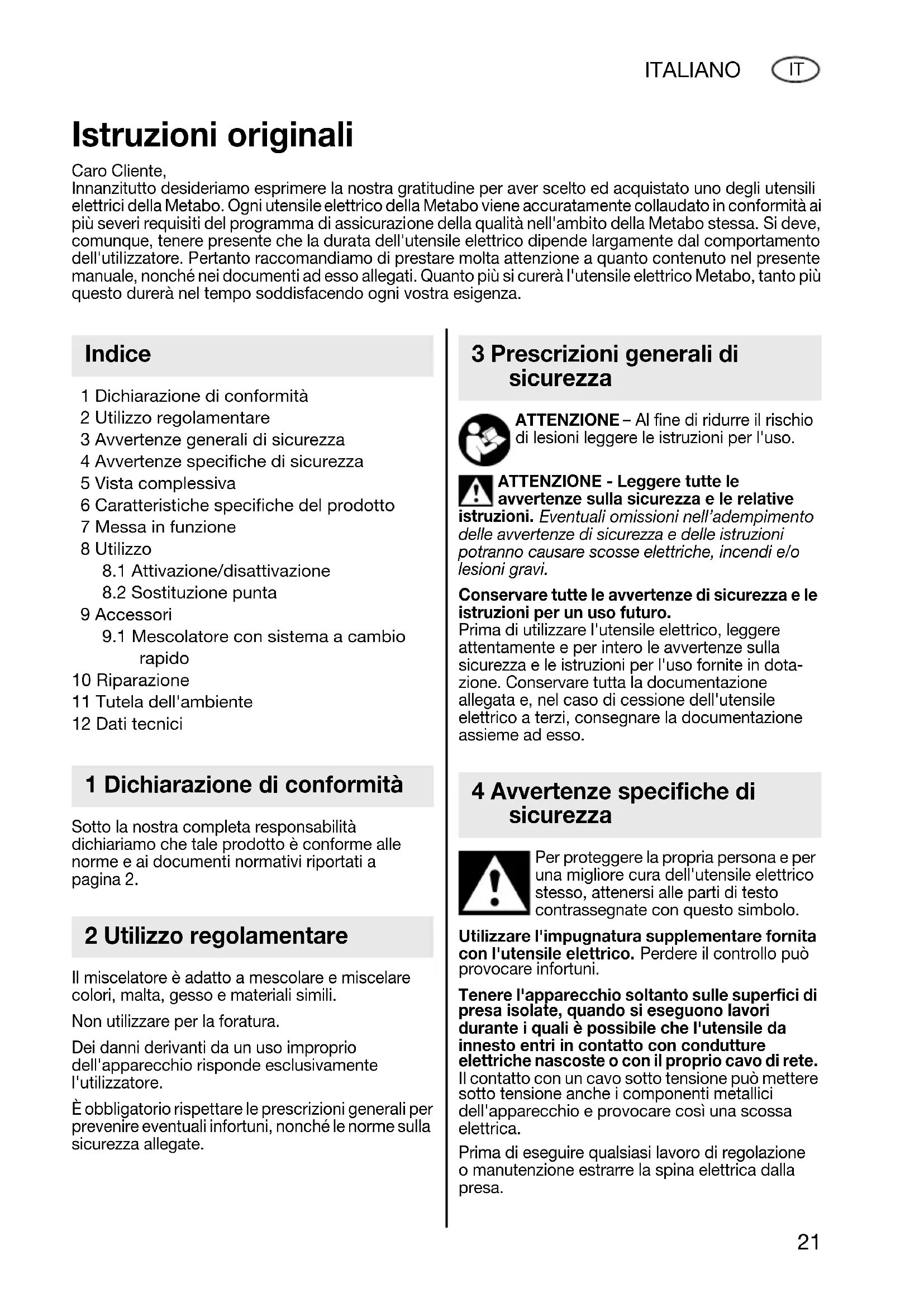 rapido 10 Riparazione 11 Tutela dell'ambiente 12 Dati tecnici Sotto la nostra completa responsabilità dichiariamo che tale prodotto è conforme alle norme e ai documenti normativi riportati a pagina 2. Il miscelatore è adatto a mescolare e miscelare colori, malta, gesso e materiali simili. Non utilizzare per la foratura. Dei danni derivanti da un uso improprio dell'apparecchio risponde esclusivamente l'utilizzatore. È obbligatorio rispettare le prescrizioni generali per prevenire eventuali infortuni, nonché le norme sulla sicurezza allegate. ATTENZIONE – Al fine di ridurre il rischio di lesioni leggere le istruzioni per l'uso. ATTENZIONE - Leggere tutte le avvertenze sulla sicurezza e le relative istruzioni. Eventuali omissioni nell’adempimento delle avvertenze di sicurezza e delle istruzioni potranno causare scosse elettriche, incendi e/o lesioni gravi. Conservare tutte le avvertenze di sicurezza e le istruzioni per un uso futuro. Prima di utilizzare l'utensile elettrico, leggere attentamente e per intero le avvertenze sulla sicurezza e le istruzioni per l'uso fornite in dota- zione. Conservare tutta la documentazione allegata e, nel caso di cessione dell'utensile elettrico a terzi, consegnare la documentazione assieme ad esso. Per proteggere la propria persona e per una migliore cura dell'utensile elettrico stesso, attenersi alle parti di testo contrassegnate con questo simbolo. Utilizzare l'impugnatura supplementare fornita con l'utensile elettrico. Perdere il controllo può provocare infortuni. Tenere l'apparecchio soltanto sulle superfici di presa isolate, quando si eseguono lavori durante i quali è possibile che l'utensile da innesto entri in contatto con condutture elettriche nascoste o con il proprio cavo di rete. Il contatto con un cavo sotto tensione può mettere sotto tensione anche i componenti metallici dell'apparecchio e provocare così una scossa elettrica. Prima di eseguire qualsiasi lavoro di regolazione o manutenzione estrarre la spina elettrica dalla presa. Istruzioni originali Caro Cliente, Innanzitutto desideriamo esprimere la nostra gratitudine per aver scelto ed acquistato uno degli utensili elettrici della Metabo. Ogni utensile elettrico della Metabo viene accuratamente collaudato in conformità ai più severi requisiti del programma di assicurazione della qualità nell'ambito della Metabo stessa. Si deve, comunque, tenere presente che la durata dell'utensile elettrico dipende largamente dal comportamento dell'utilizzatore. Pertanto raccomandiamo di prestare molta attenzione a quanto contenuto nel presente manuale, nonché nei documenti ad esso allegati. Quanto più si curerà l'utensile elettrico Metabo, tanto più questo durerà nel tempo soddisfacendo ogni vostra esigenza. Indice 1 Dichiarazione di conformità 2 Utilizzo regolamentare 3 Prescrizioni generali di sicurezza 4 Avvertenze specifiche di sicurezza 17026753_0513 RWE 1100.book Seite 21 Dienstag, 7. Mai 2013 10:49 1022 ITALIANO